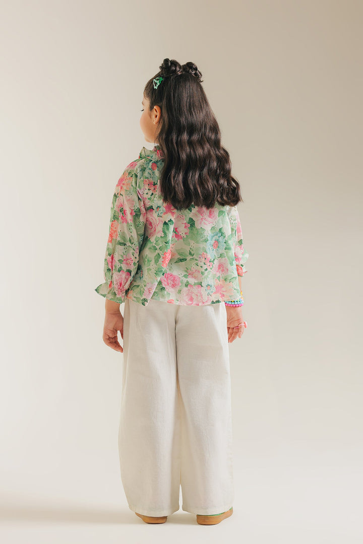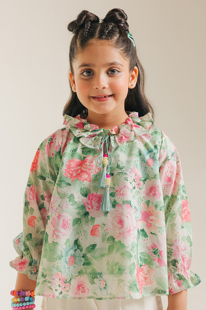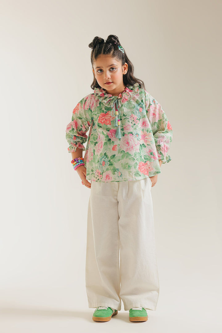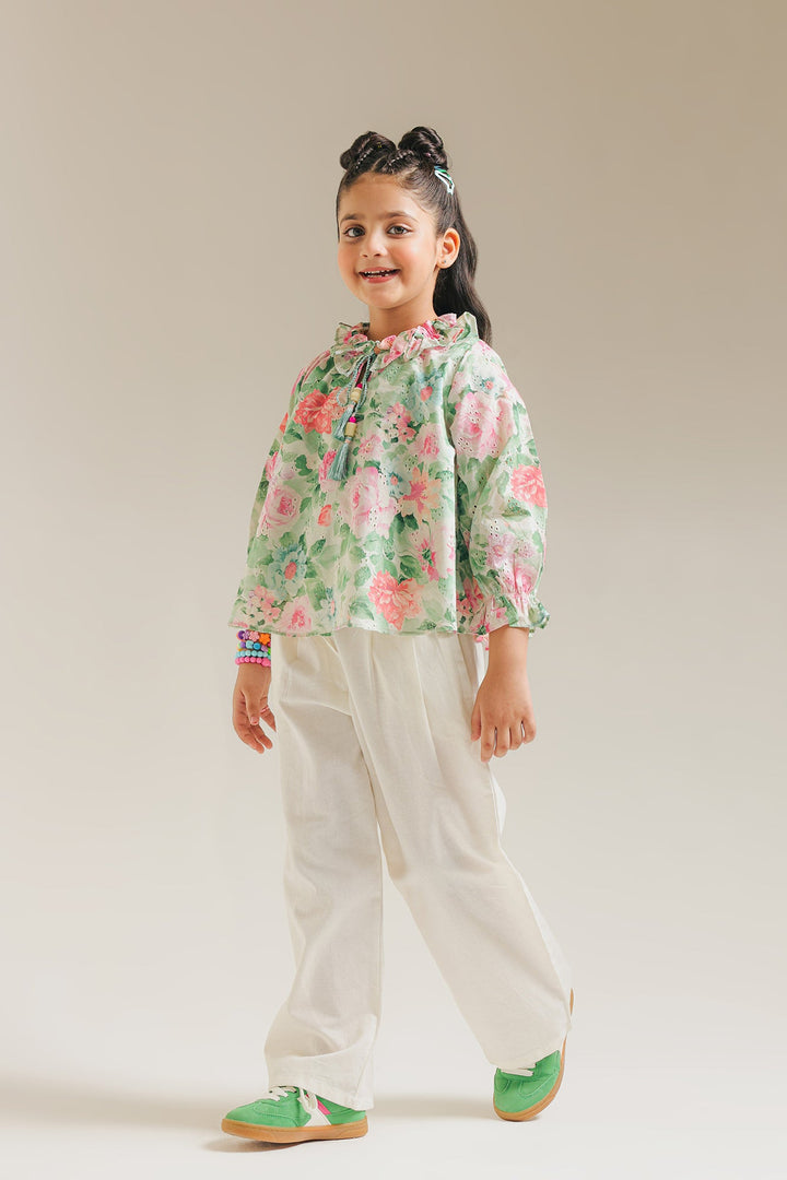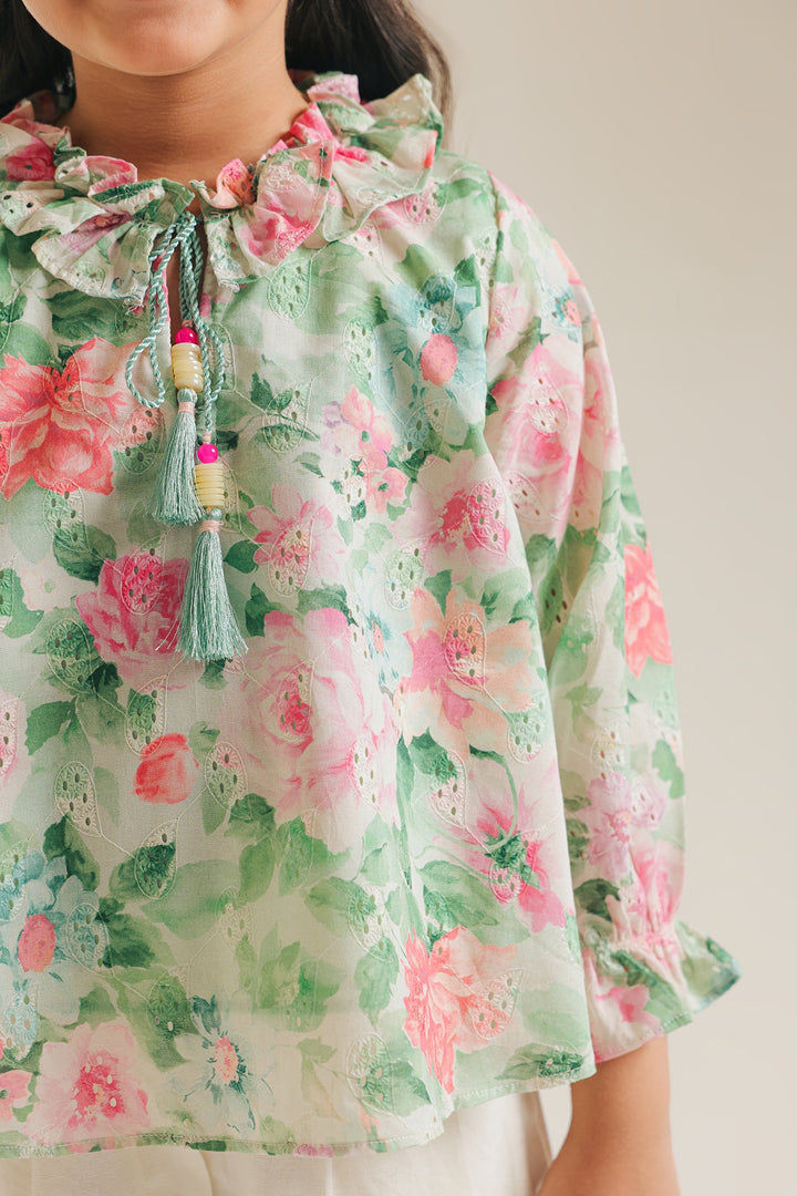 Imagine strolling through a sun-drenched meadow in our enchanting meadow floral printed blouse with schiffli embroidery. This captivating top is adorned with a soft, romantic floral print that whispers of spring. The elegant ruffled collar, complete with a dainty tassel detail, and the gently ruffled sleeves add a touch of timeless charm. Light, airy, and utterly delightful, this shirt is designed for making joyful memories wherever she goes.