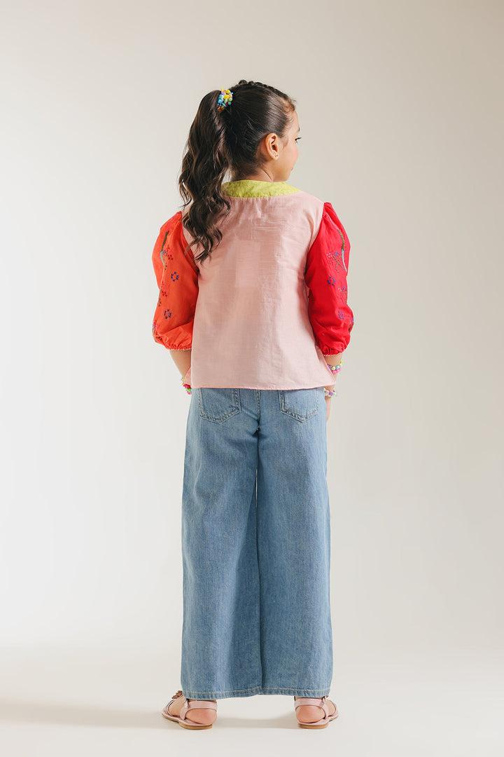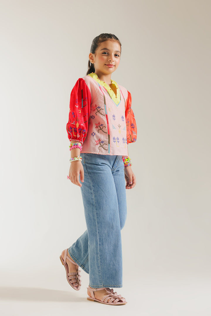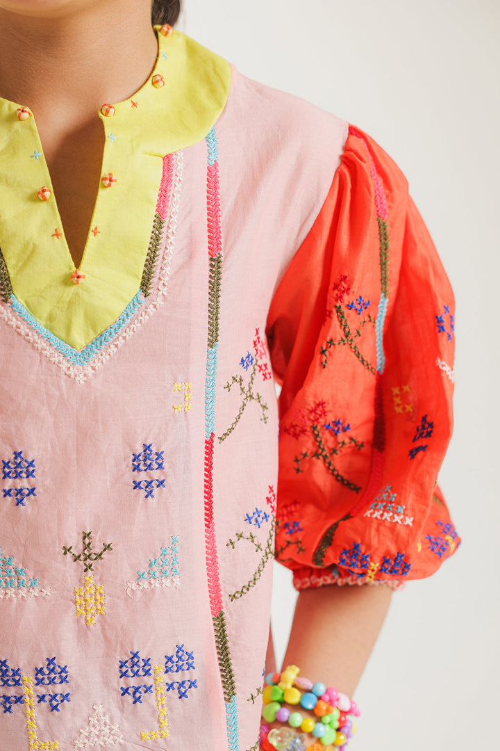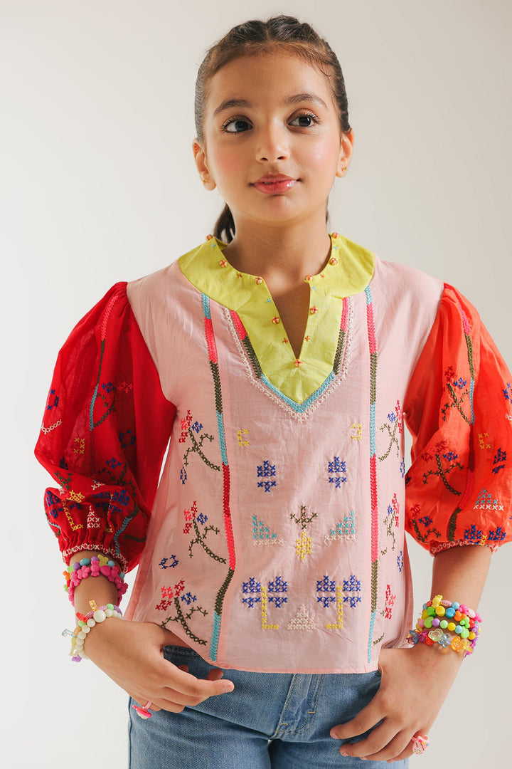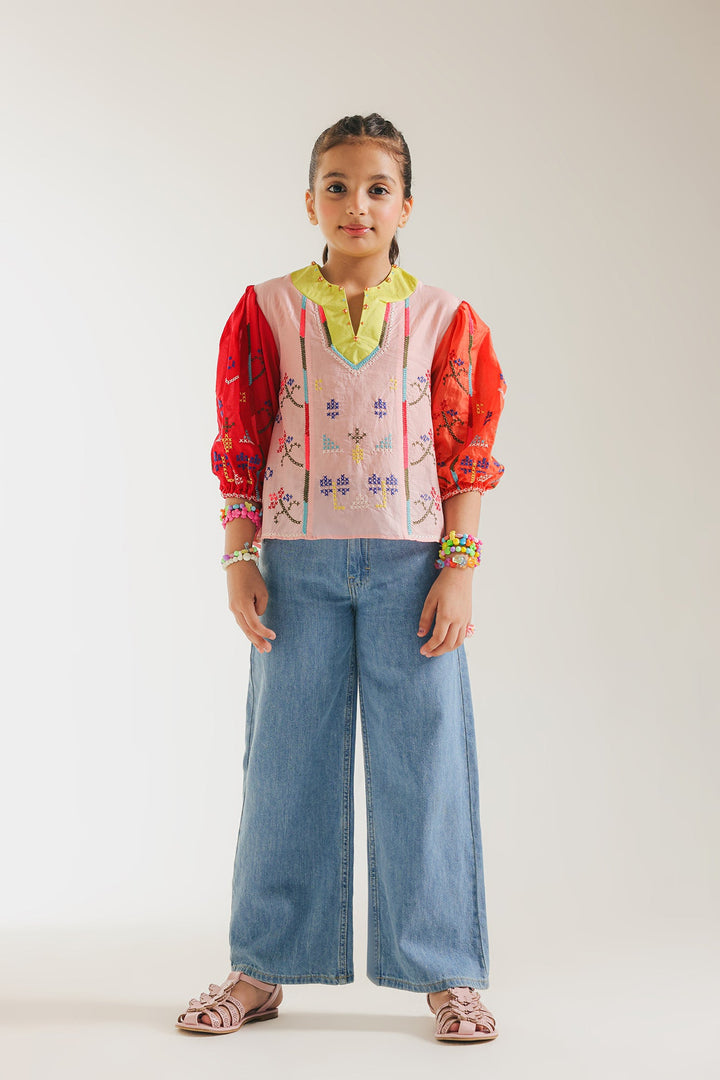 Embrace a vibrant and eclectic style with this eye-catching top for kids! The design features a unique combination of colors and patterns, with a light pink bodice adorned with colorful embroidered details. The contrasting red sleeves add a bold pop of color and have a slightly puffed, voluminous shape. Playful bright yellow trims highlight the neckline, adding to the top's unique charm. Exuding a bohemian-inspired flair, this piece is perfect for adding a touch of individuality and artistic flair to any outfit. Pair it with jeans, skirts, or shorts for a fun and stylish look.