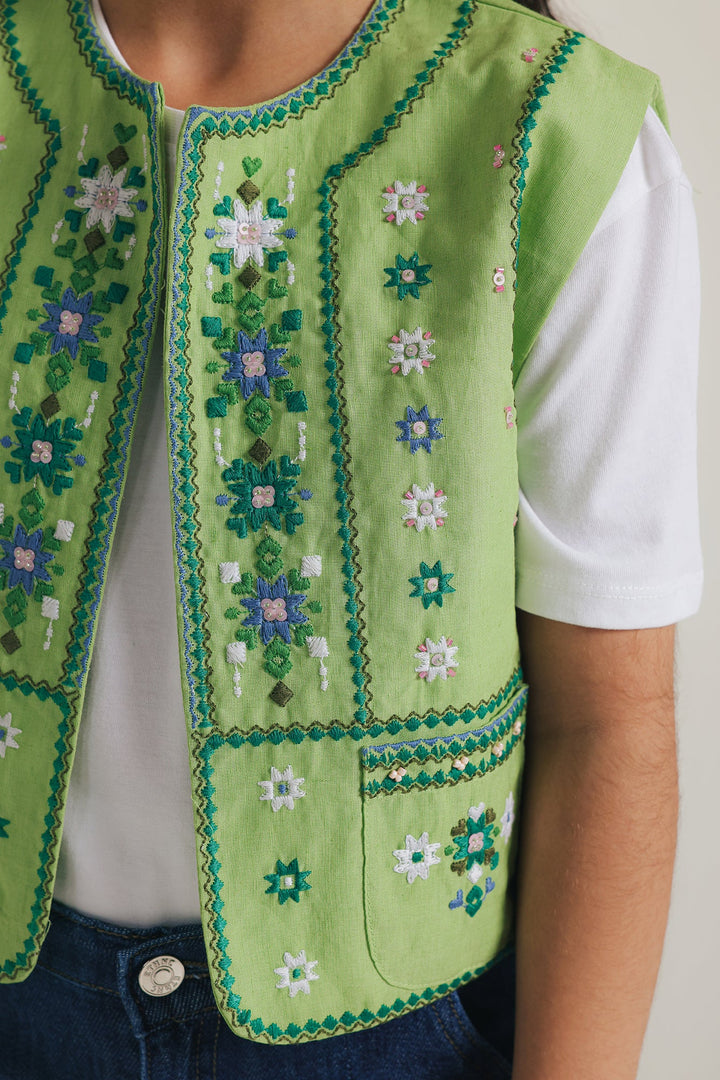Discover sophistication and boldness with this trendy waistcoat rendered in Apple Green shade. This elegant front open waistcoat is perfect for fun parties. The modern silhouette is intricately enriched with vibrant floral patterns, making it the ideal choice for any occasion. Elevate your style all season long with this must-have waistcoat.