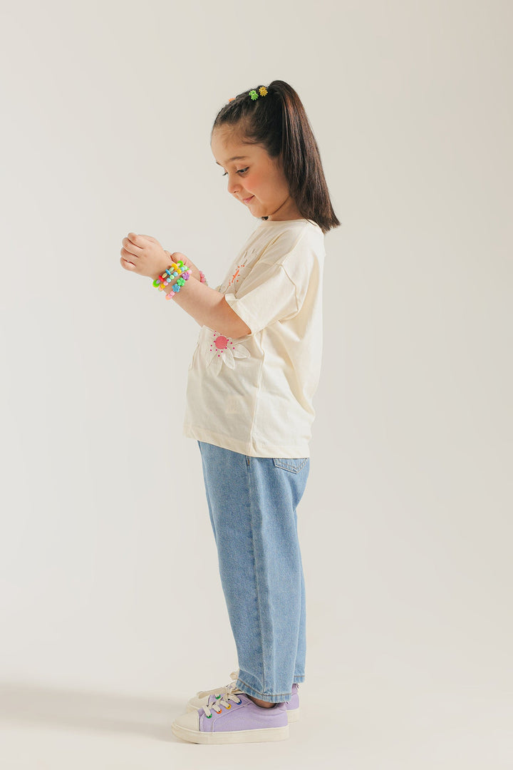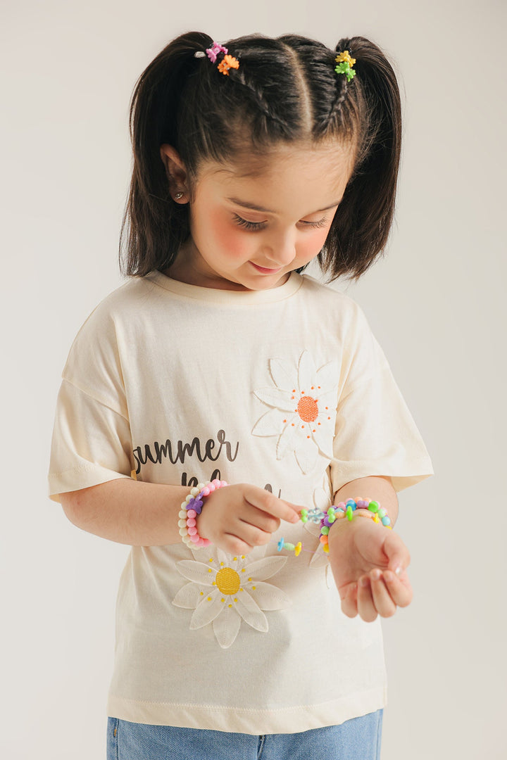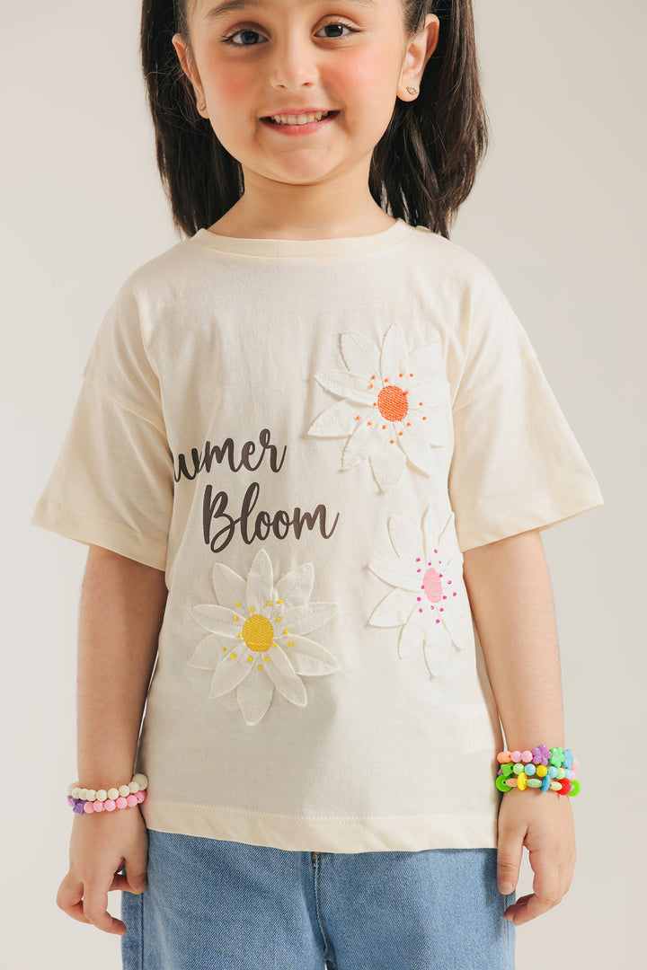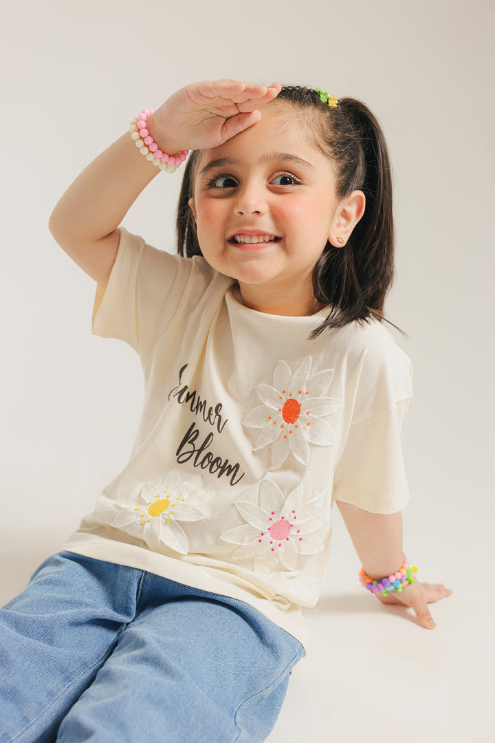 Bring a touch of playful joy to her wardrobe with this charming top. This soft, off-white t-shirt features the words "Summer Bloom" and three delightful appliqued flowers in vibrant colors. With its comfortable fit and cheerful design, this top is the perfect piece for her to wear on a sunny day.
