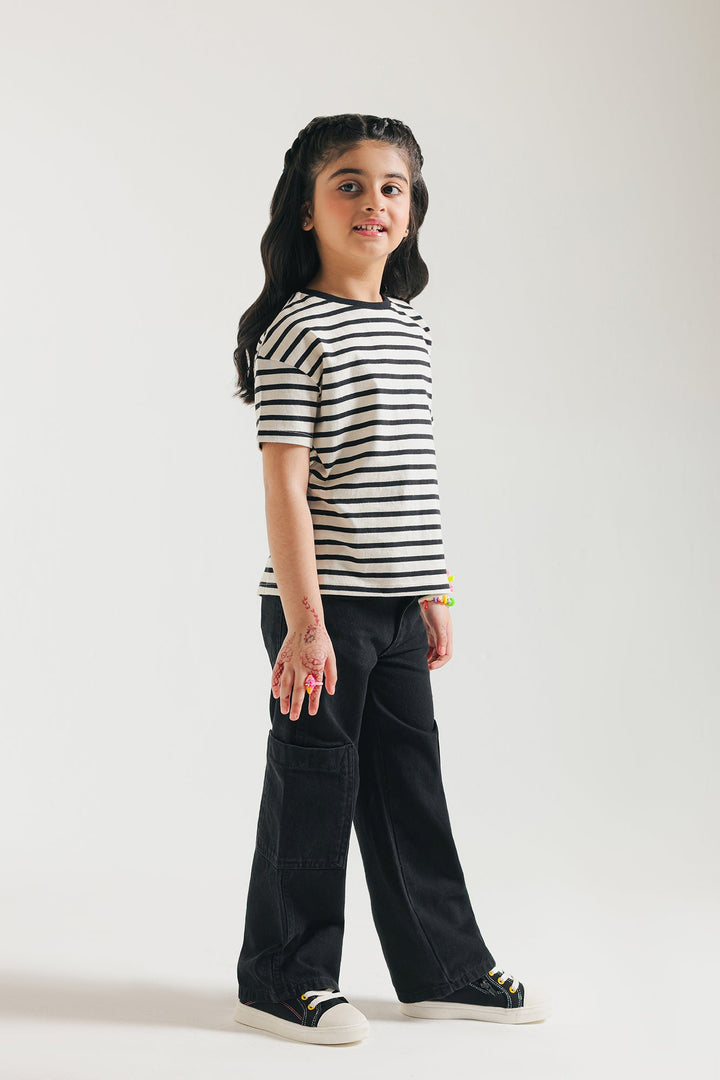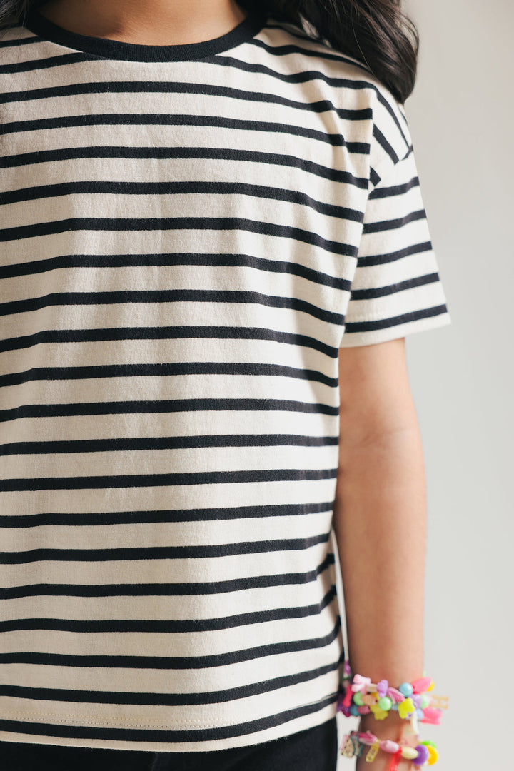 Introduce a touch of sophistication and class to your girl's wardrobe with this elegant top. The light off white color is beautifully contrasted with stunning stripes in contrasted black tones, making this top the perfect choice for any occasion. Crafted for both quality and comfort, this monochromatic top effortlessly elevates any outfit.