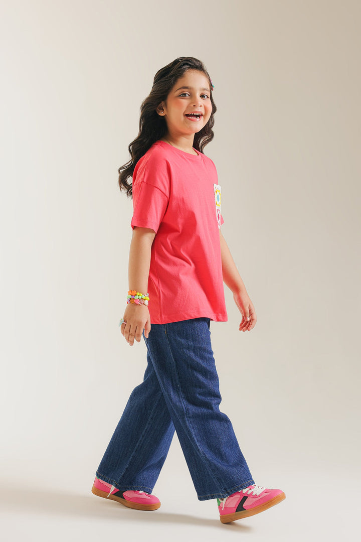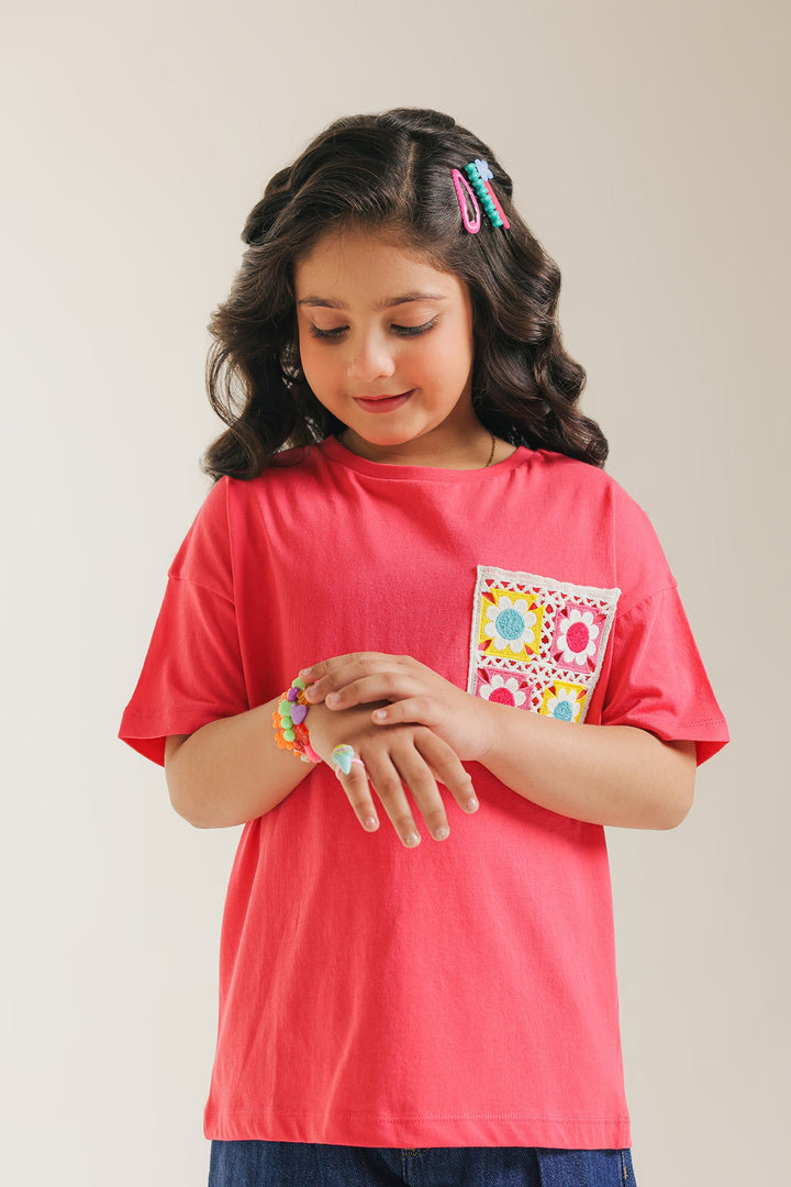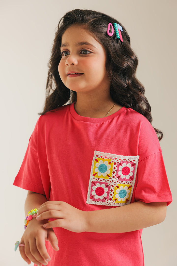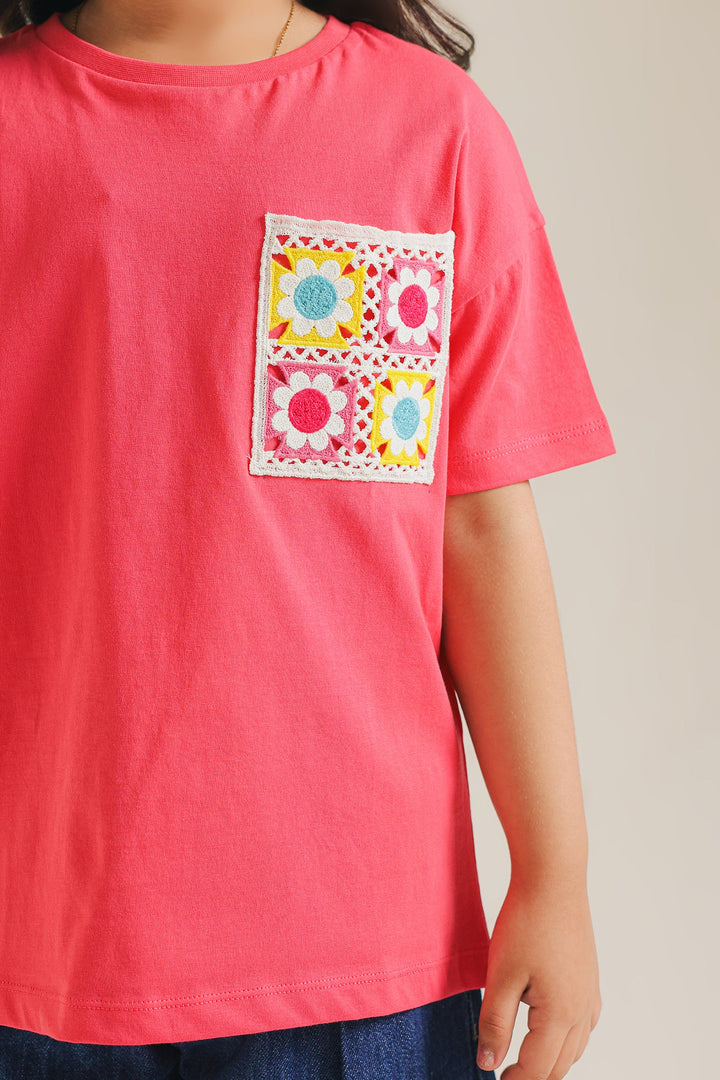 Add a playful pop to her everyday style with our vibrant pink tee with patterned pocket! This cheerful, comfortable t-shirt comes in a lively shade of pink and features a unique, colorful patch pocket adorned with a delightful floral-inspired pattern. The relaxed fit and soft fabric make it perfect for all her adventures, ensuring she stays comfy and stylish. An easy-to-wear piece that brings a smile to any casual outfit!
