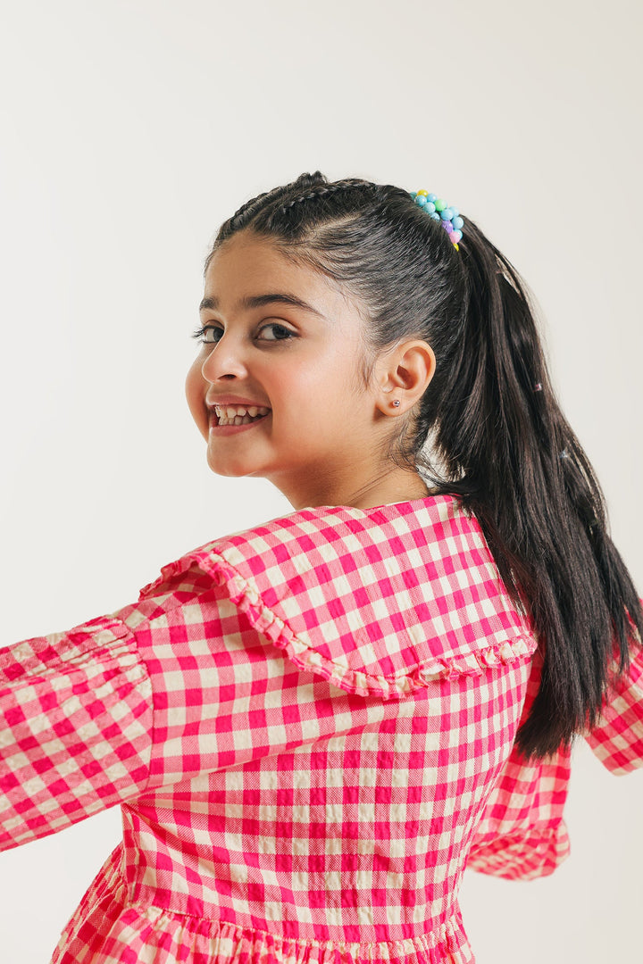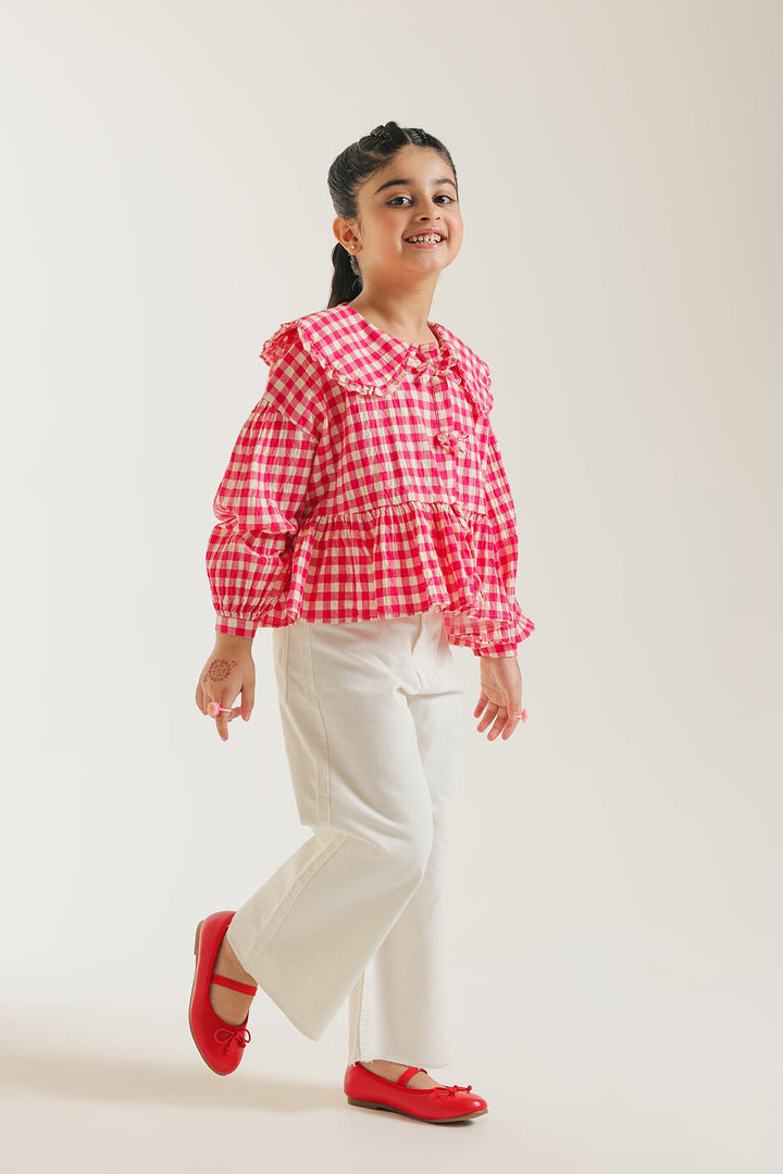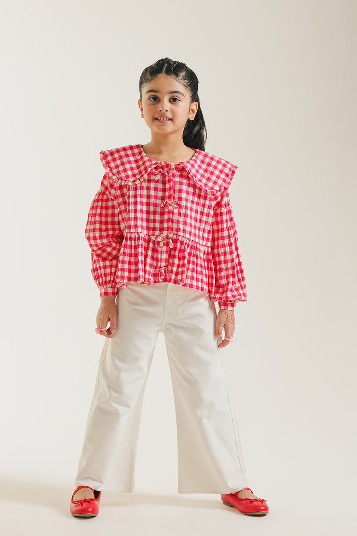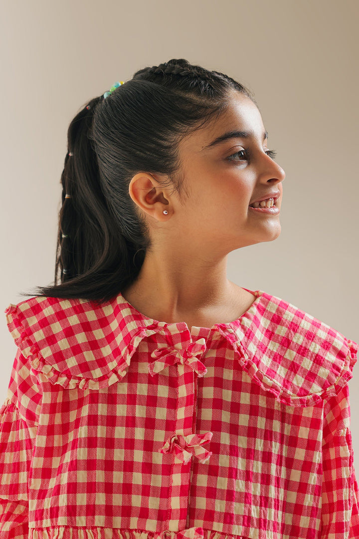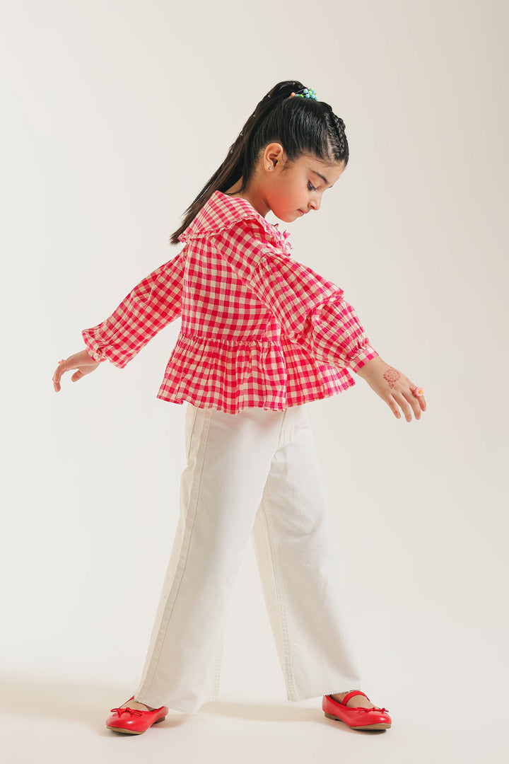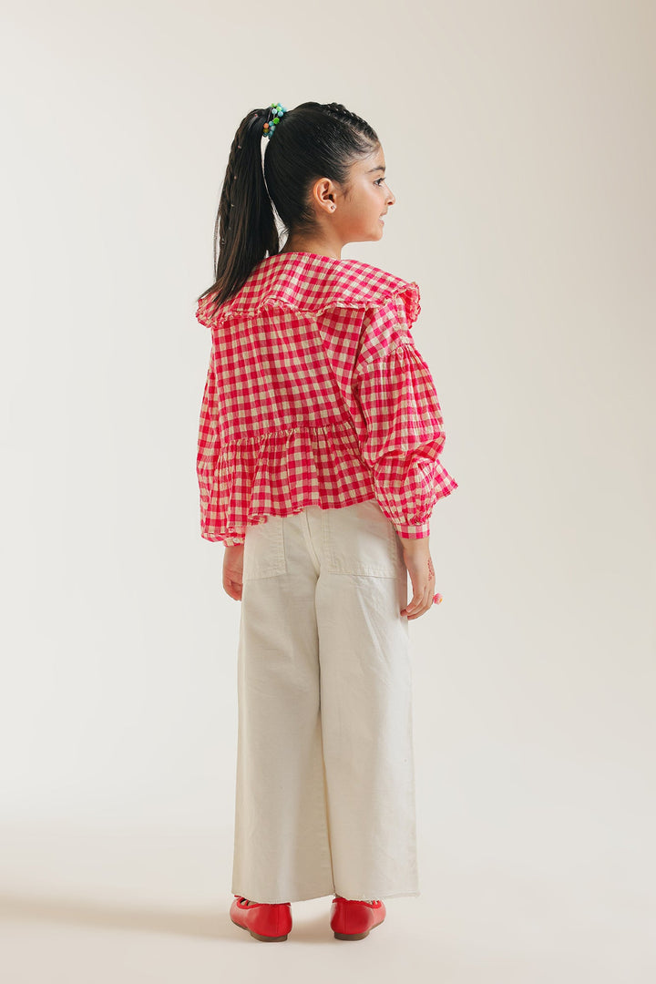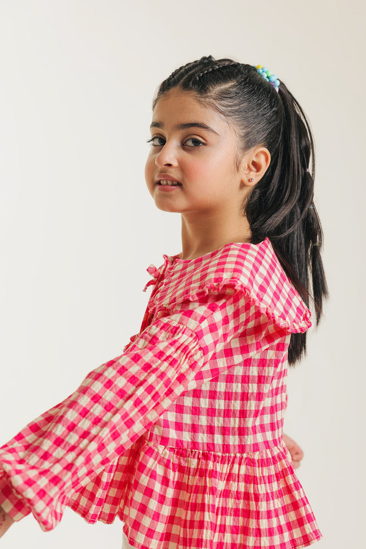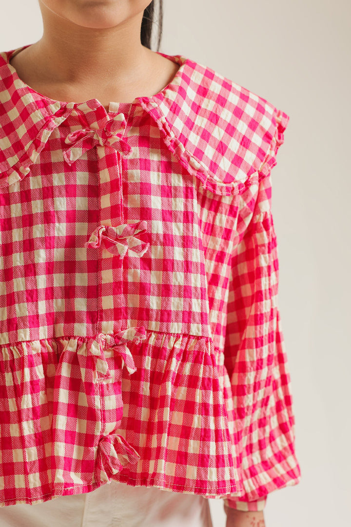 Bring a delightful touch of classic charm to her wardrobe with our red gingham top! This adorable shirt features a vibrant red and white checkered pattern, perfectly complemented by an oversized, sweet ruffled peter pan collar. The gathered bodice and full sleeves create a comfortable yet stylish silhouette, making it an ideal choice for playful days, family gatherings, or adding a touch of vintage-inspired fun to any outfit.