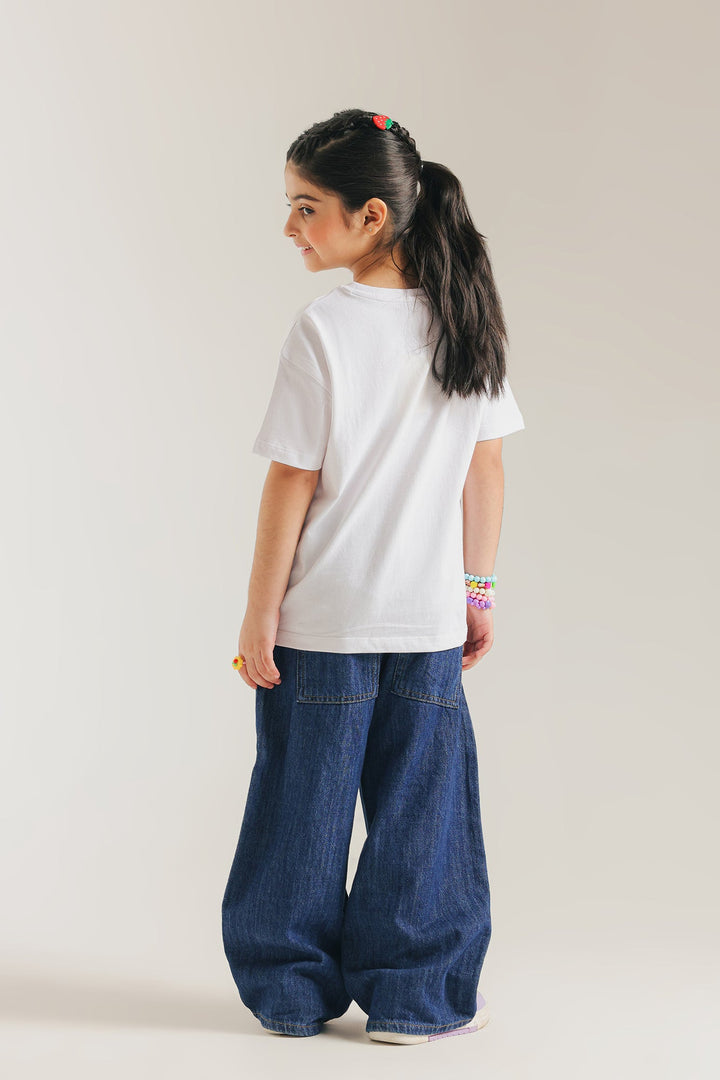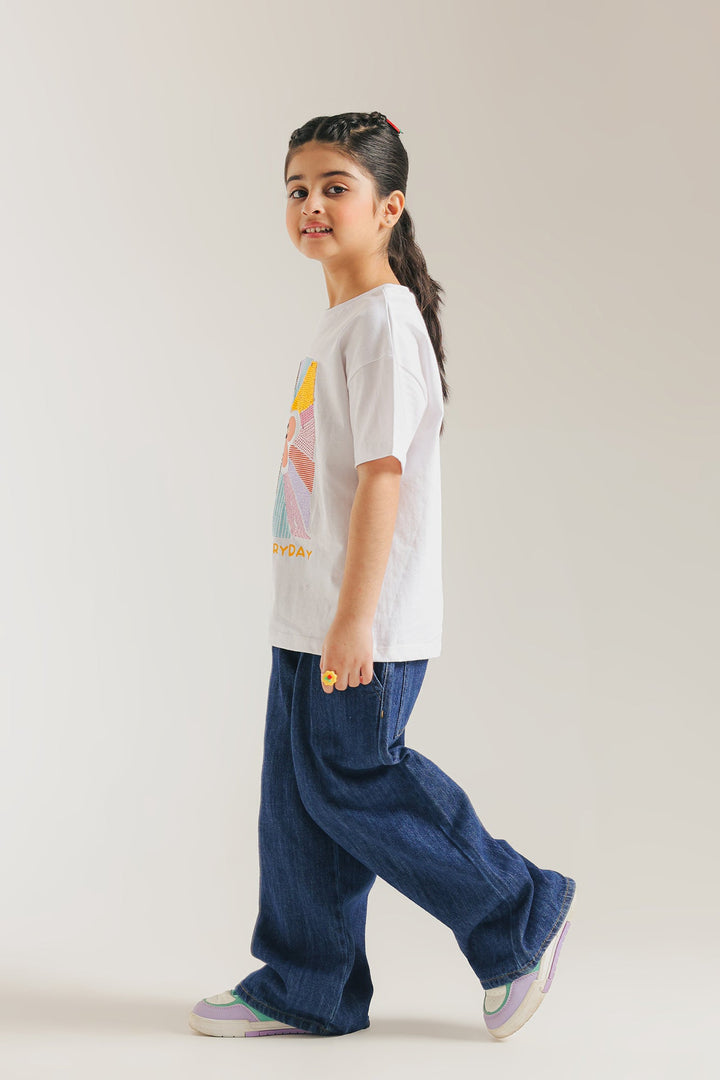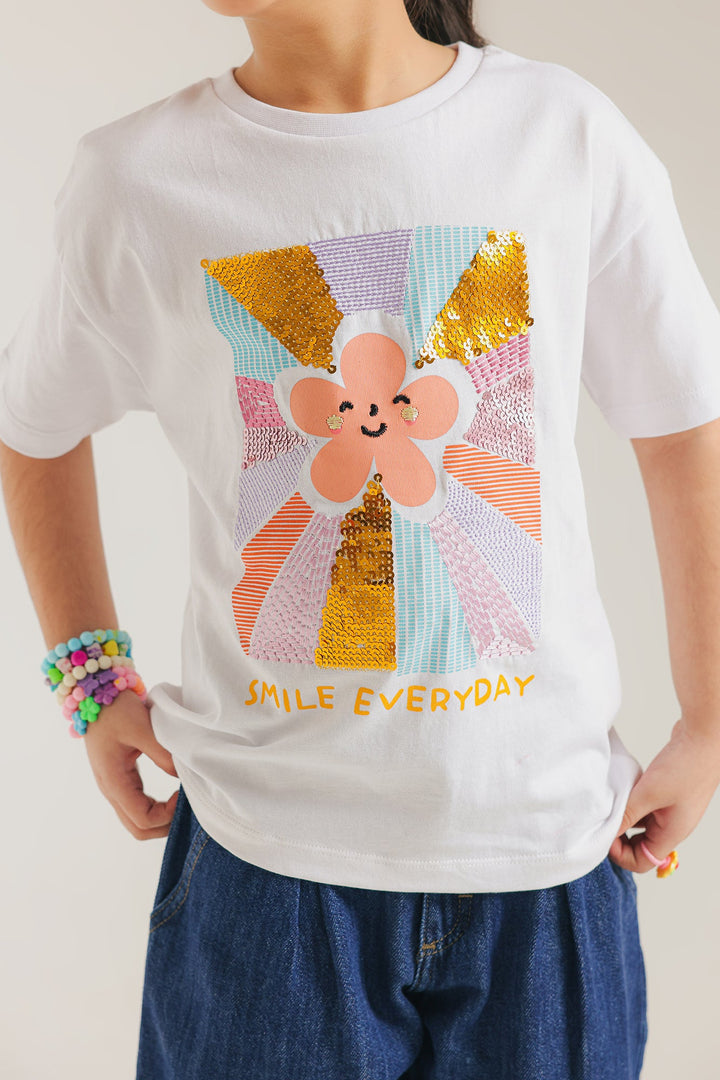 This cheerful white top is designed to brighten up any day. The relaxed, short-sleeved t-shirt features a bold and playful graphic of a smiling flower with a shimmering, multicolored background. The design incorporates a mix of textures and patterns, including stripes and checks, and is finished with the uplifting message "SMILE EVERYDAY" printed below. It's a comfortable and fun staple for any casual wardrobe.