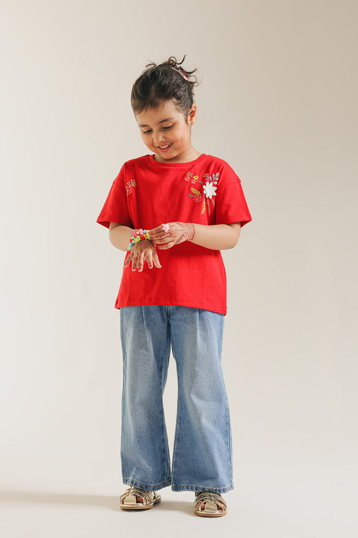 Bring a pop of vibrant color and playful charm to her everyday with our delightful red embroidered tee! This cheerful red t-shirt features a whimsical assortment of colorful embroidery, including delicate flowers, creating a charming and unique look. Crafted from soft, breathable fabric, its comfortable relaxed fit makes it perfect for all her adventures, ensuring she stays comfy and stylish while spreading smiles.