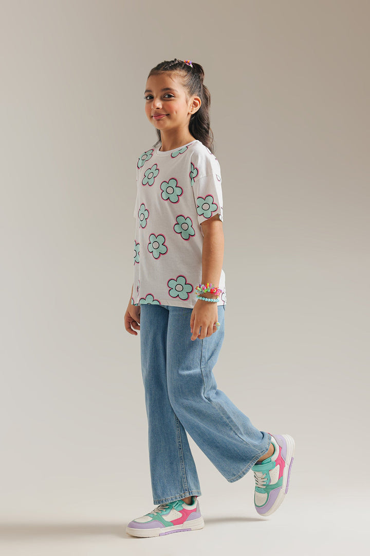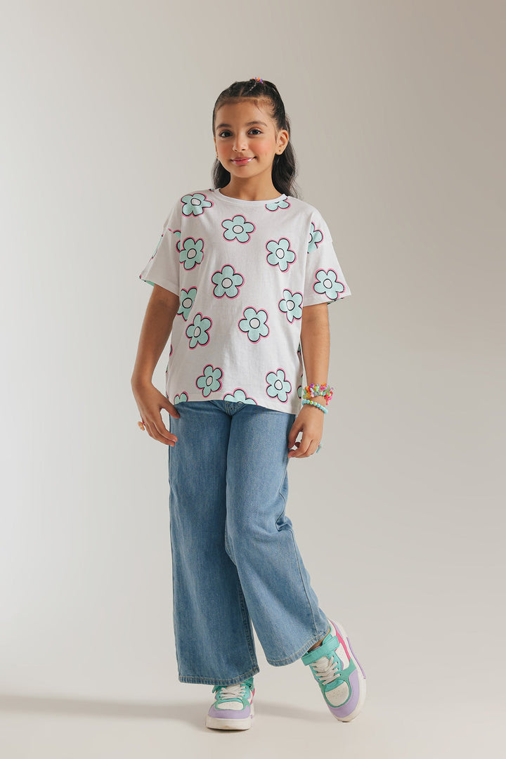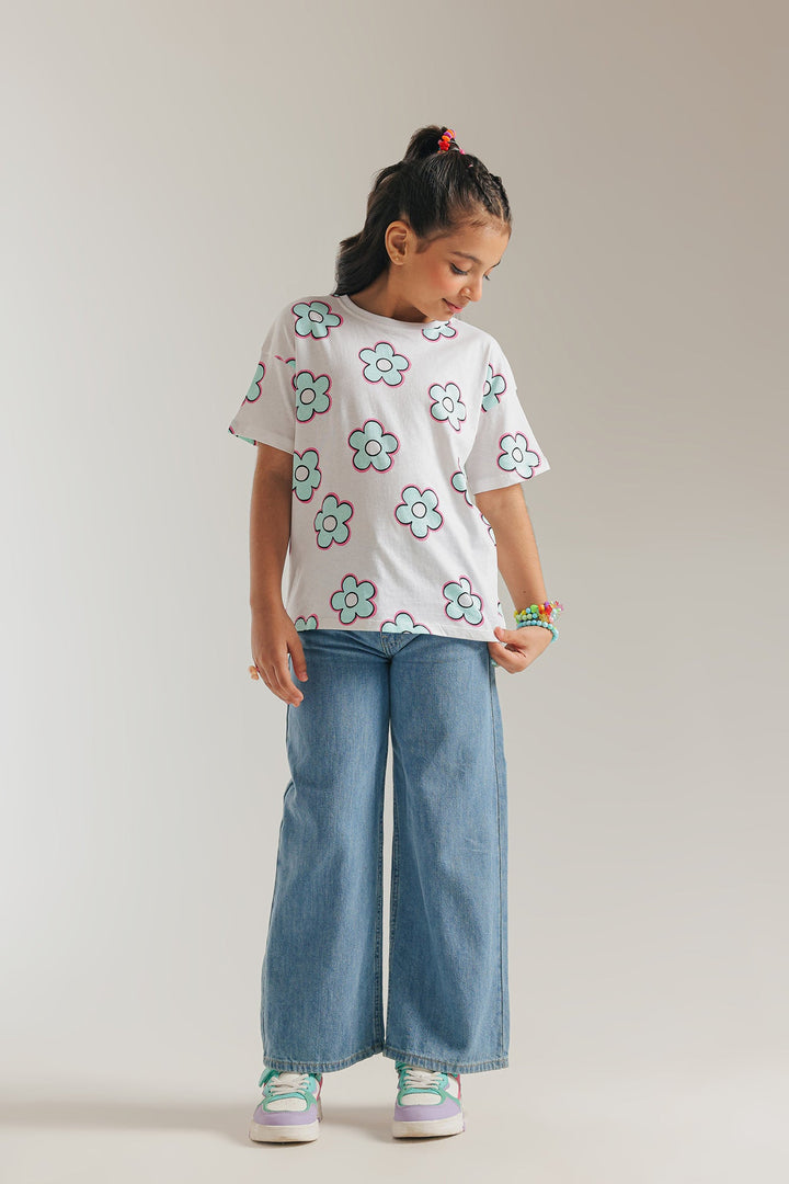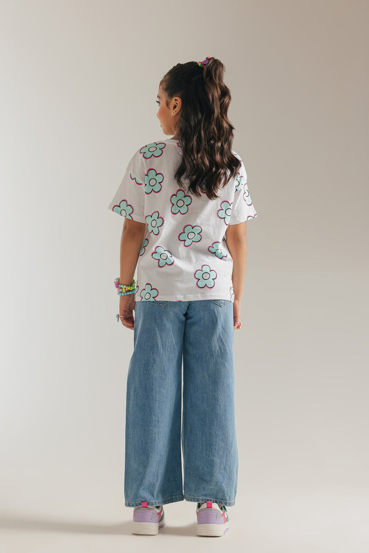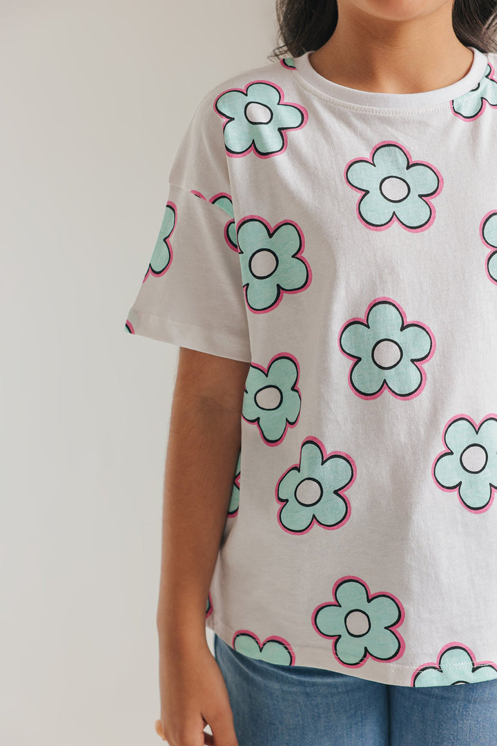 Add a touch of cheerful whimsy to her everyday style with this adorable white T-shirt! This comfortable tee features a fun all-over print of stylized flowers in soft aqua blue with green outlines, creating a light and playful design that resembles cheerful clouds. Crafted from soft, breathable fabric in a relaxed short-sleeve fit, it's perfect for her casual adventures, playdates, or simply adding a sweet and vibrant touch to her look.