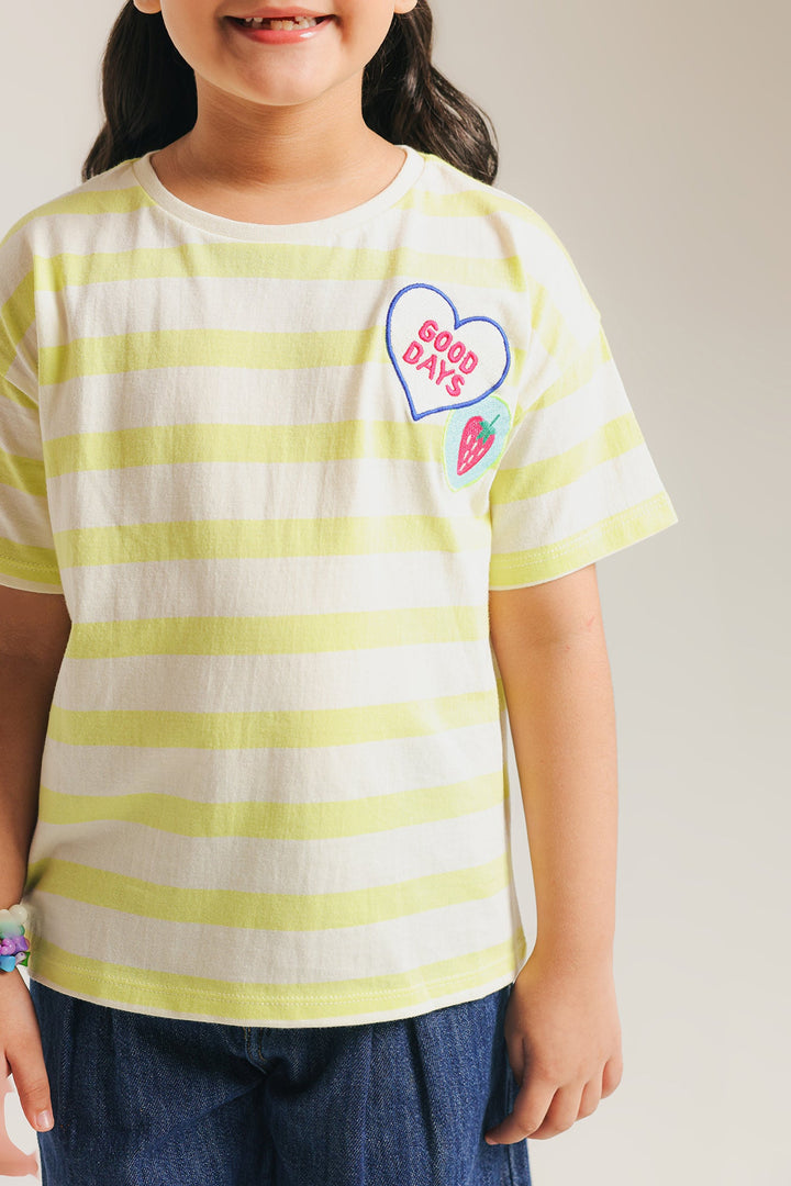 Brighten up her day with this sunny striped T-shirt! Featuring a cheerful yellow and white pattern, this top is perfect for adding a pop of color to any wardrobe. A fun, embroidered heart with the phrase "Good Days" adds a touch of playful charm, making it an ideal choice for school, playdates, or weekend adventures. Made from soft, breathable fabric, it's designed for all-day comfort and effortless style.