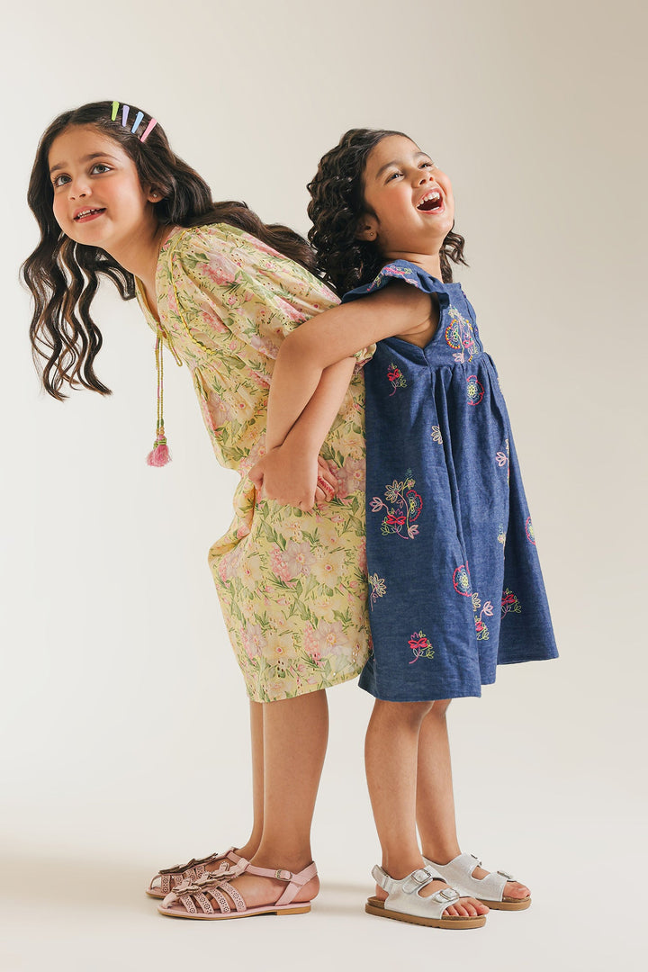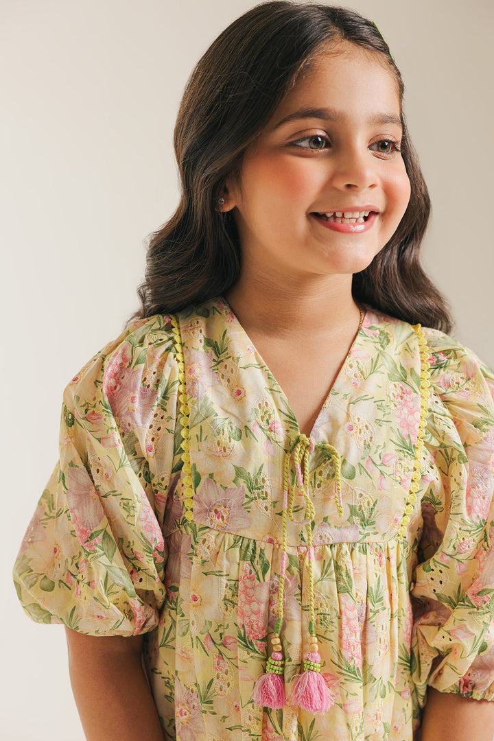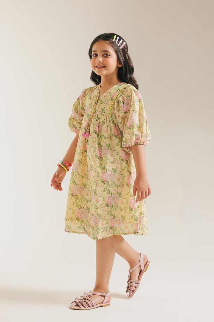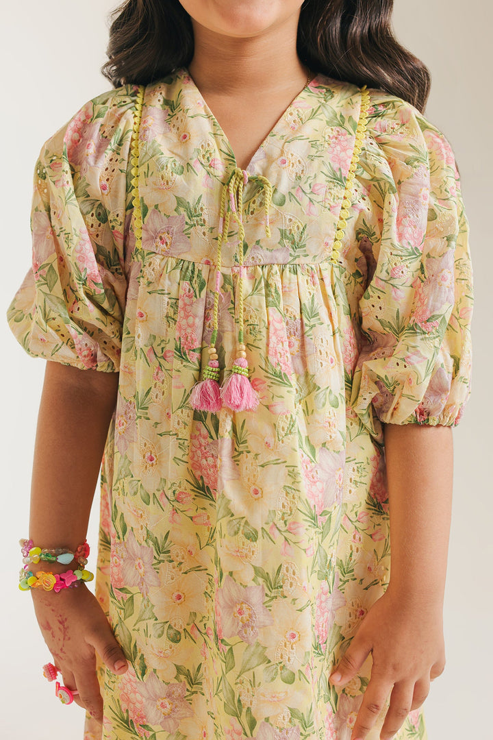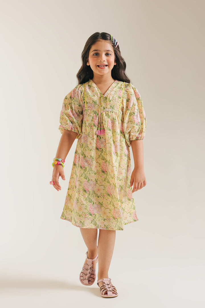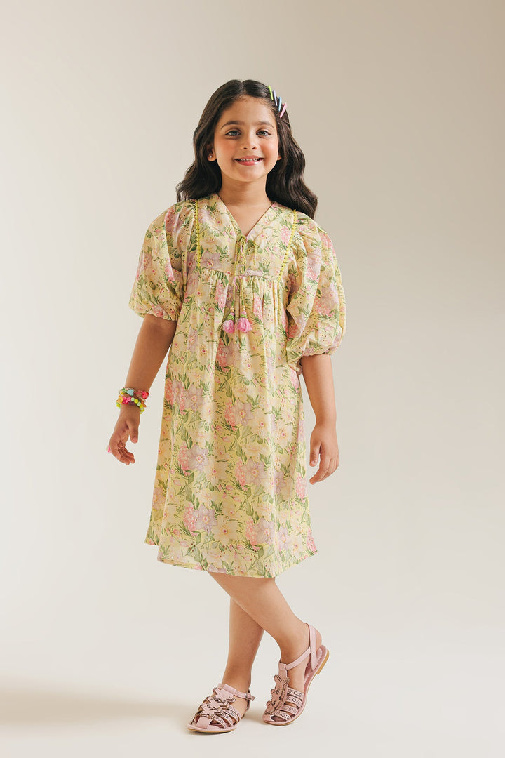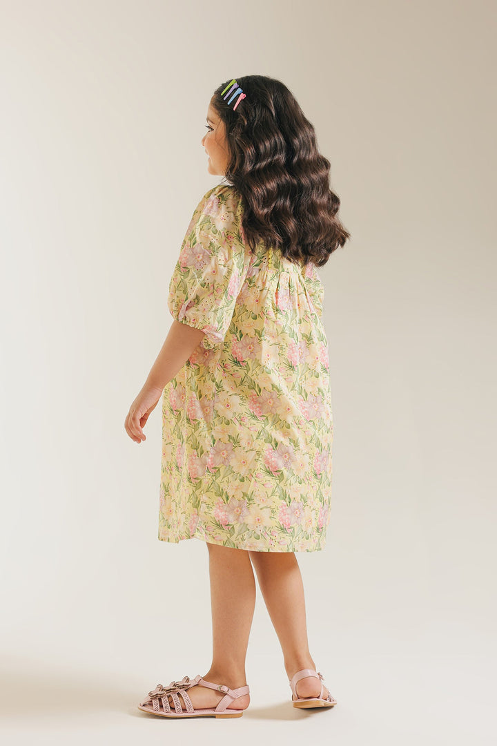 Let her step into a garden of delight with our charming floral print V-neck dress! This enchanting dress features a soft, all-over floral pattern with schiffli embroidery in delicate shades of pink and green on a light yellow base, creating a truly picturesque look. The V-neckline with a sweet scalloped trim, combined with the comfortable puff sleeves and gathered skirt, offers a blend of elegance and playful comfort. Perfect for any special occasion, family gathering, or simply adding a touch of springtime beauty to her day.