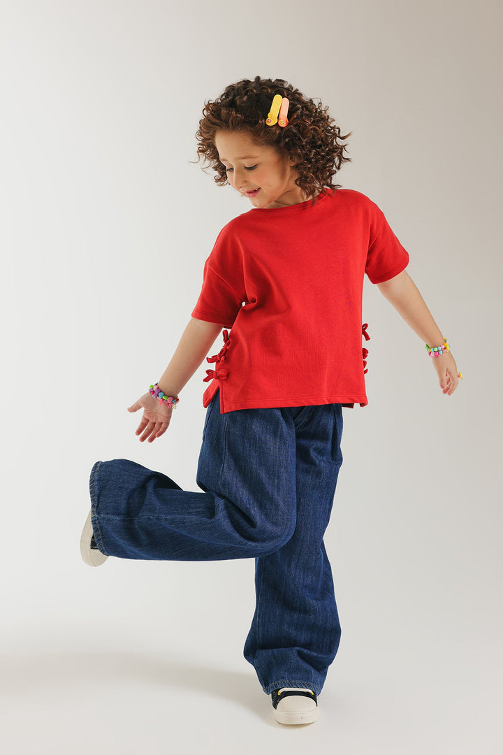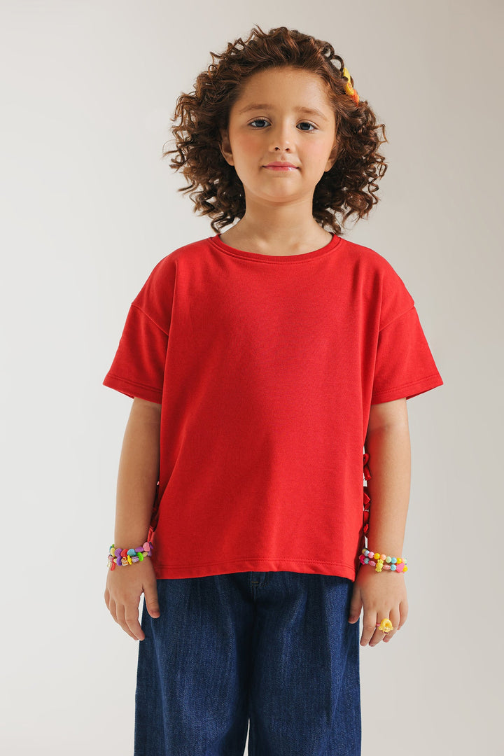 Add a pop of vibrant fun to her everyday wardrobe with this charming red T-shirt! This comfortable tee is uniquely accented with playful fringe details along the side seams, adding a touch of whimsical movement. With its relaxed short-sleeve fit, it's perfect for her casual adventures, playdates, or simply adding a joyful and stylish splash of color to her look.