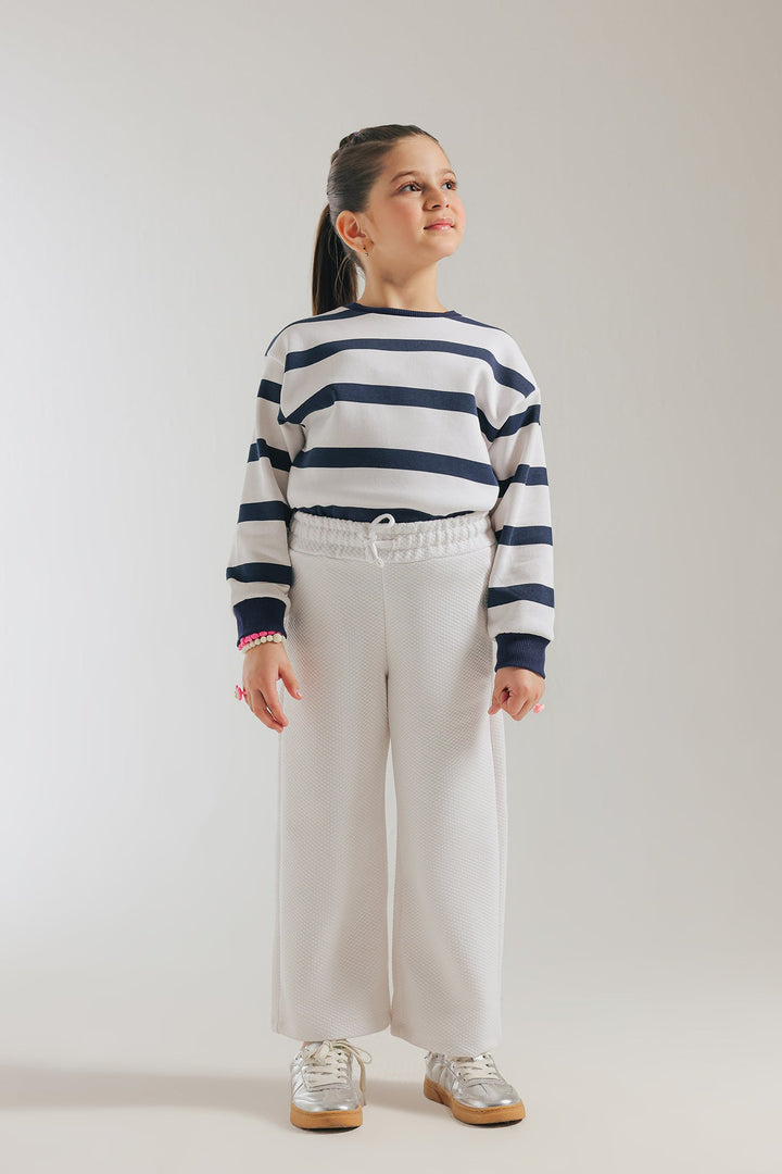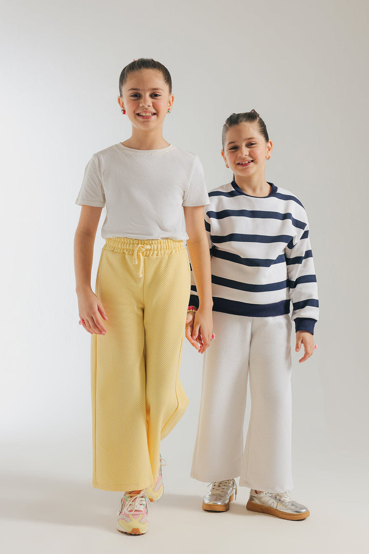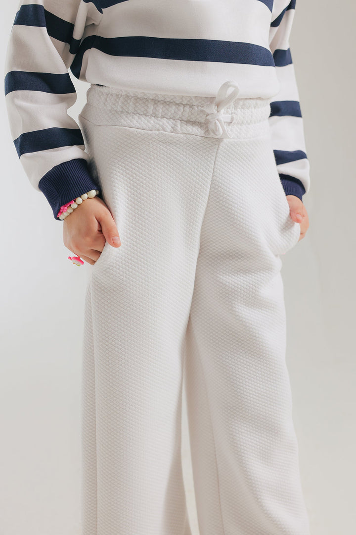 This white wide-leg trouser is a versatile addition to your wardrobe. It offers both comfort and style to your kid, with an elastic waistband with a drawstring for adjustment. The neutral color allows for easy pairing with any top. Upgrade your kid's everyday look with this timeless piece.