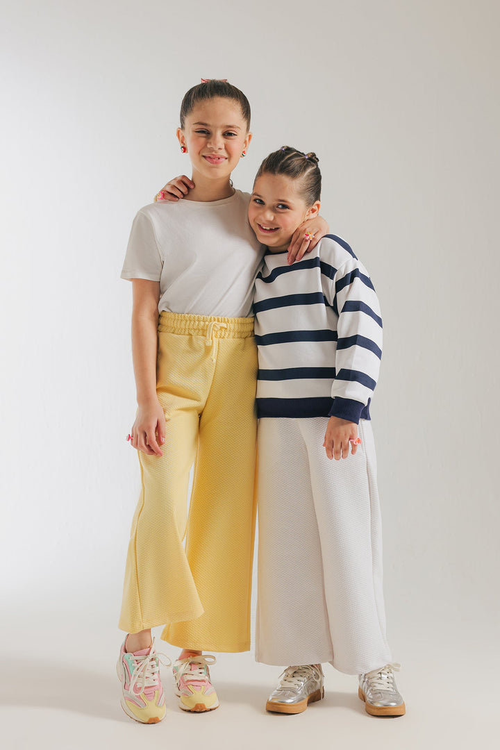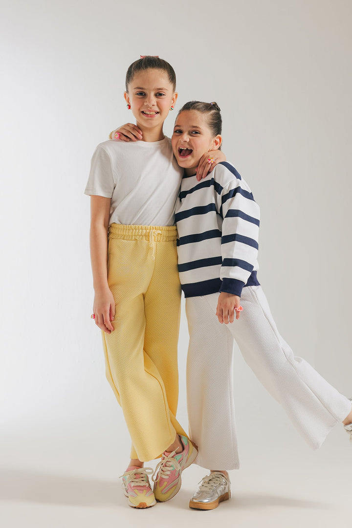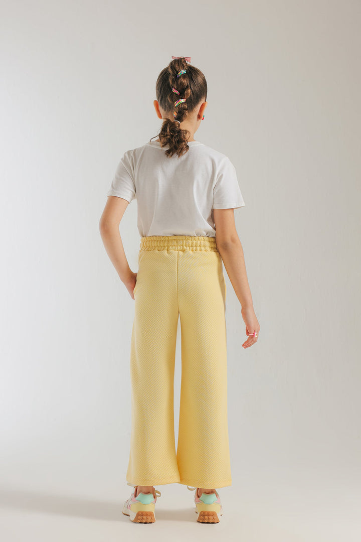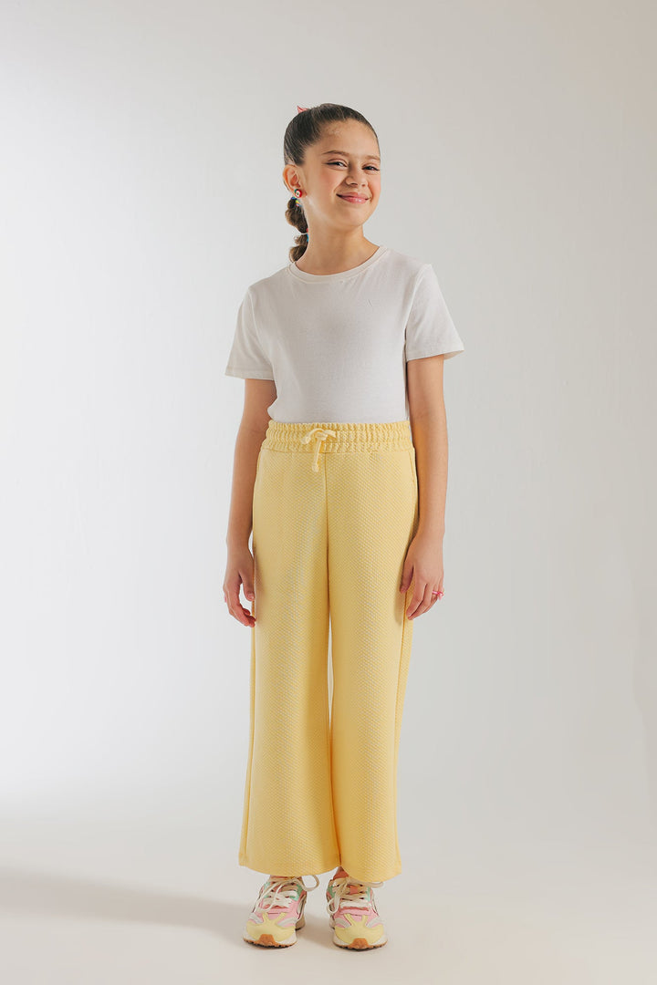 This yellow fluorescent wide-leg trouser is a versatile addition to your wardrobe. It offers both comfort and style to your kid, with an elastic waistband with a drawstring for adjustment. The neutral color allows for easy pairing with any top. Upgrade your kid's everyday look with this timeless piece.