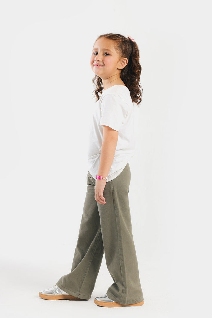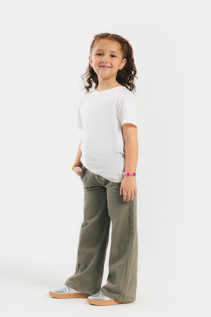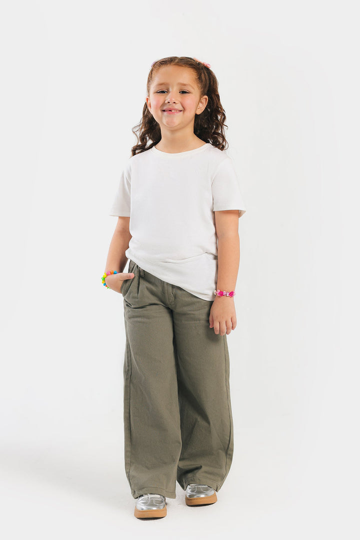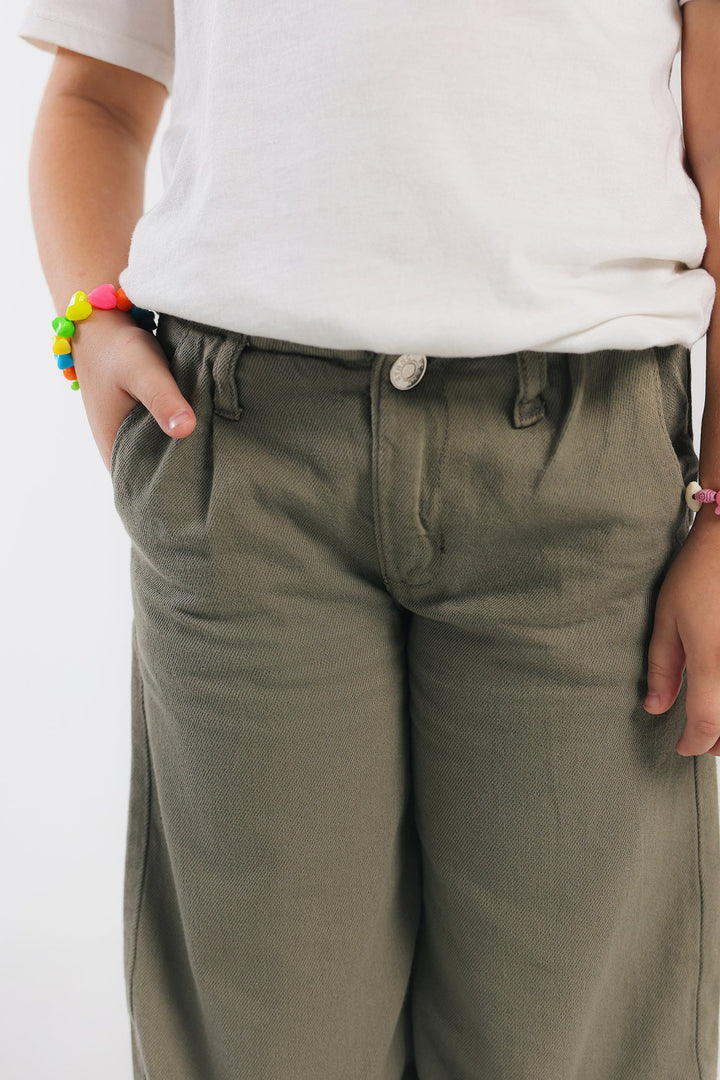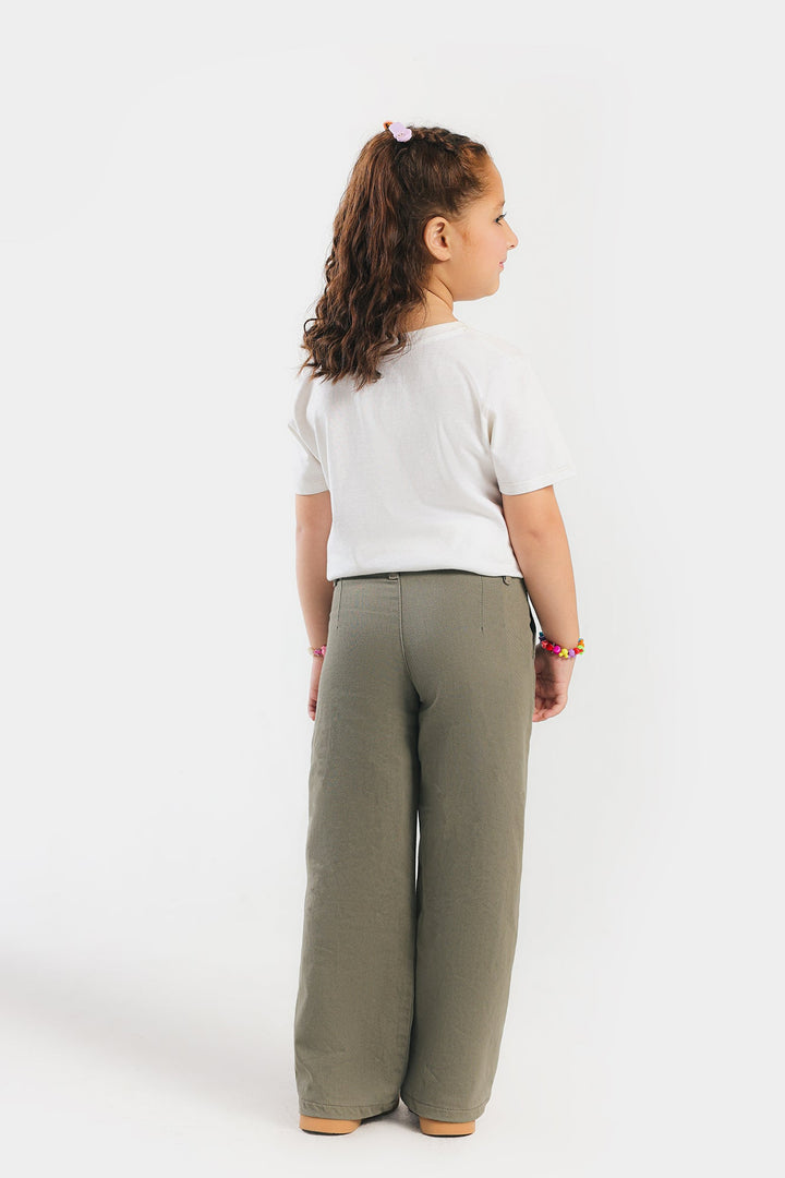 These green wide-leg trousers are the perfect addition to girl's wardrobe. It offers comfort and durability for everyday wear. Their trendy design will let them be stylish and the wide leg fit allows for easy movement. Upgrade your girl's wardrobe with these versatile trousers.