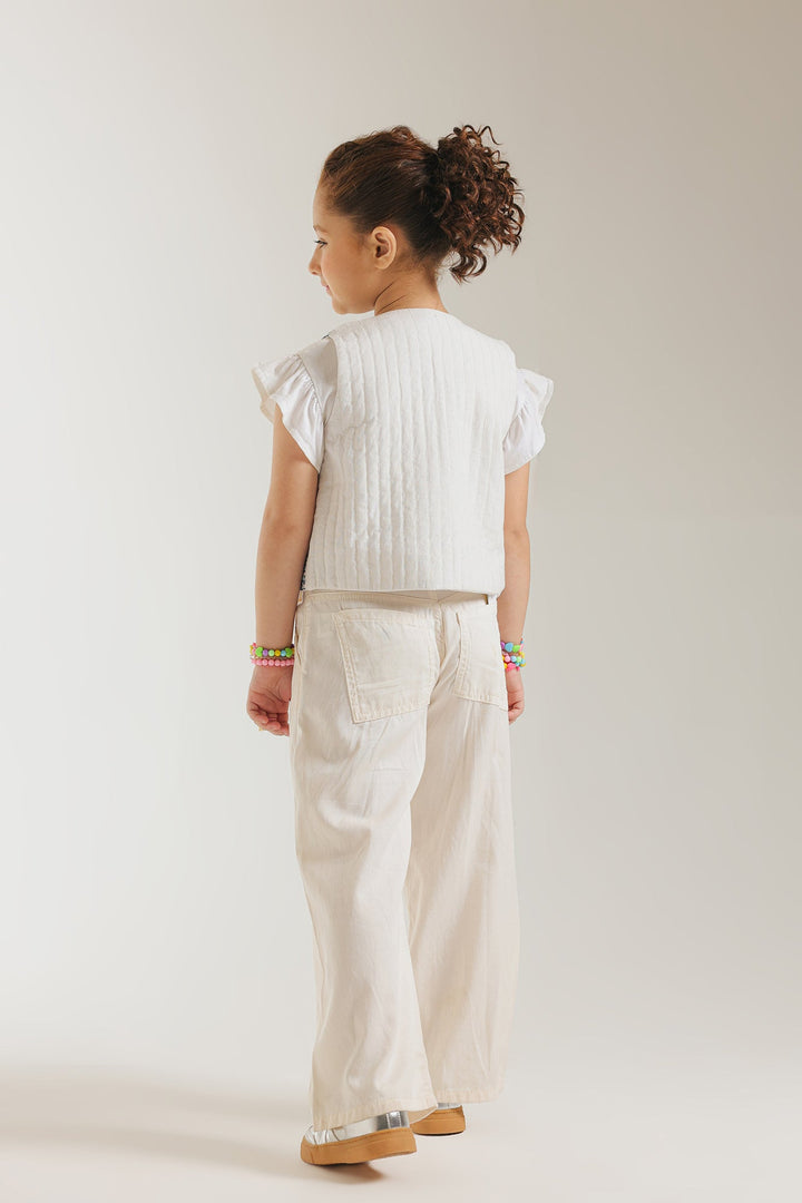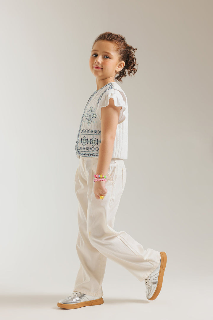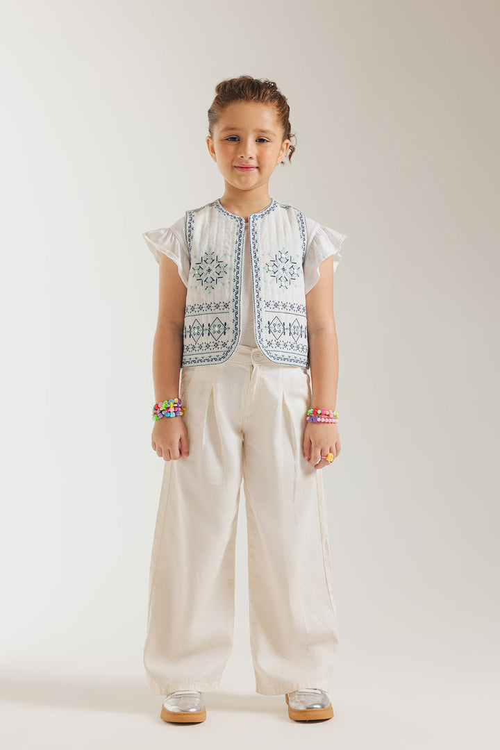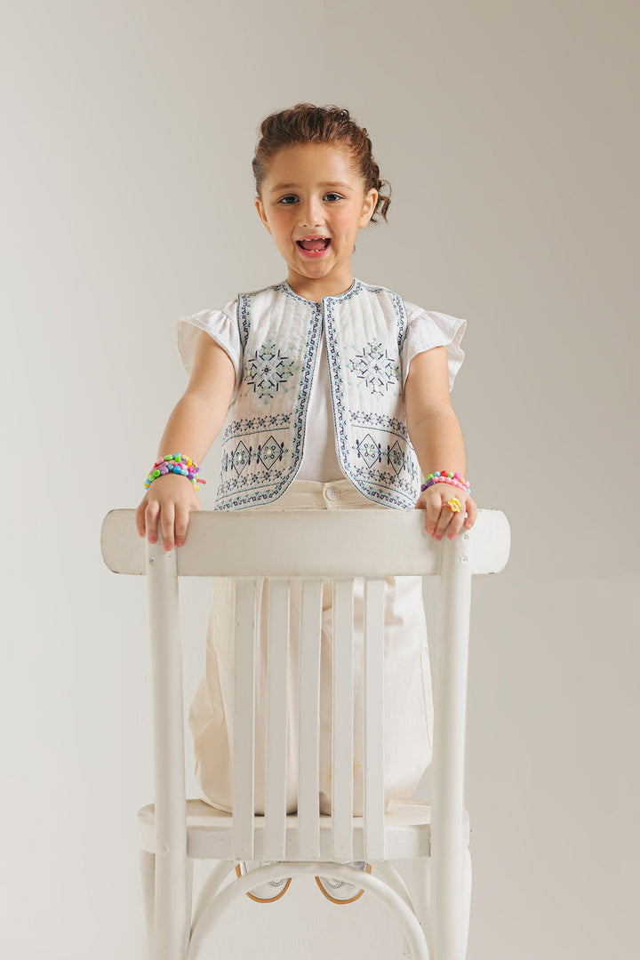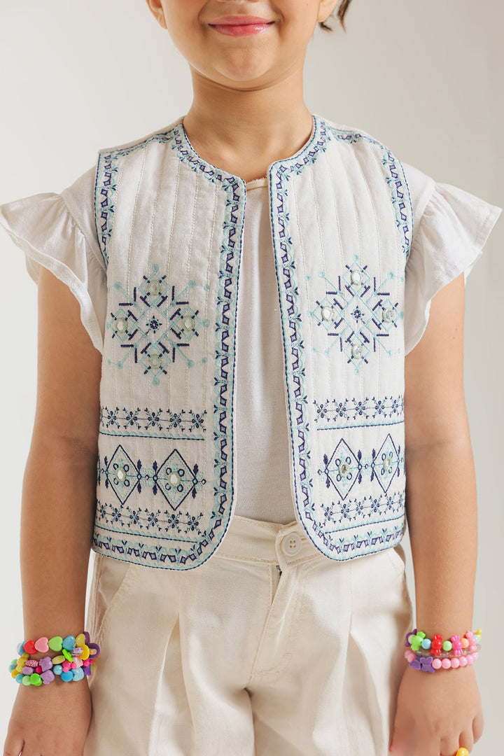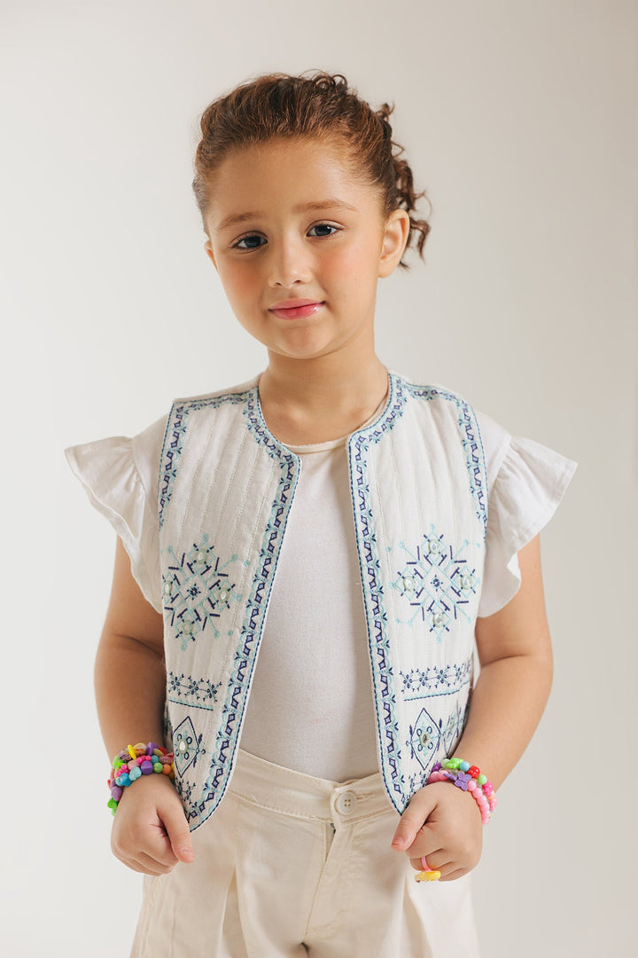 Add a delightful layer of charm to her outfit with this adorable white waistcoat! This cute waistcoat features intricate blue embroidery in a geometric and floral pattern, creating a charming and artistic design. It's perfect for adding a stylish touch to her casual wear, layering over a simple top, or dressing up for a special occasion.