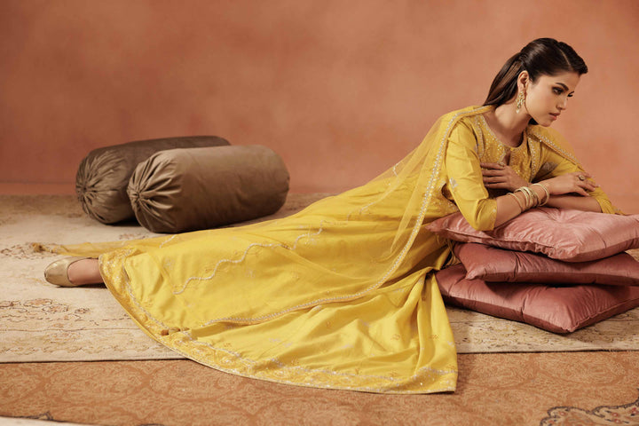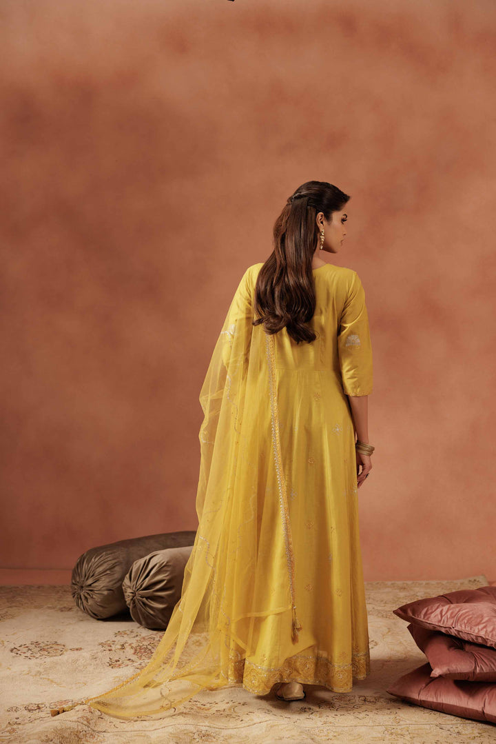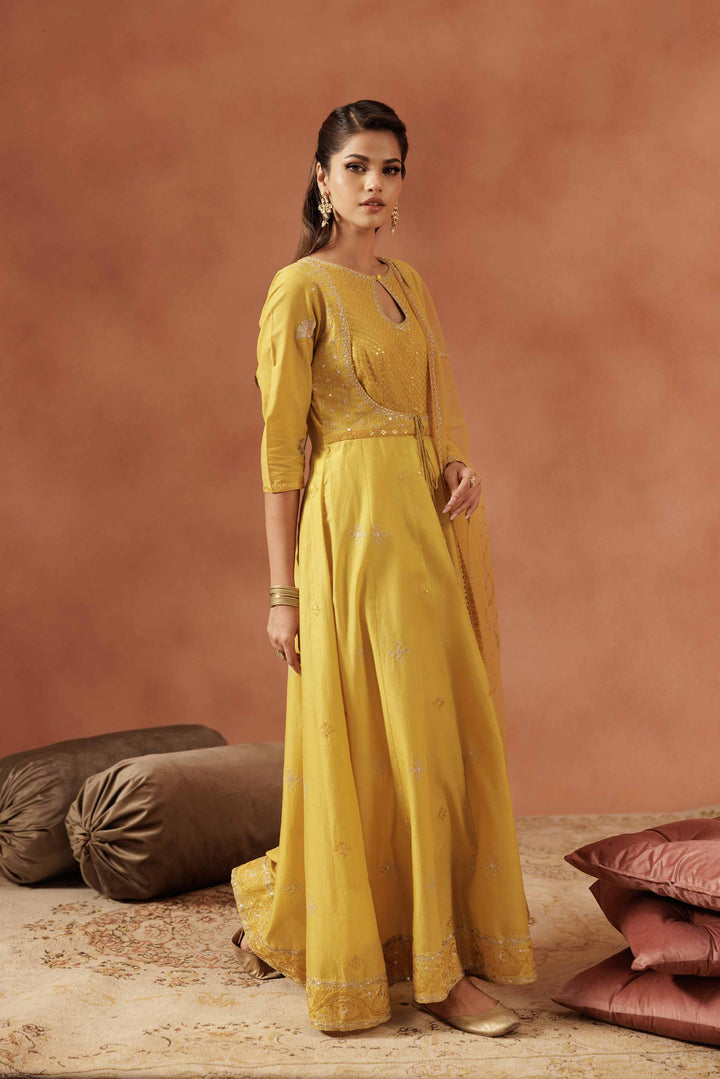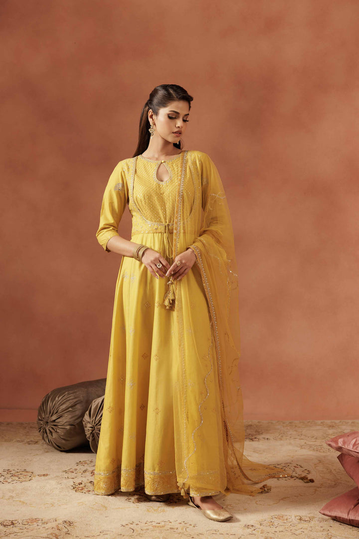 Long angarakha dress featuring a round neckline with keyhole, stylized yoke adorned with hanging tassels, and intricate sequin embroidery.