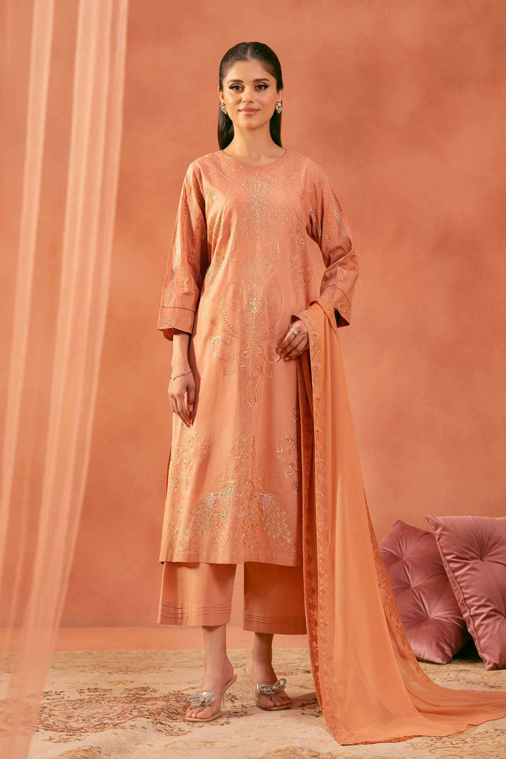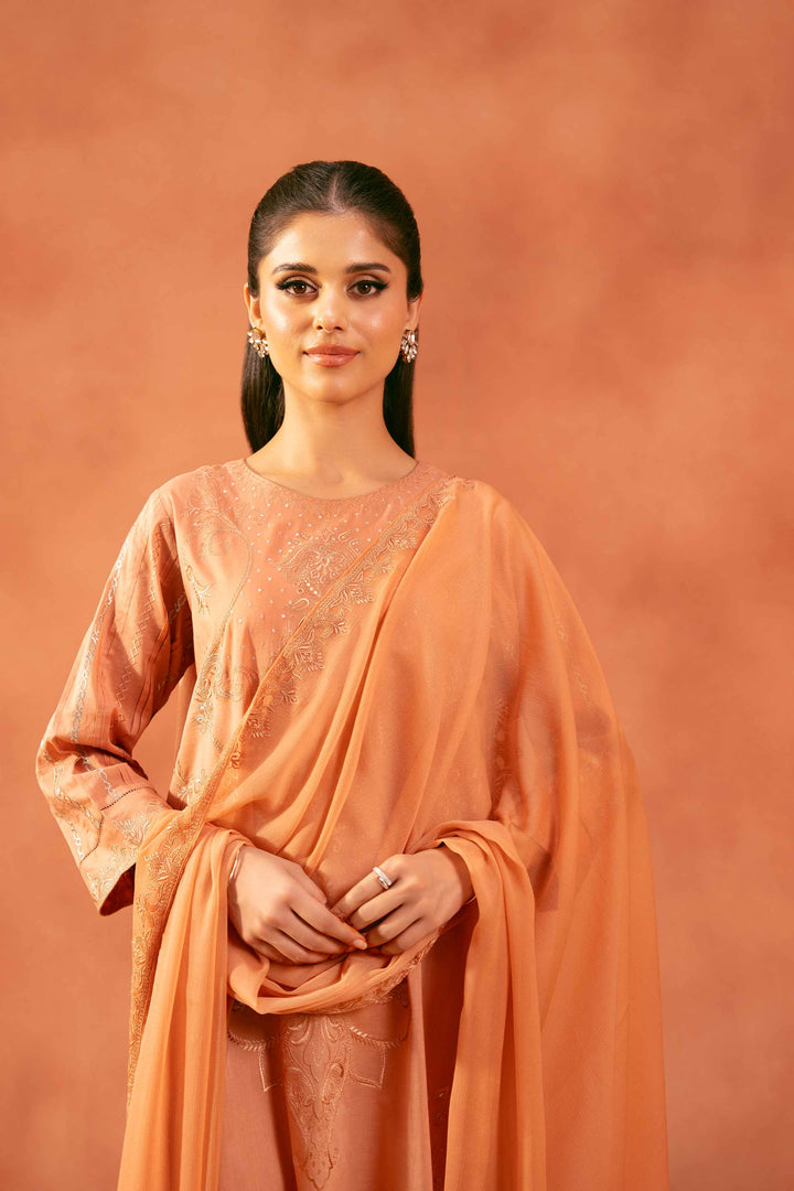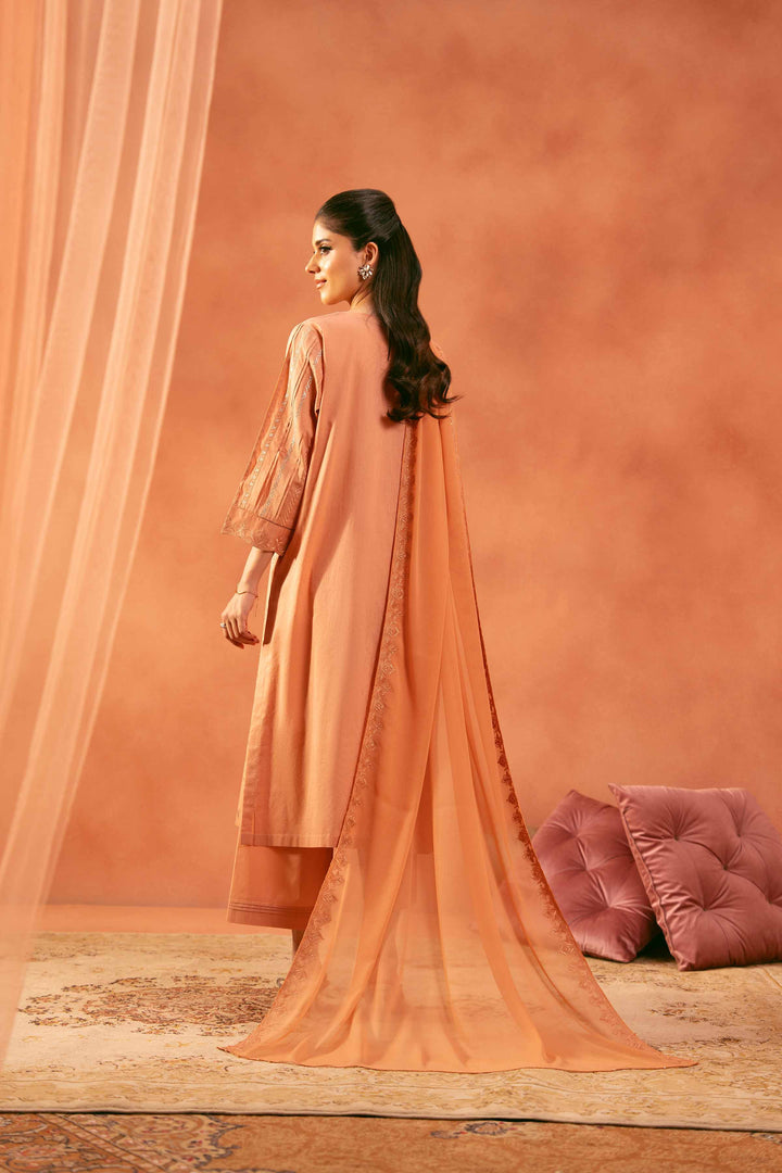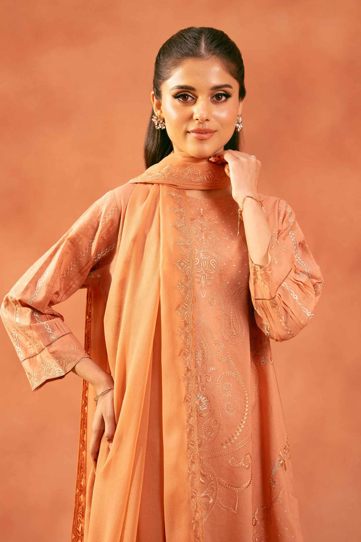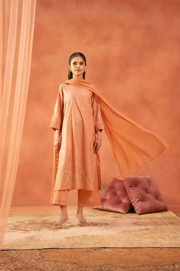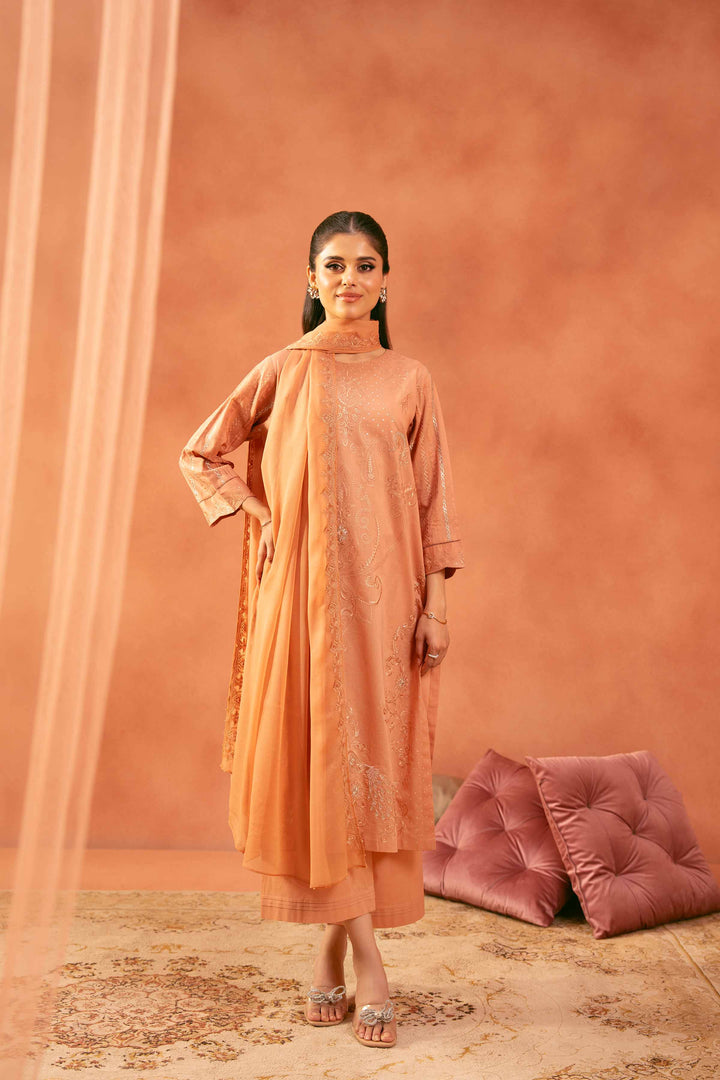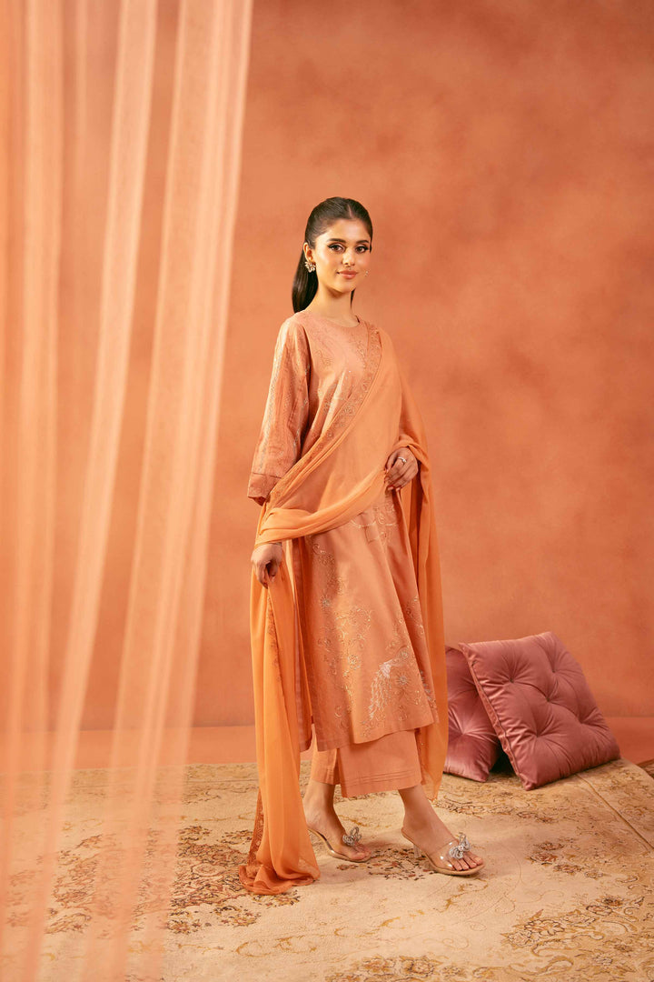 Make a truly elegant statement in this embroidered three-piece suit from the latest Luxury Pret Summer Collection, crafted with exquisite embroidery and designed for timeless sophistication.