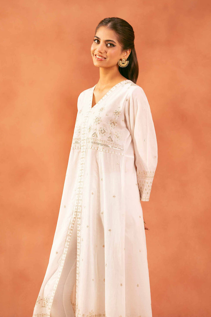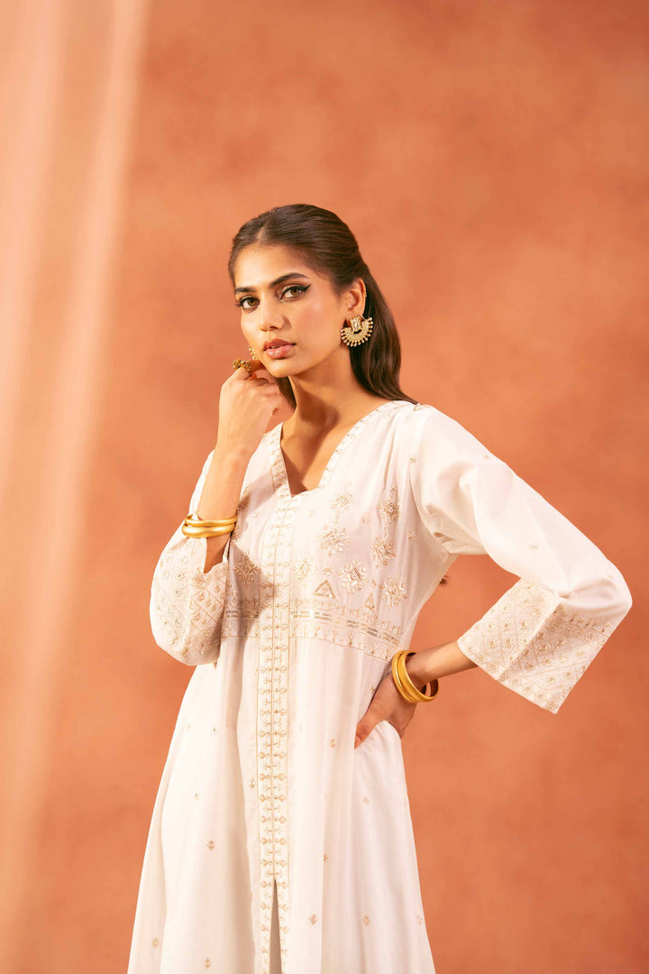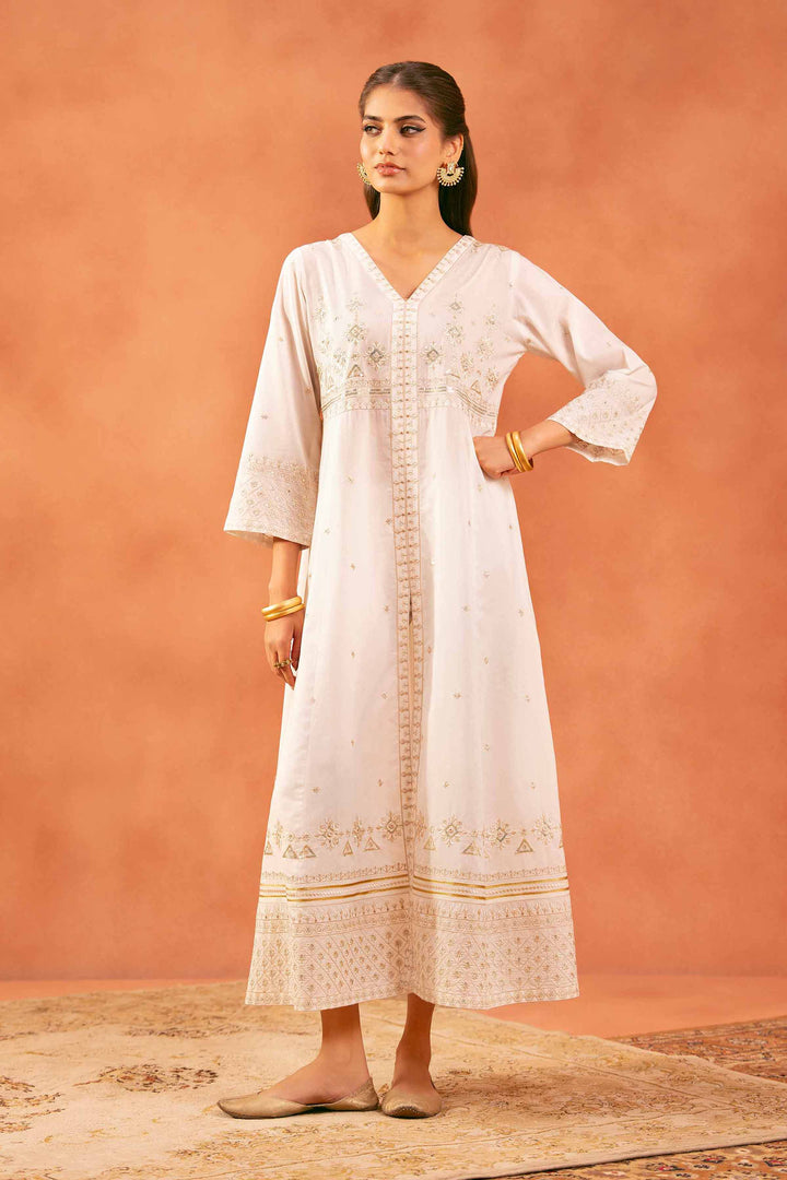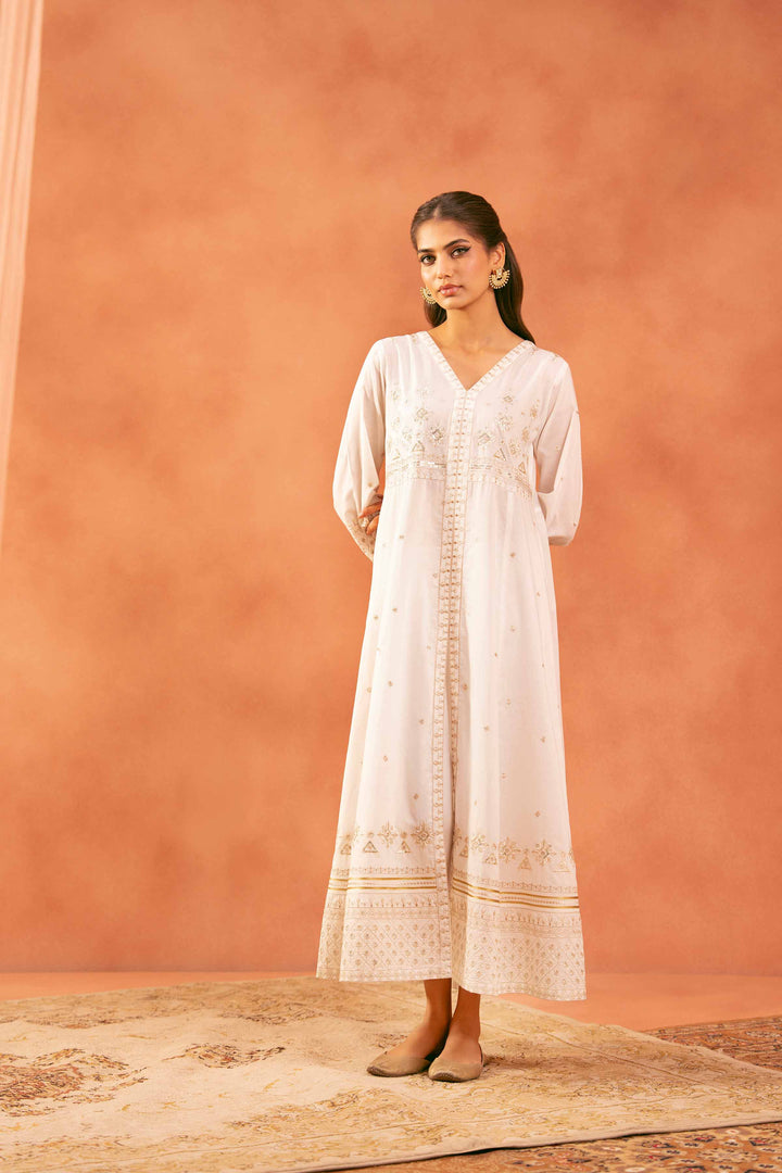 Embroidered Long Dress with V-Band Neckline and Gotta Detailed Front-Open Design.
