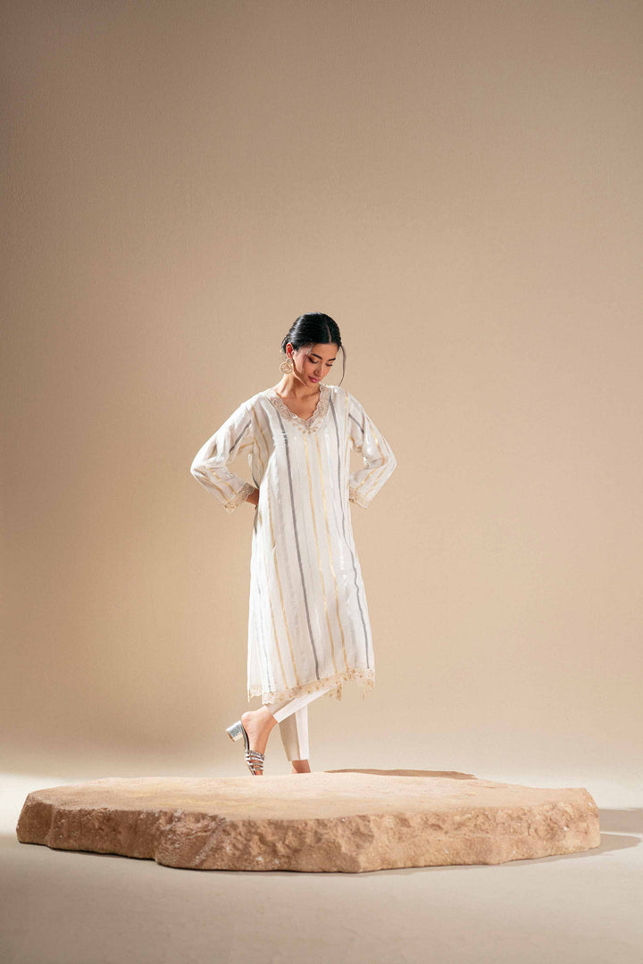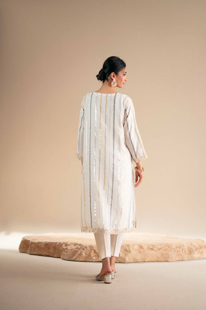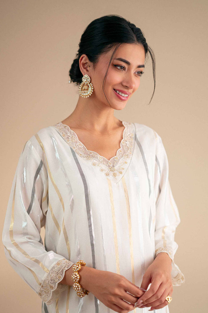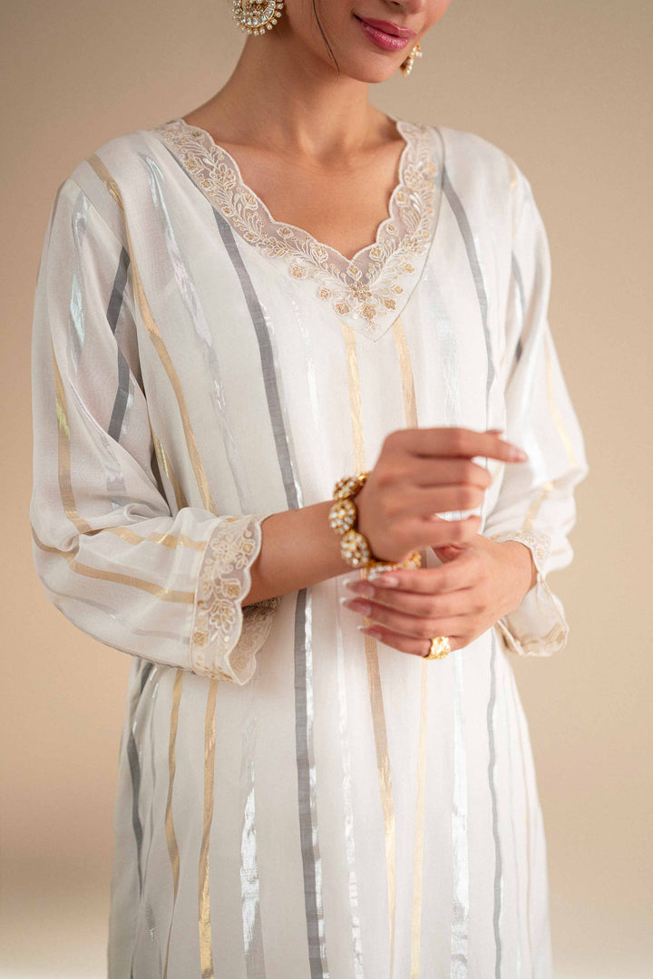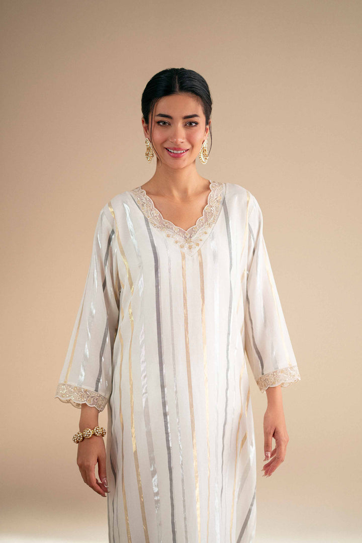 Long zari-lined shirt featuring a V neckline with scalloped embroidery on the neckline, sleeves, and hem.