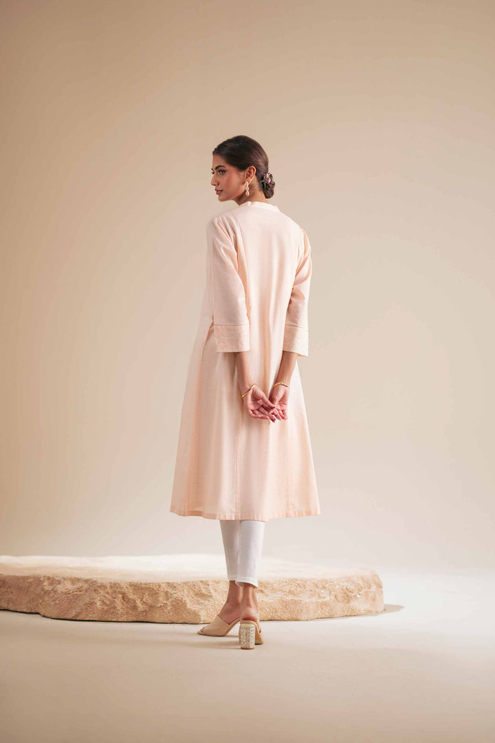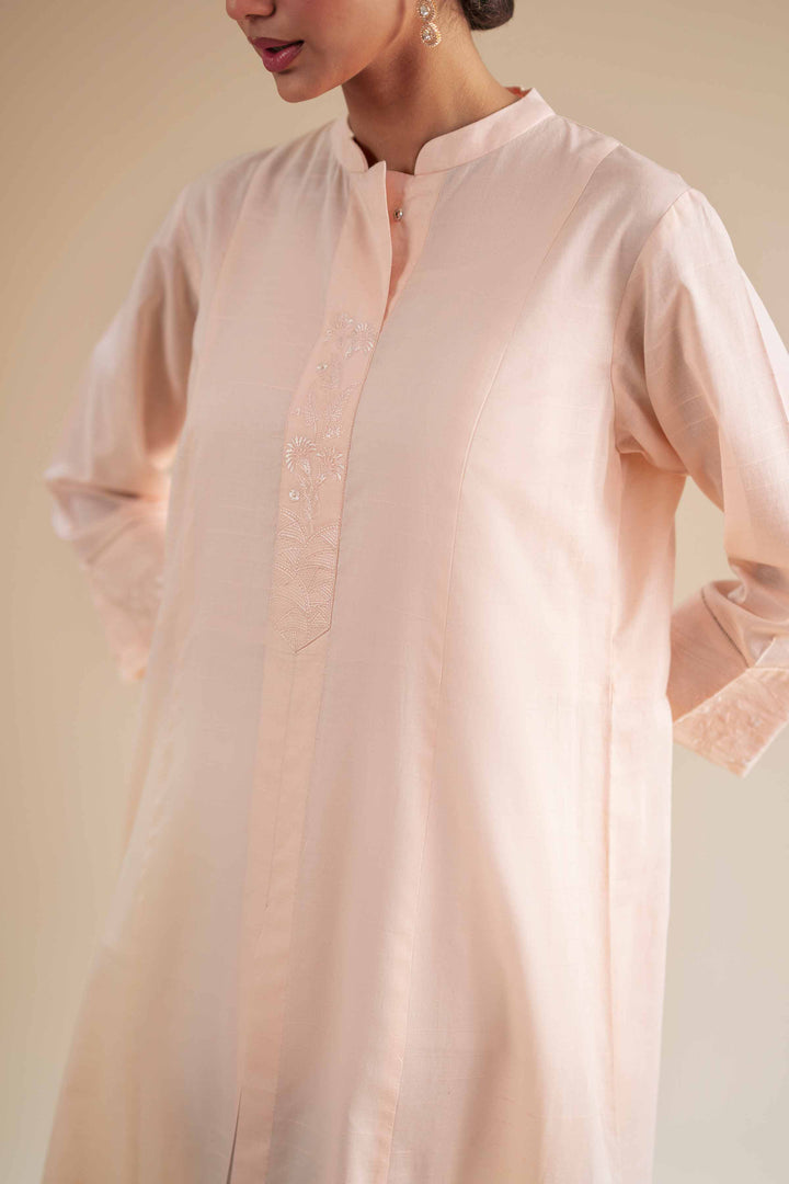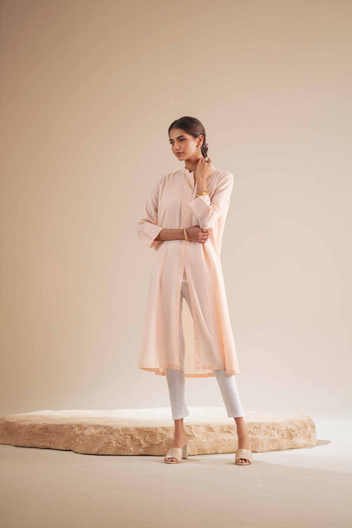 Long front-open paneled shirt featuring an overlapped band neckline with an intricately embroidered placket. Embroidered sleeves adorned with ladder lace add a refined finishing touch.