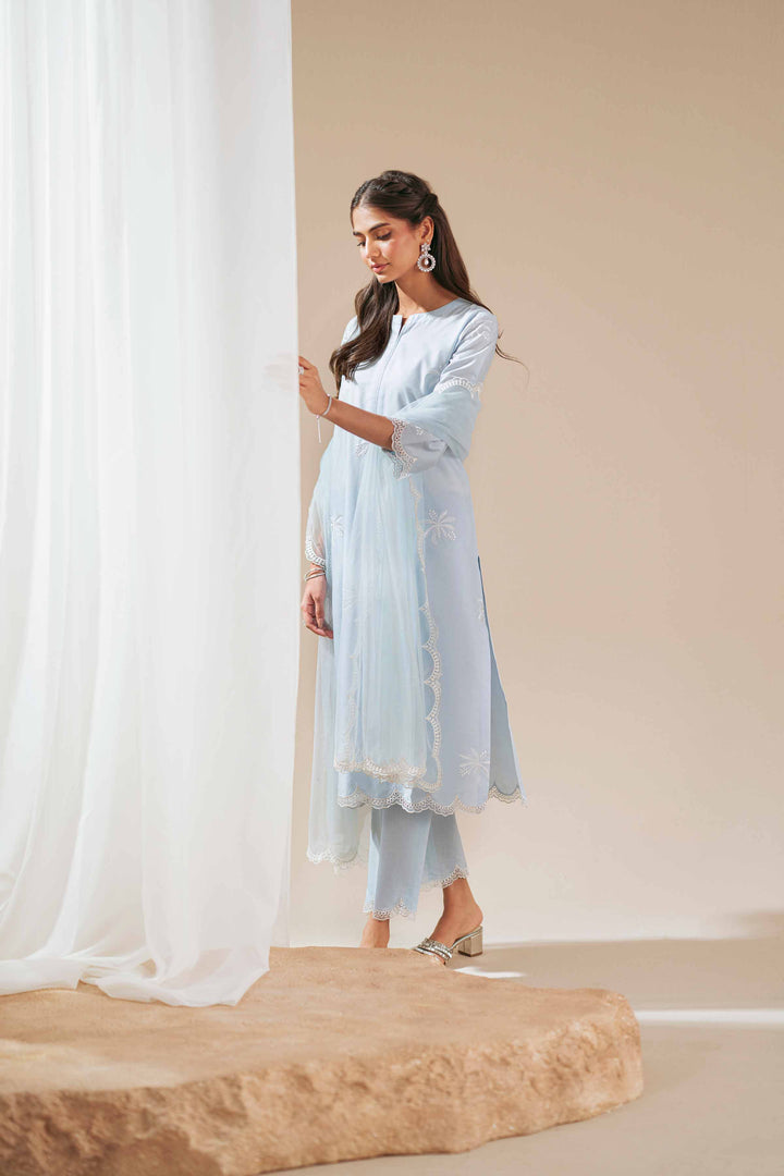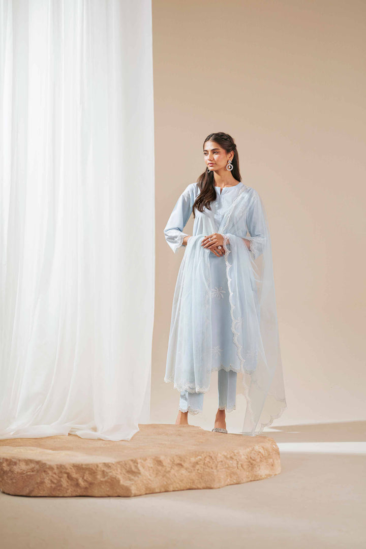 Round Neckline With Piping & Slit, Patched Embroidered Organza Scalloped Sleeves Edges & Hem