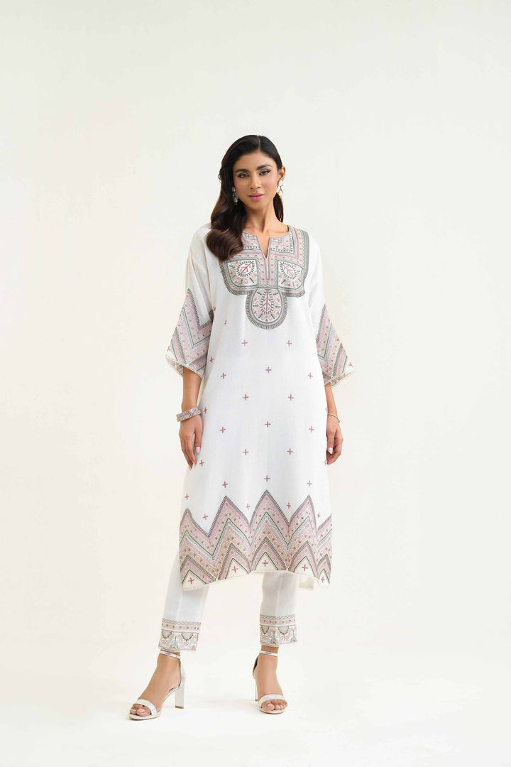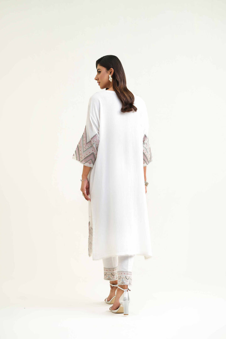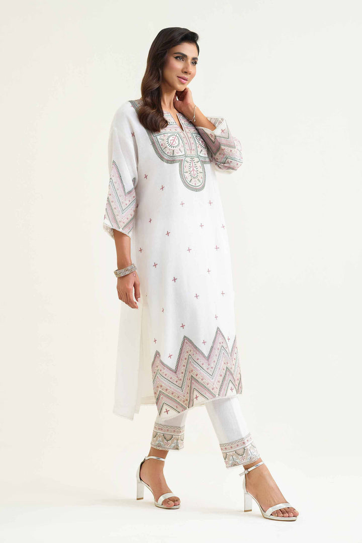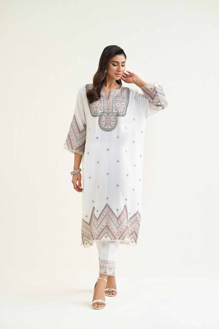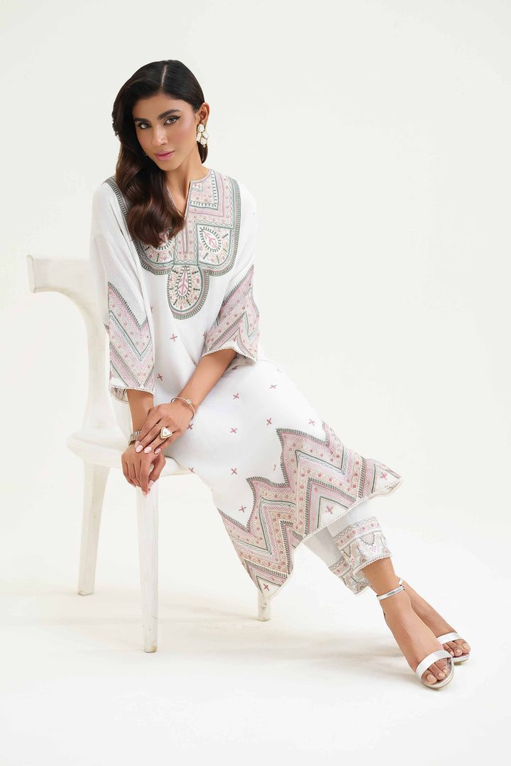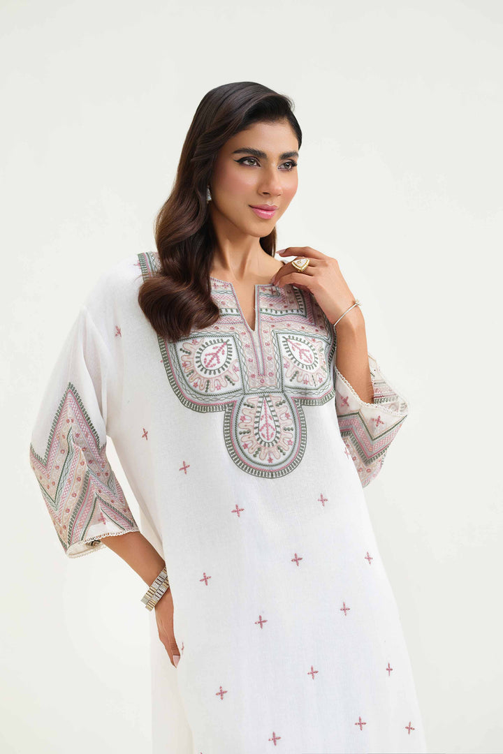 Round Neckline With V Slit, Embroidered Front & Sleeves, Long Kimono Shirt