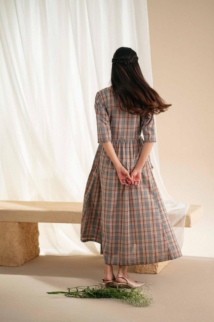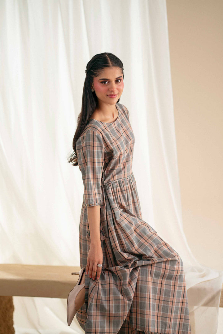 Long checked dress with a round neckline and gathered side panels, featuring tassel hangings at the sides and handwork-detailed sleeves.