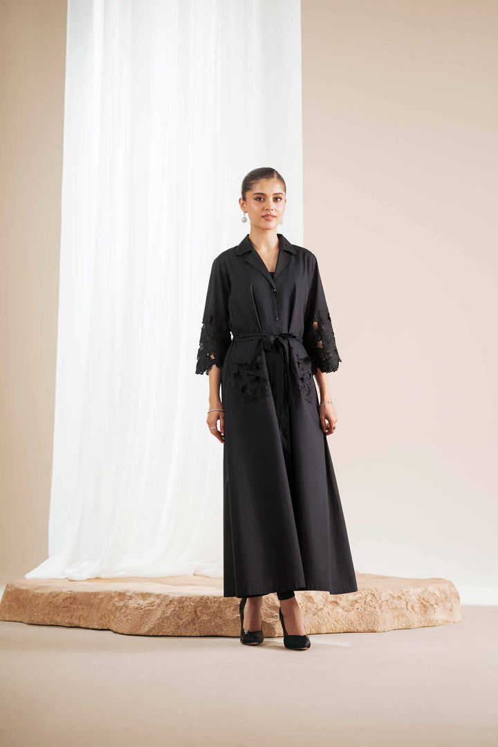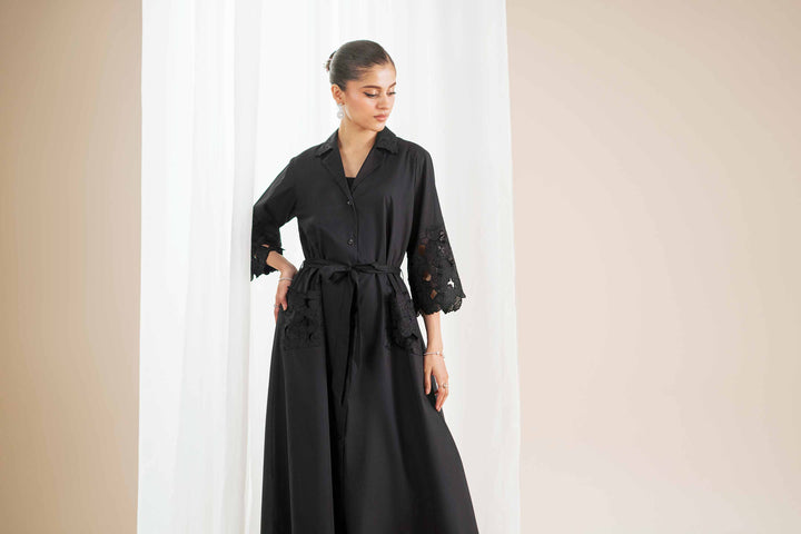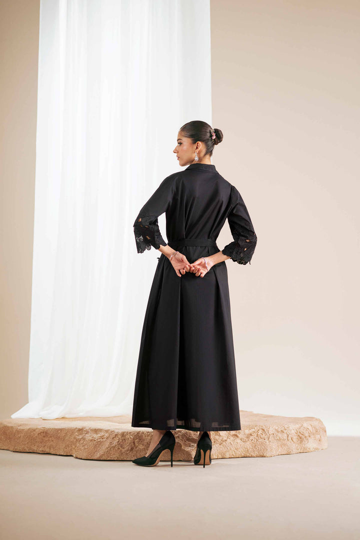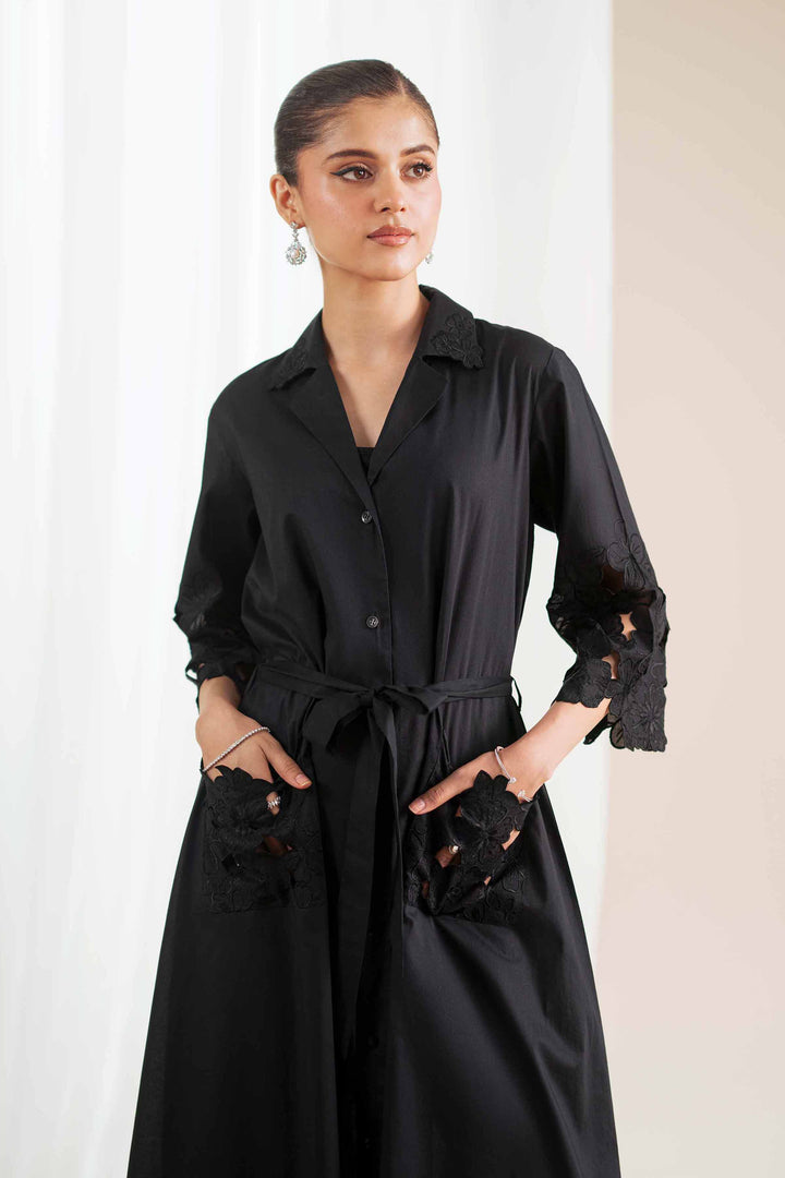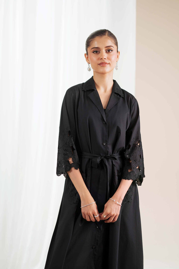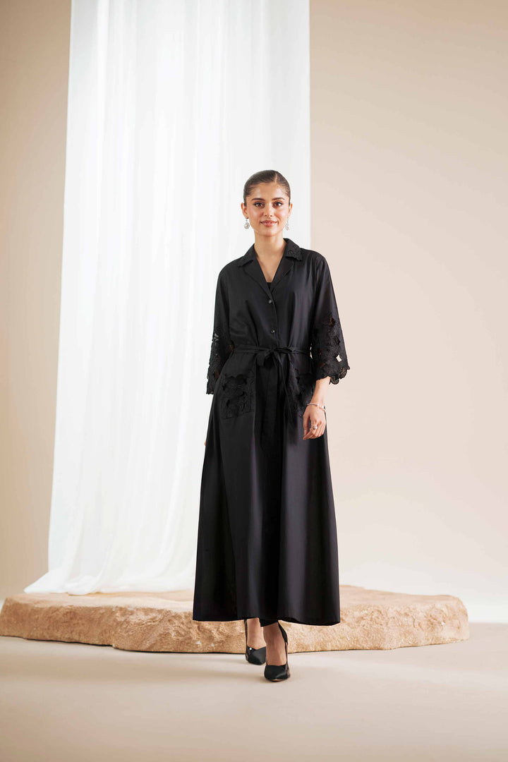 Long self cutwork embroidered button-down dress with a notch-collar neckline, patch cutwork embroidered placket, and waist-belt detailing.