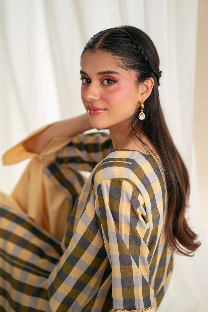 Short checkered front open paneled shirt featuring a V neckline enhanced with topstitching, sari lace inserted in the panel, and extended cuffed sleeve edges.