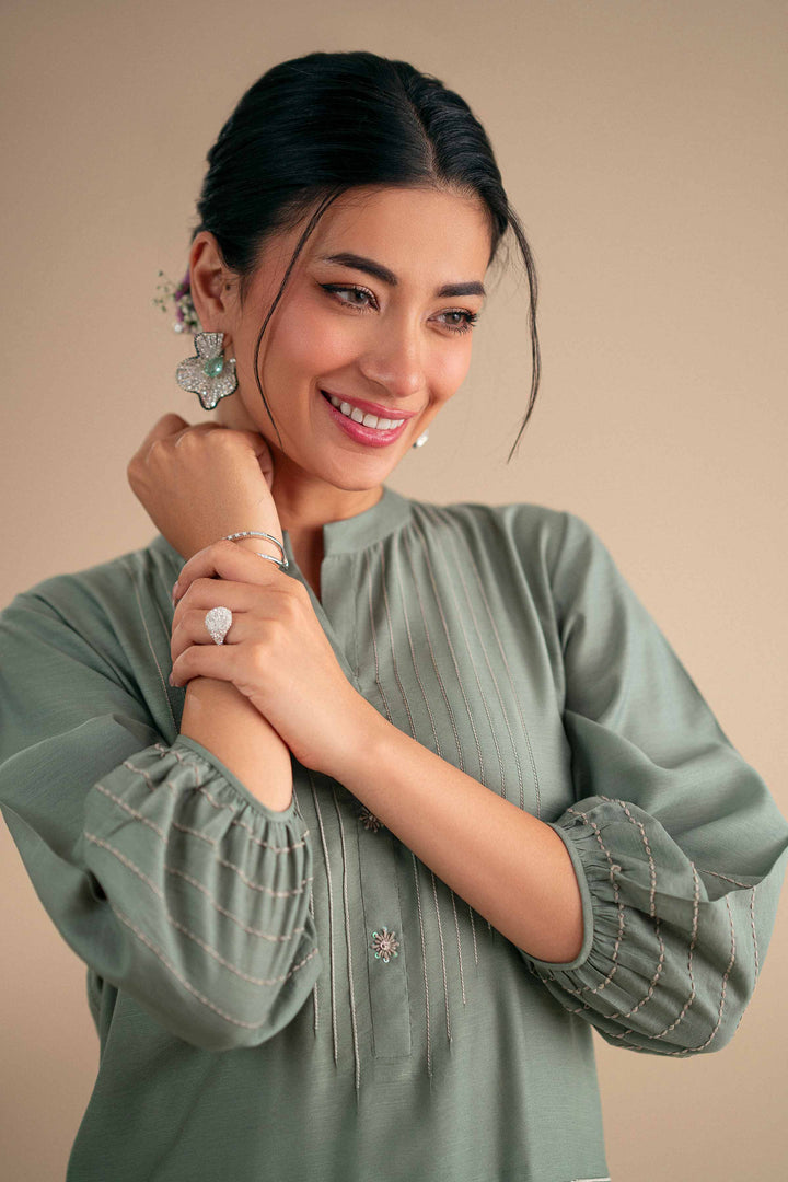 Long A-line dress with embroidered pintuck detailing, featuring a band neckline with buttoned placket, hand-stitch accents, and gathered sleeves.
