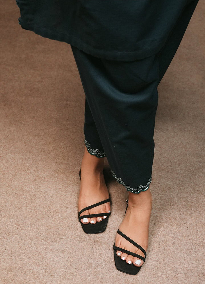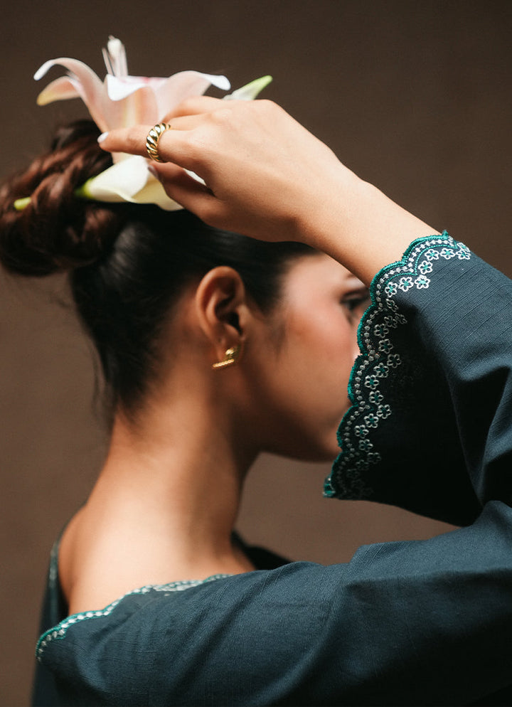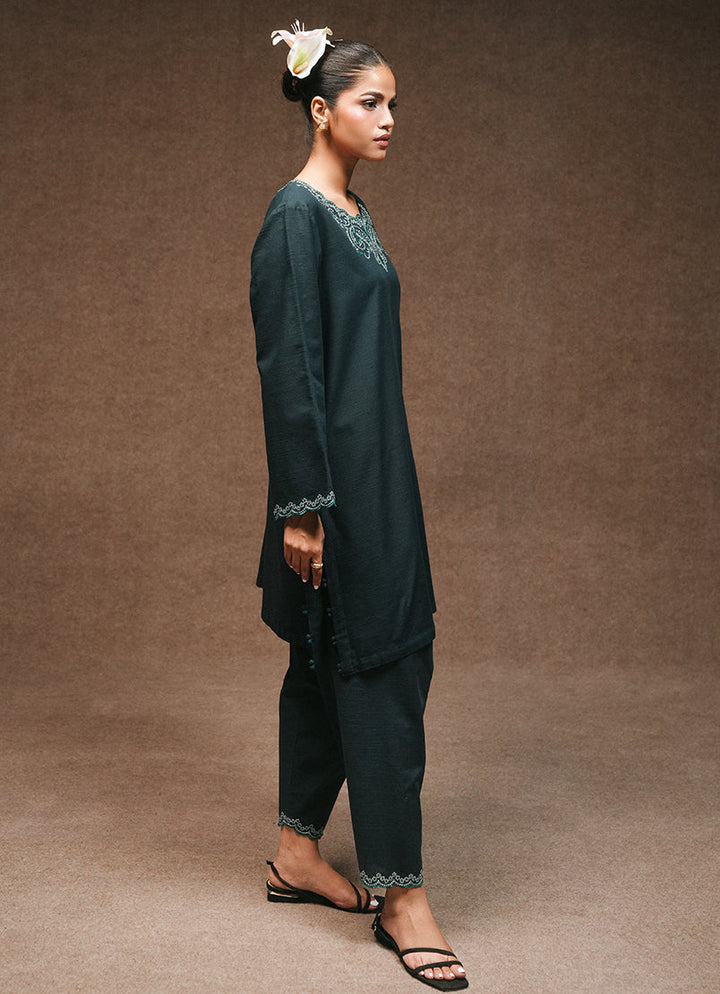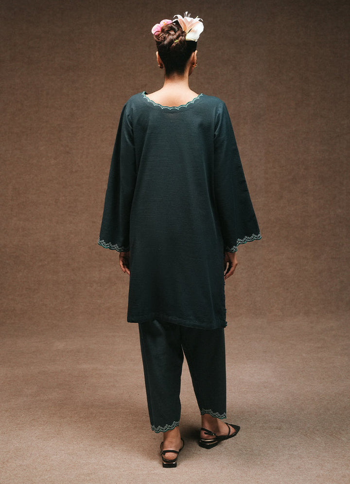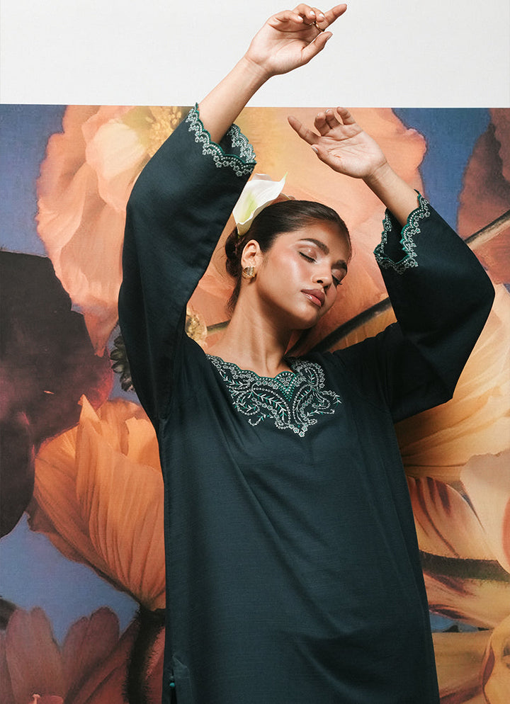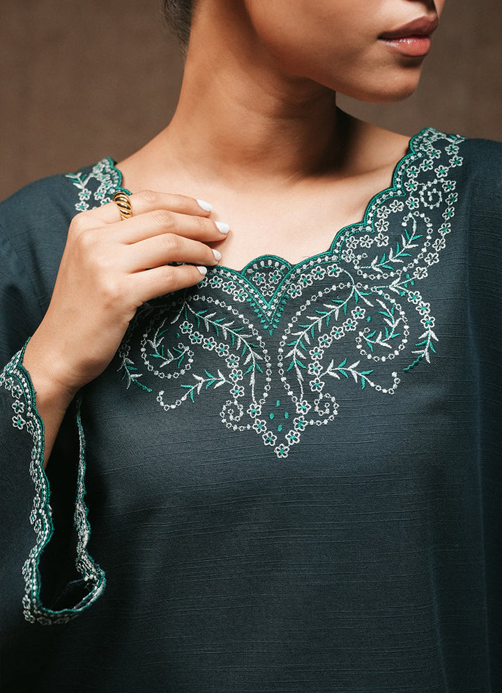 The Dark Green Khaddar Embroidered Co-ord Set from Winter Pret '24 Collection. A knee length shirt, round neckline, full length embroidered sleeves paired with embroidered trousers.