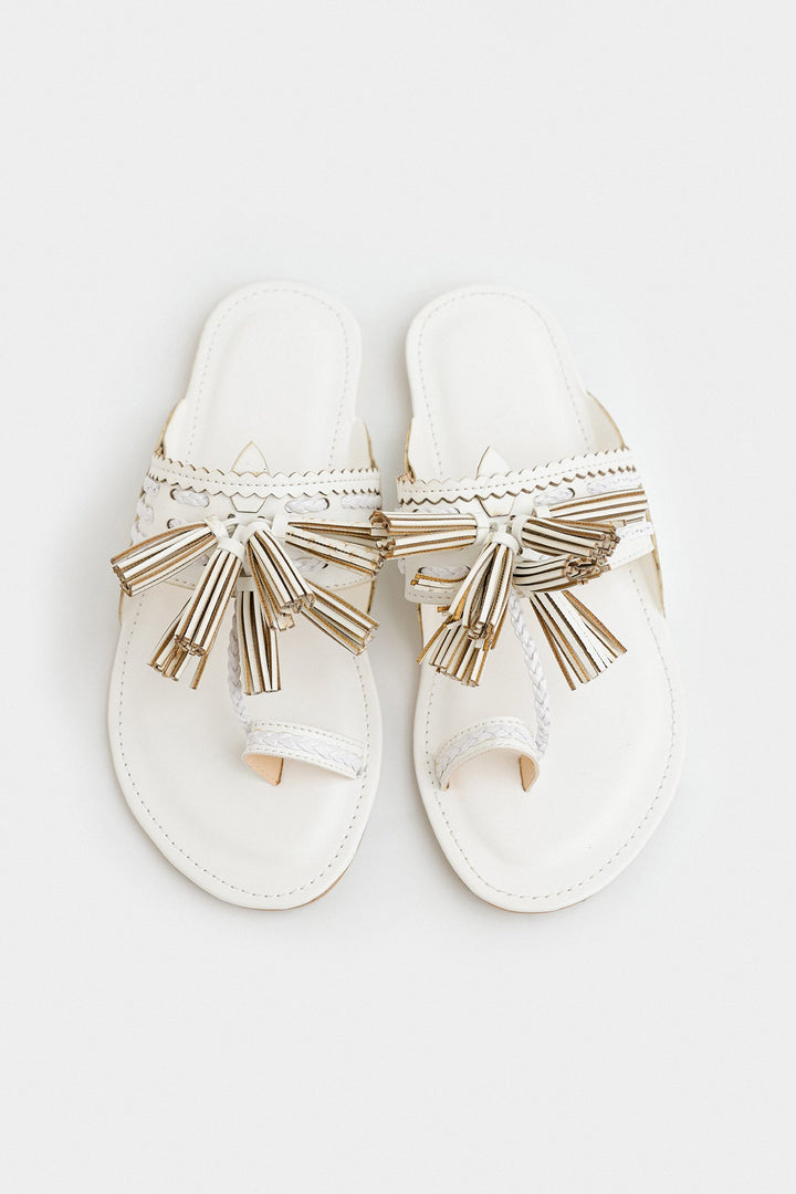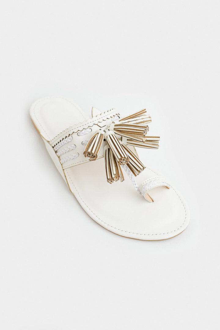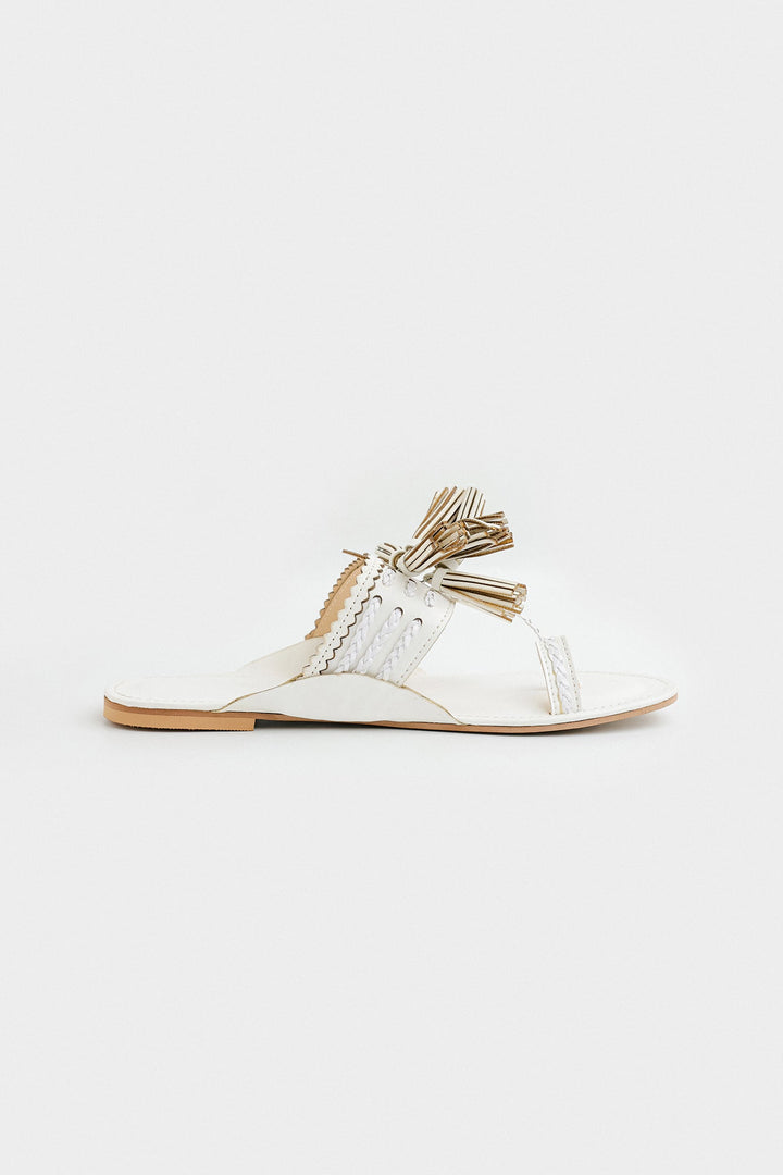 A chic and classy composition is layered over this graceful khola puri rendered in a creamy white shade. Adorned with tassels at front, this contemporary khola puri is a style statement for sophisticated looks.