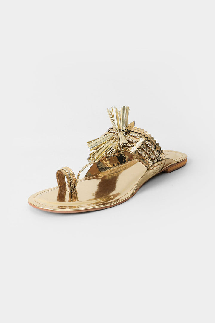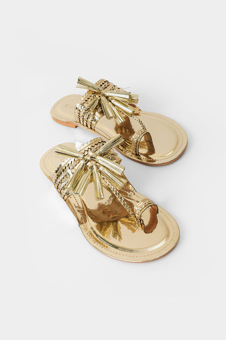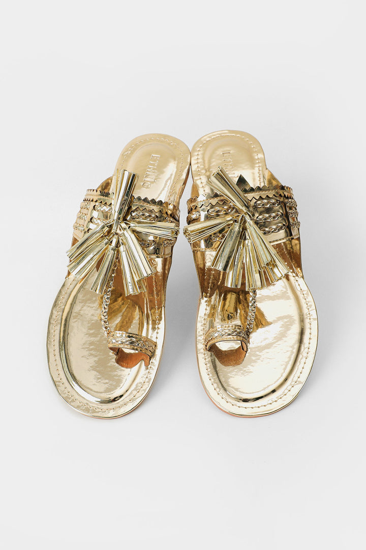 A chic and classy composition is layered over this graceful khola puri rendered in a dazzling gold shade. Adorned with tassels at front, this contemporary khola puri is a style statement for sophisticated looks.
