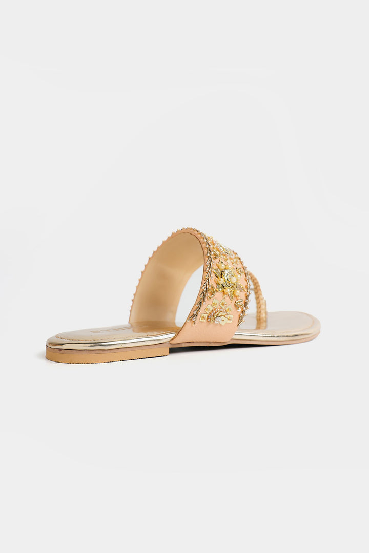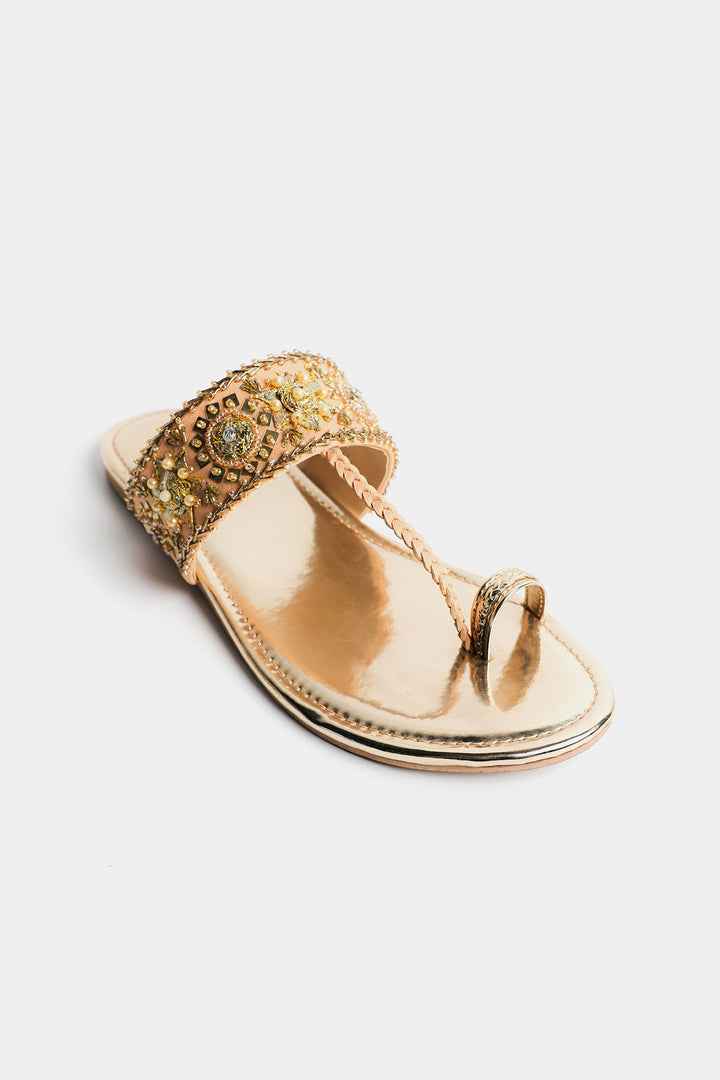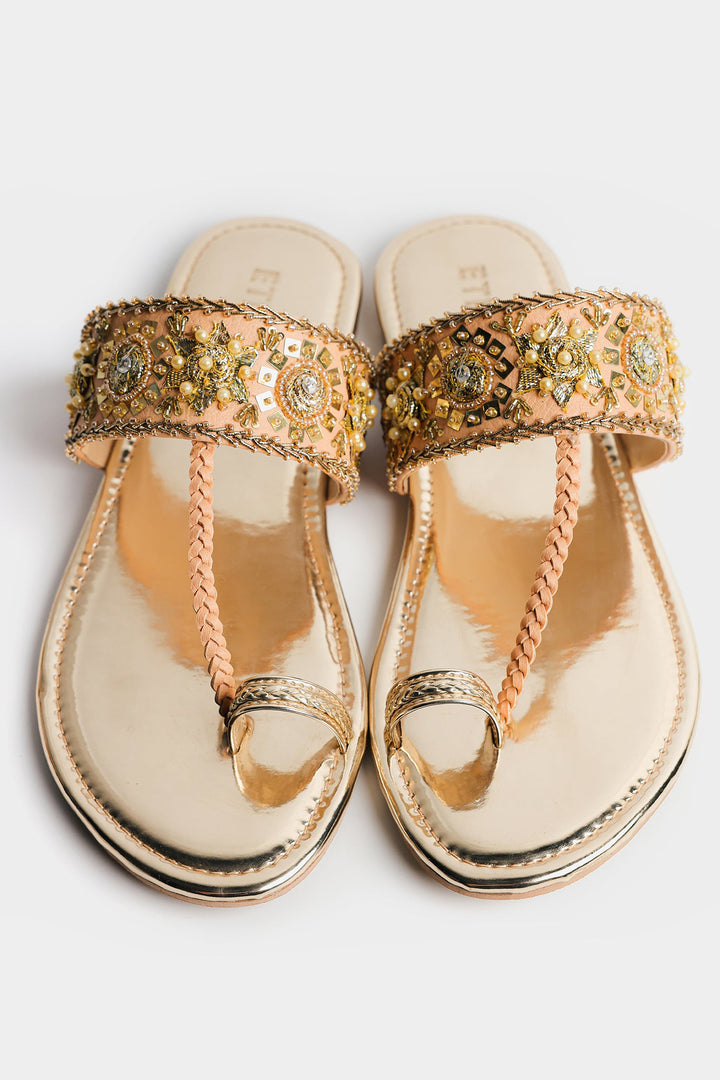 A pair of stylish sandals with an elegant design appears to have a metallic, reflective gold finish, giving them a luxurious and polished look. The straps are intricately embroidered with golden and colorful embellishments, including beads and threadwork, creating a rich and ornate pattern. These sandals are perfect for festive or traditional occasions, pairing well with ethnic or formal outfits.