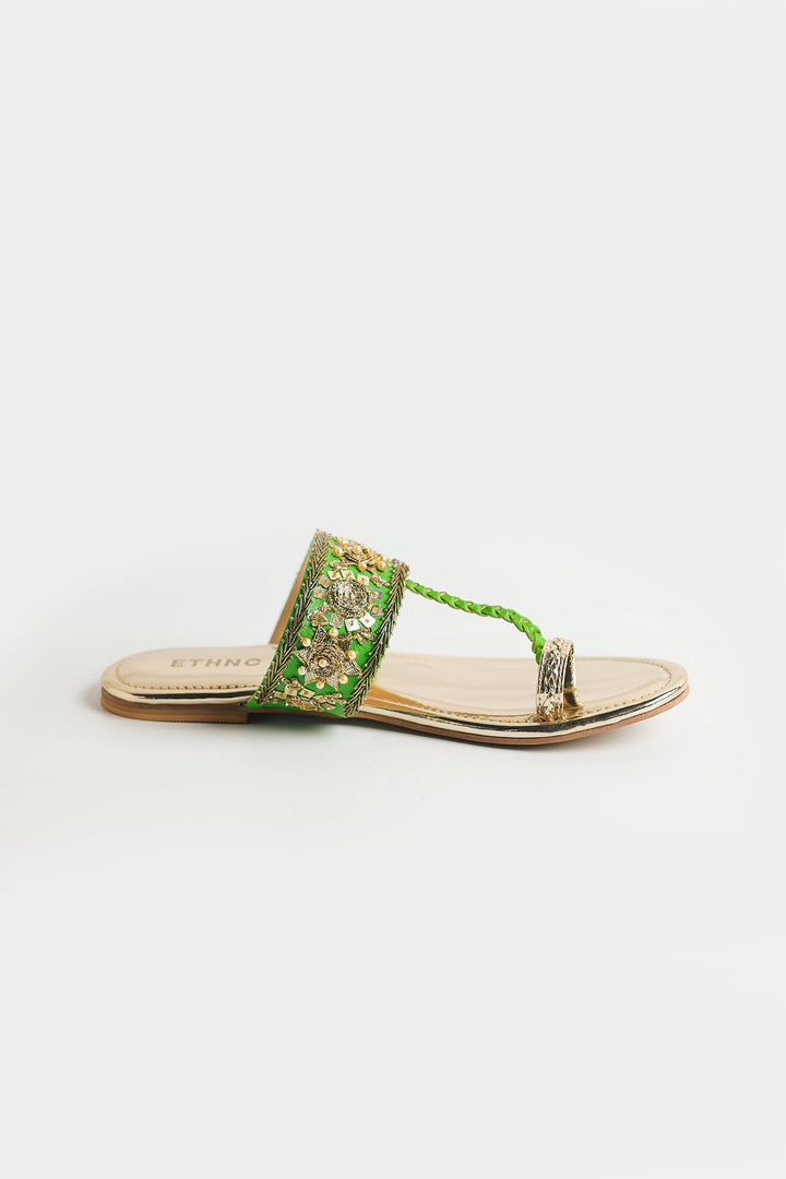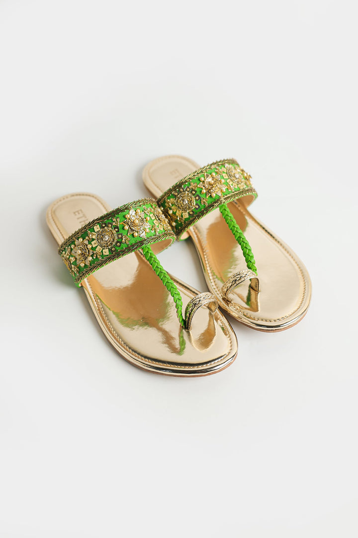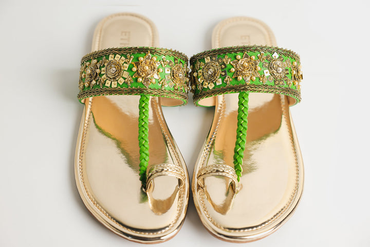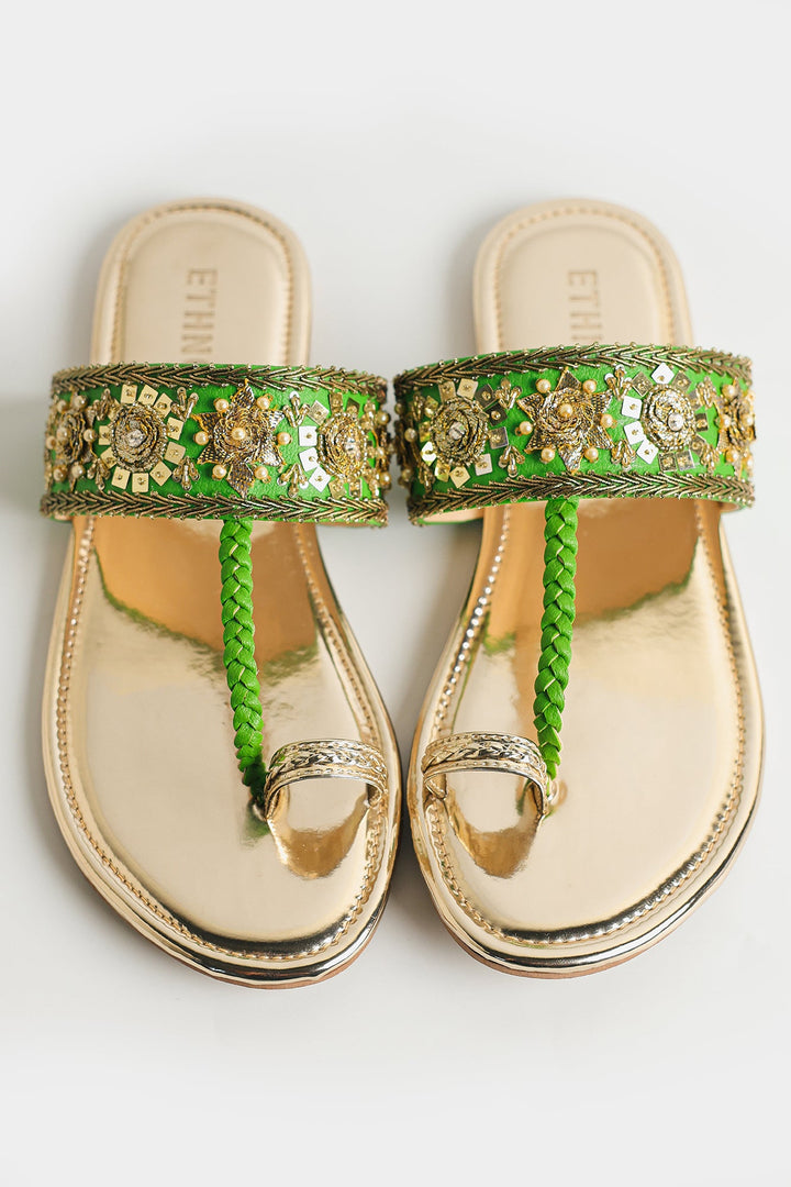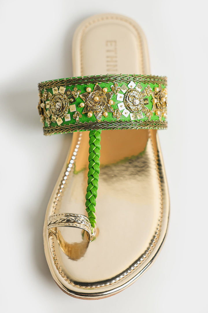A pair of stylish sandals with an elegant design has a metallic, reflective gold finish, giving them a luxurious and polished look. The straps are intricately embroidered with golden and colorful embellishments, including beads and threadwork, creating a rich, ornate pattern. These sandals are perfect for festive or traditional occasions, pairing well with ethnic or formal outfits.