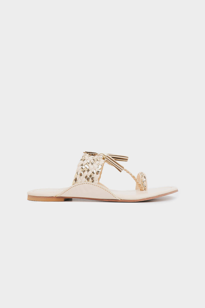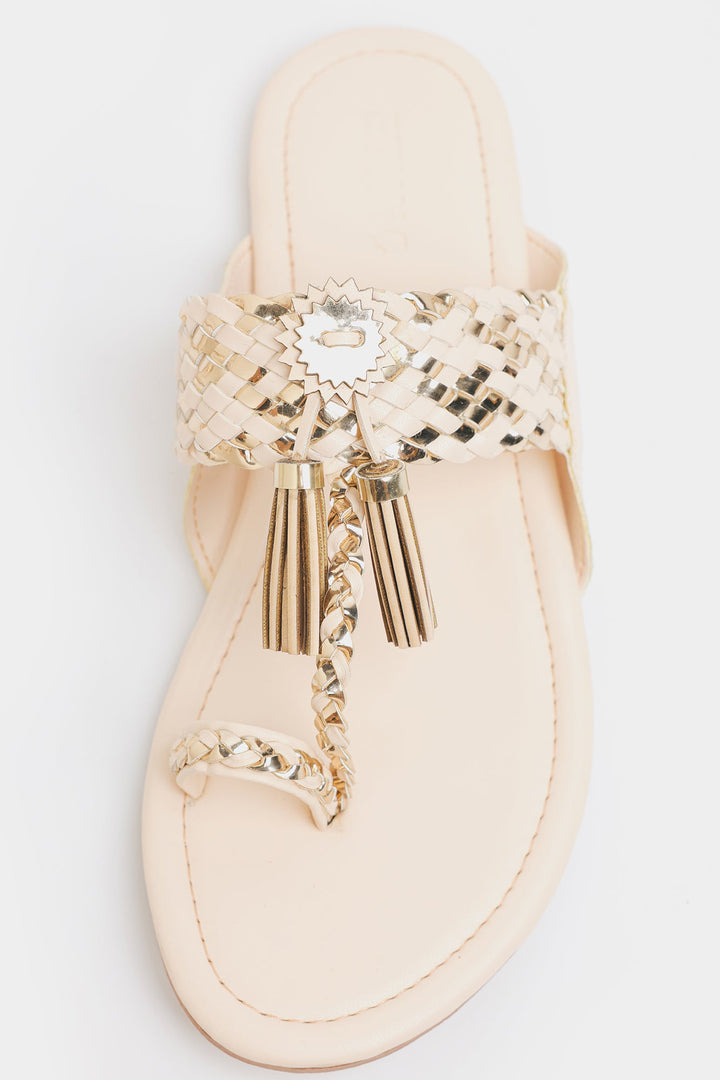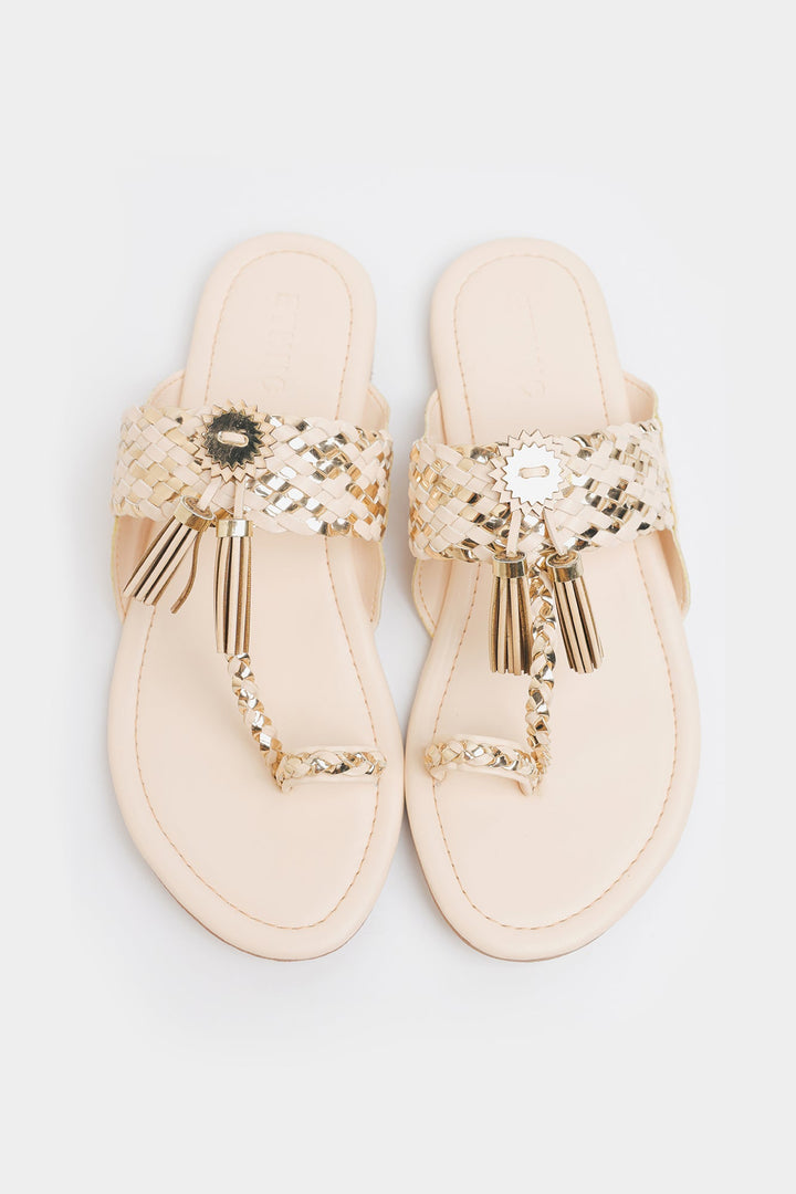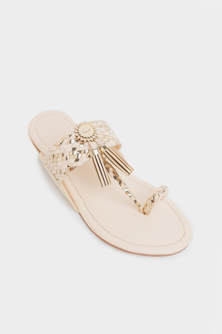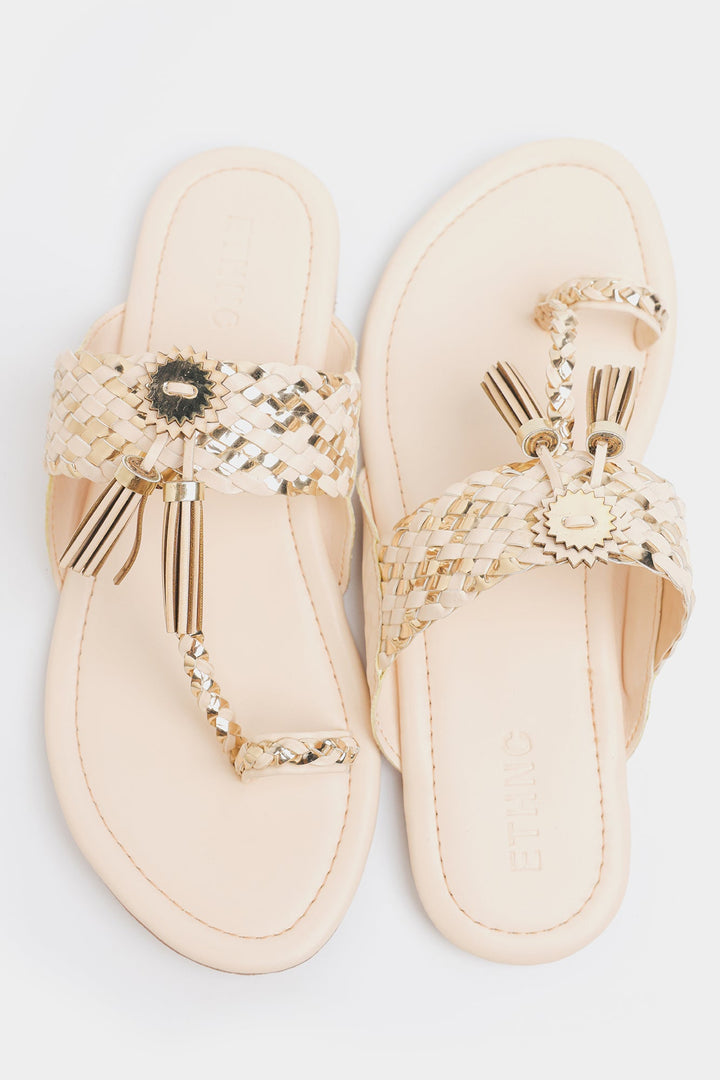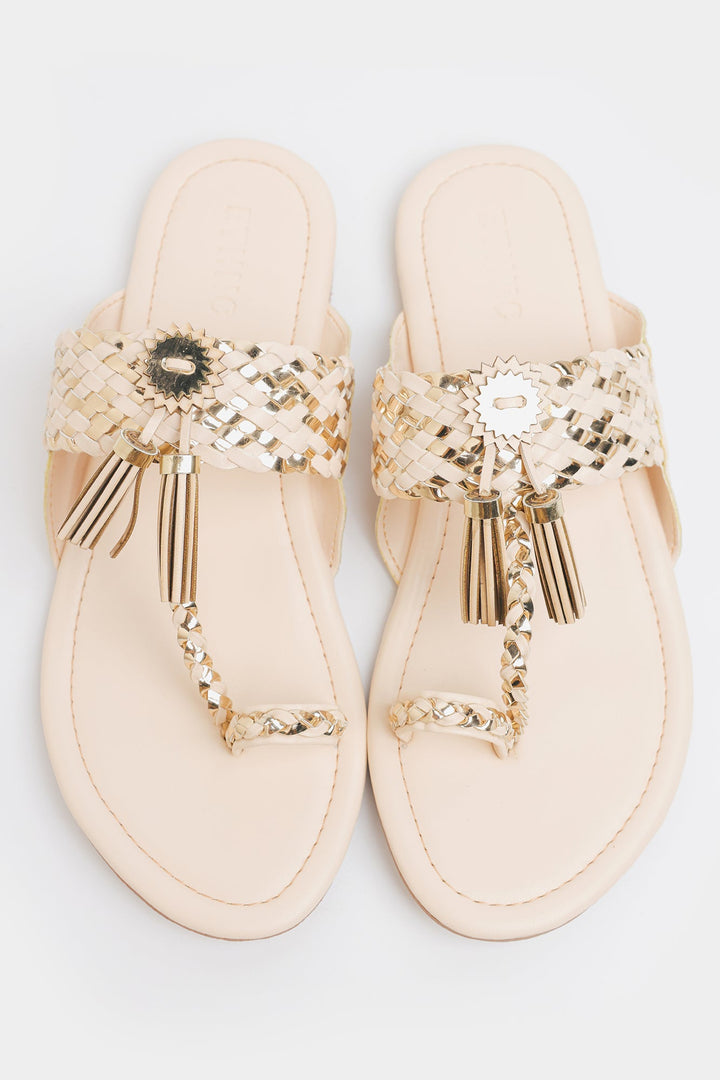 A pair of traditional yet stylish brown slip-on sandals with intricate woven detailing. The sandals have a vanilla ice base. A decorative metallic embellishment with tassel-like details is placed at the center of the strap, enhancing the ethnic or bohemian aesthetic. These sandals blend tradition with modern fashion, making them suitable for casual wear or festive occasions.