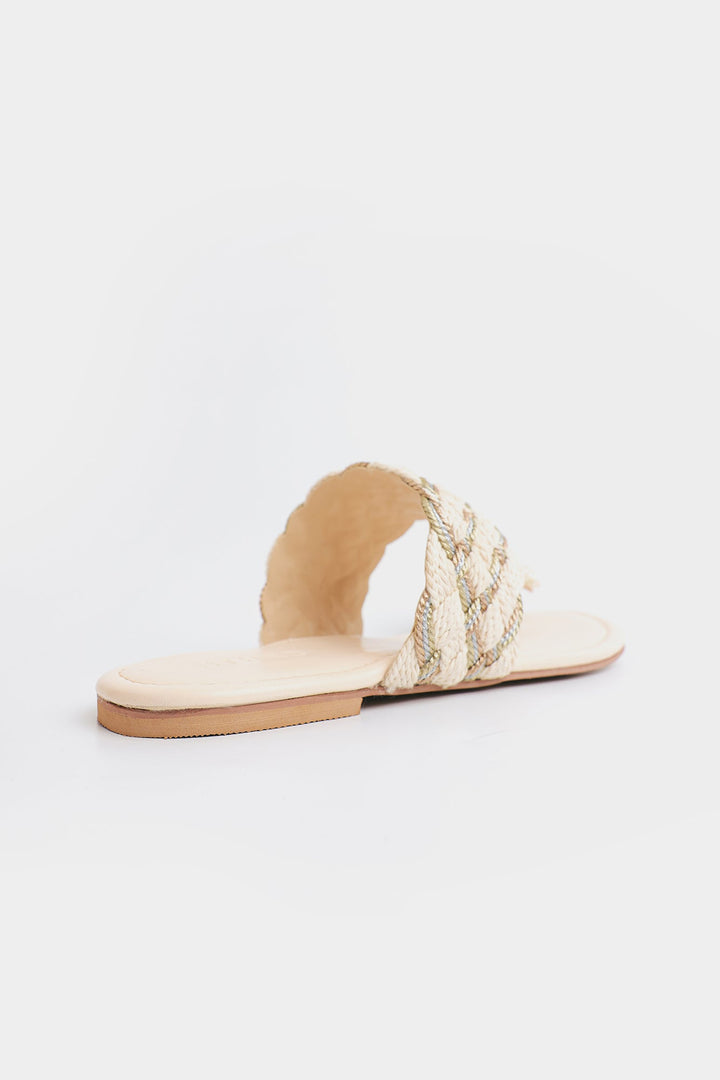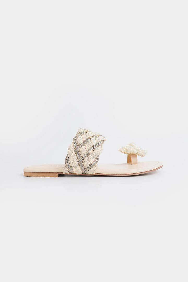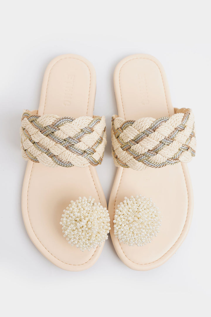 These are elegant vanilla ice slip-on khola puri with detailed weaving. The khola puri have a beige base and a center strap adorned with a metallic embellishment featuring woven-like designs, adding to its ethnic and bohemian charm. These sandals effortlessly combine tradition and contemporary fashion, perfect for both everyday and special occasions.