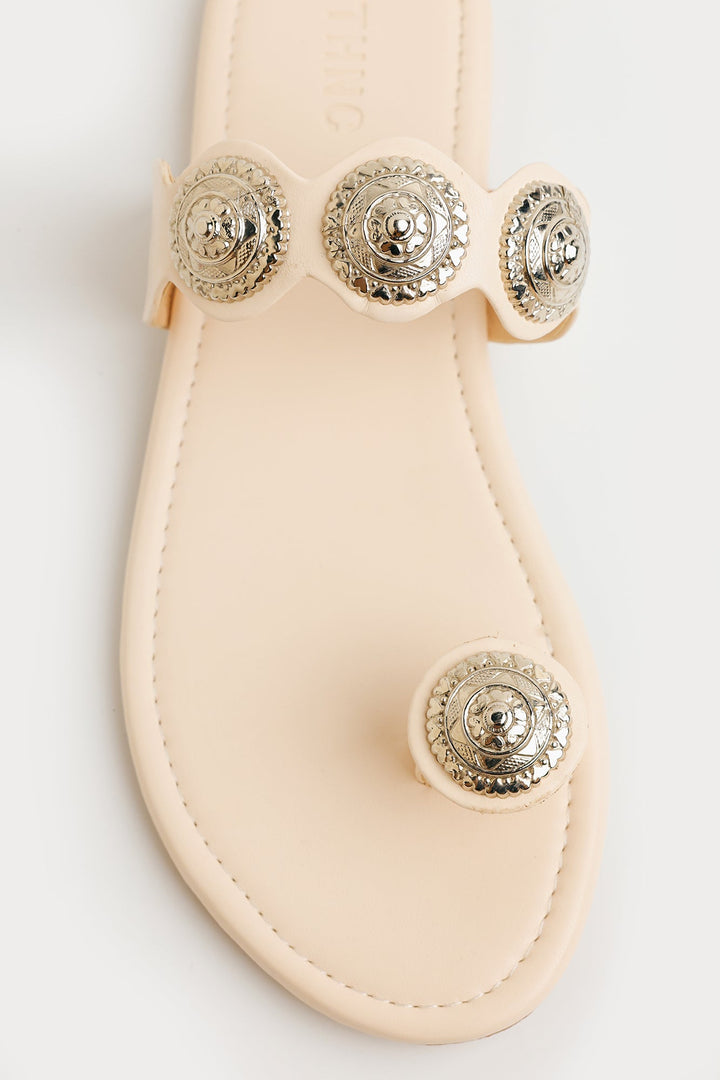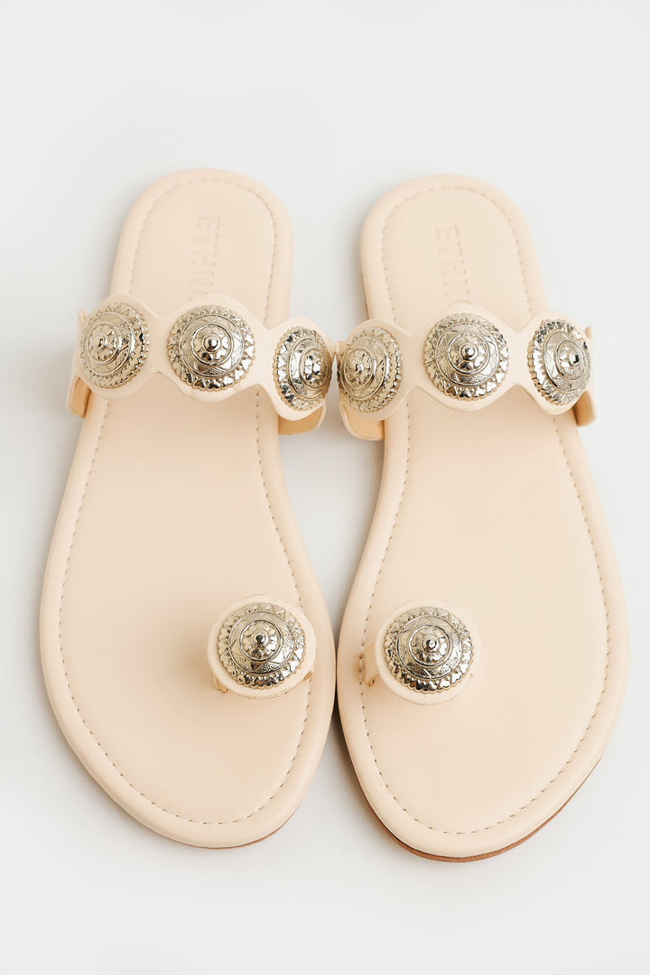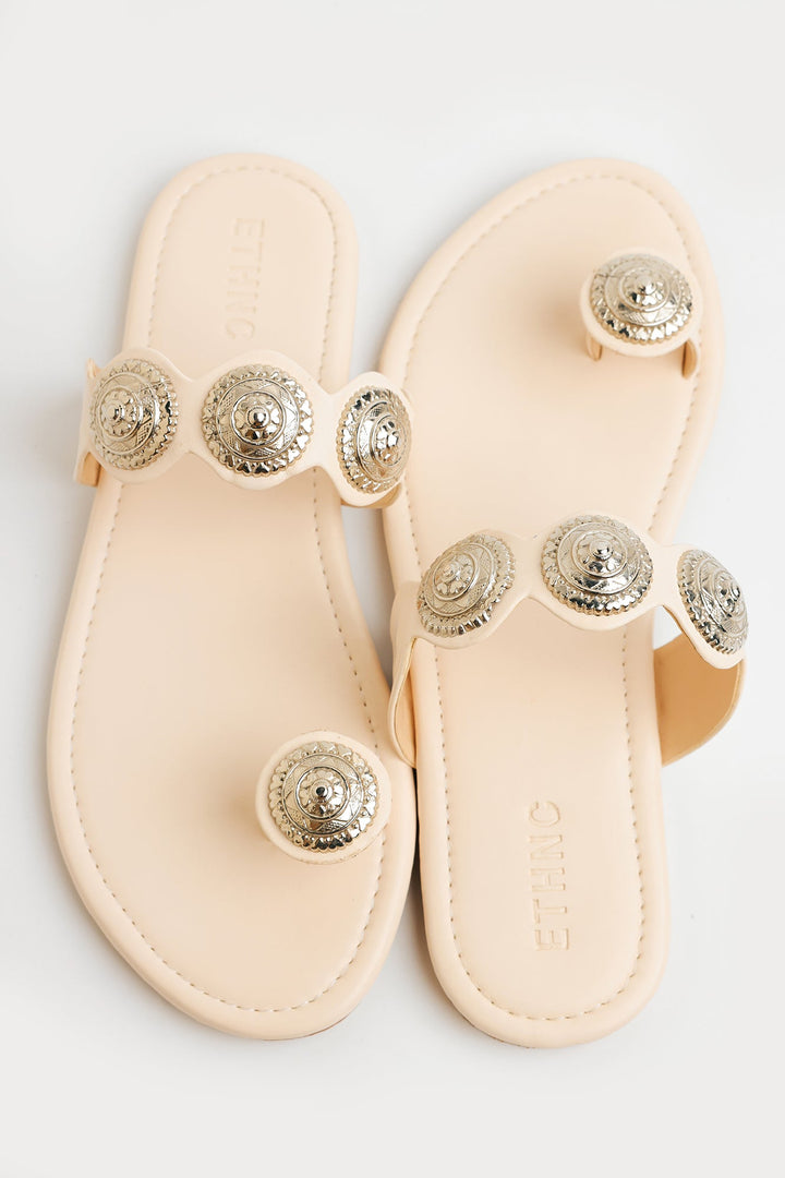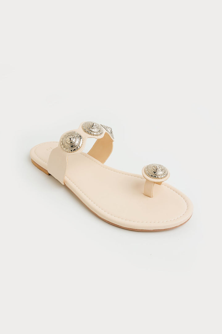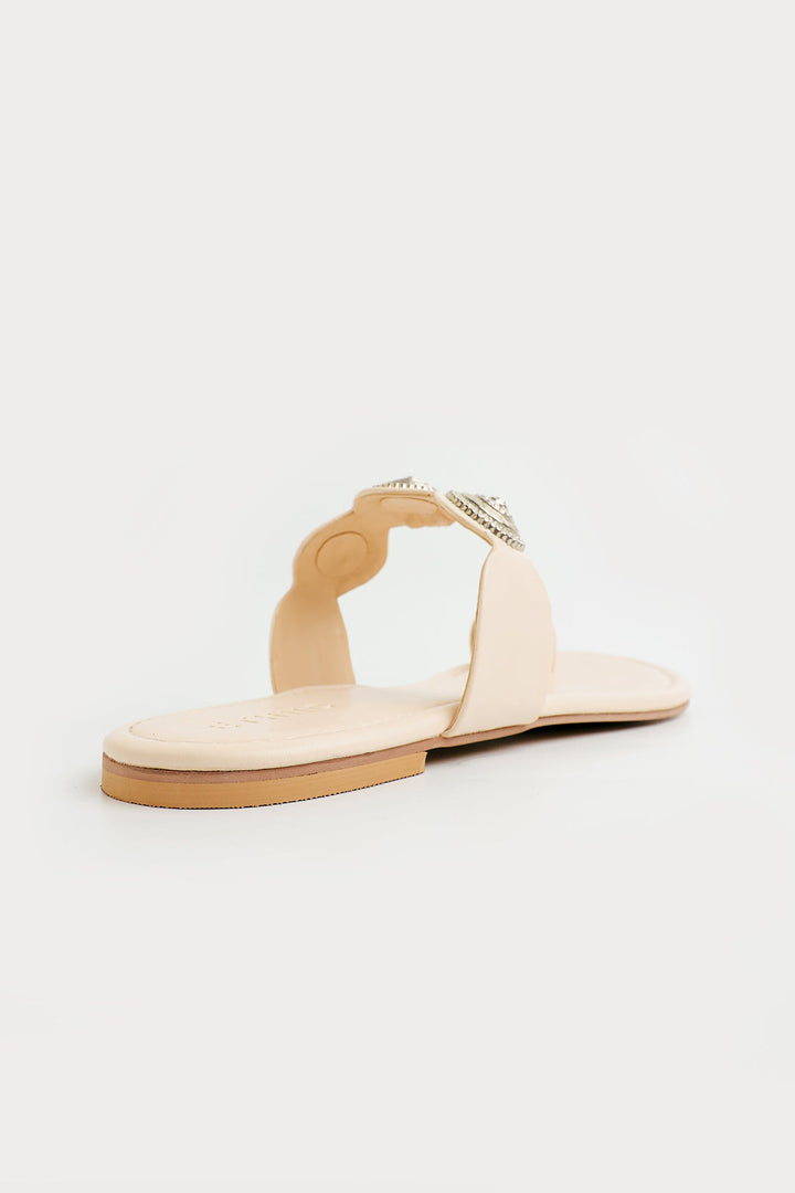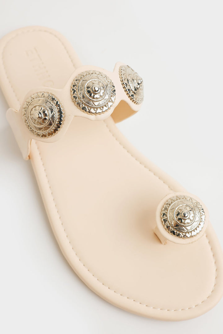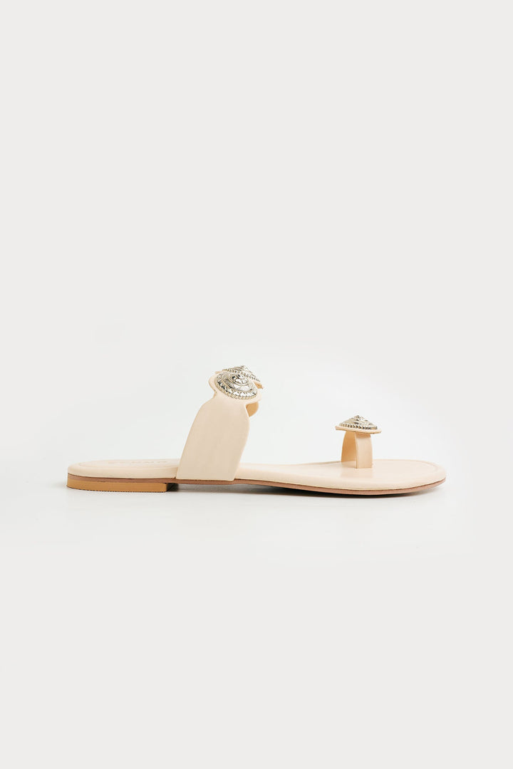 A stylish Kolhapuri with intricate metallic embellishments. The sandal has a soft pastel pink base with a minimalist design, with intricate detailing and elaborate engravings and small dangling beads, adding a luxurious and traditional touch. This footwear combines modern comfort with a hint of ethnic or bohemian elegance, making it perfect for festive or casual chic looks.