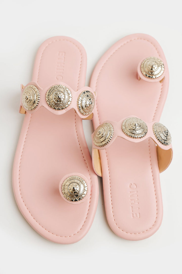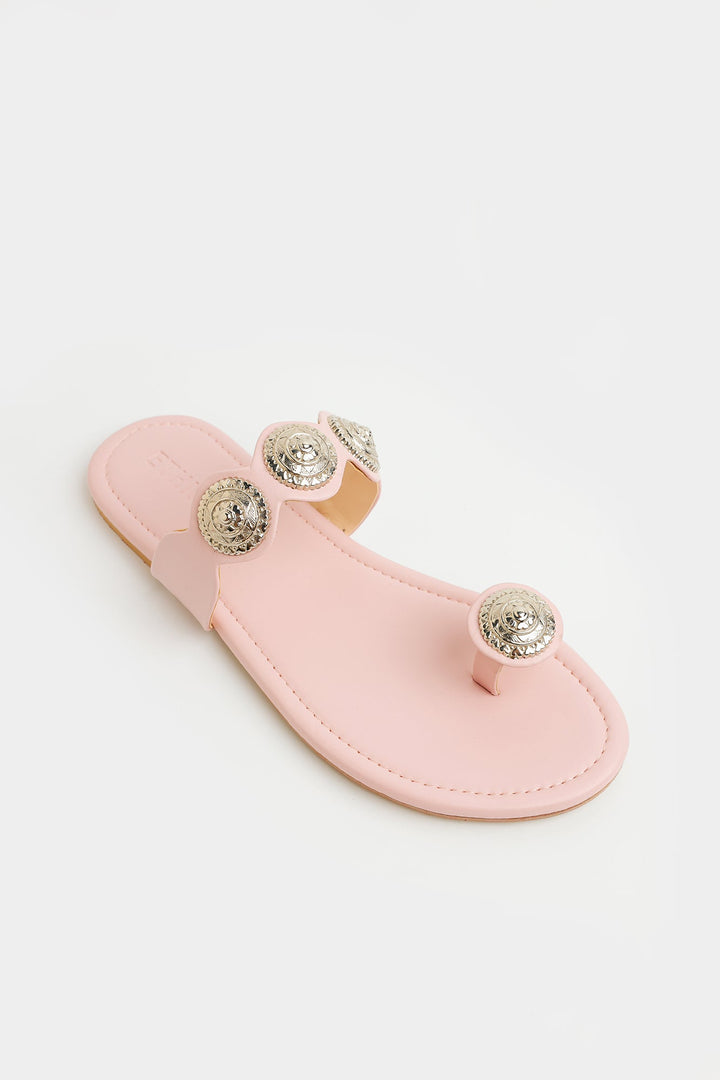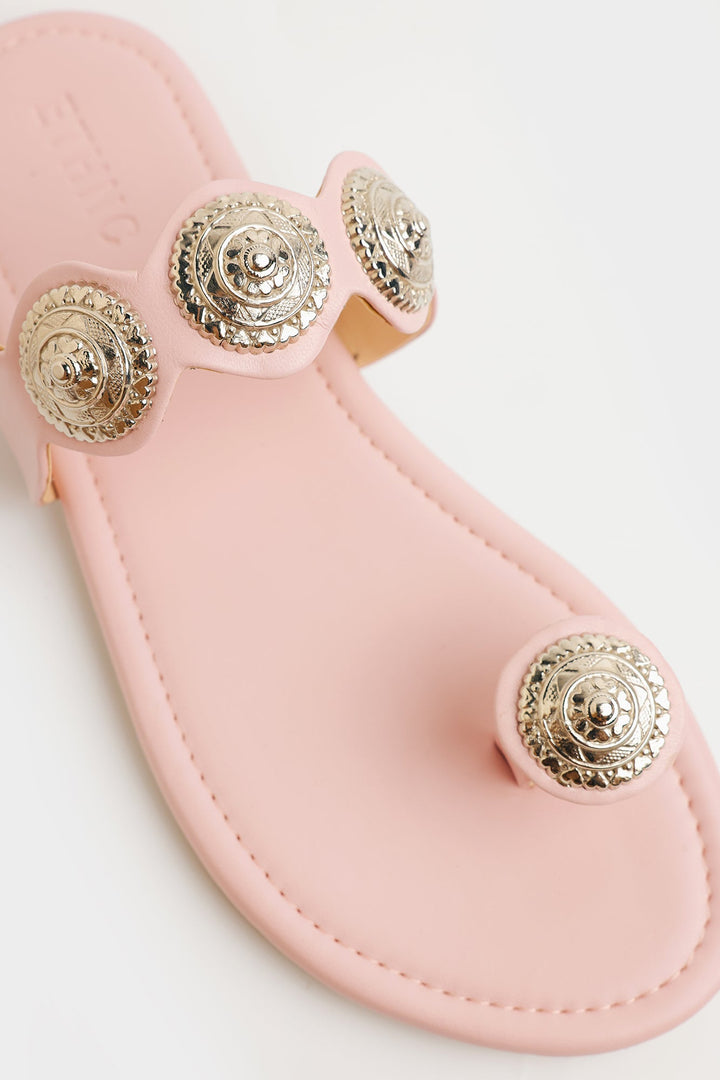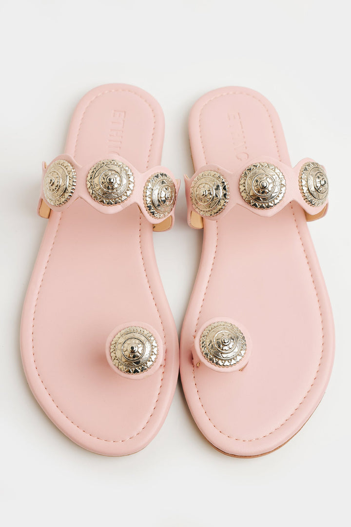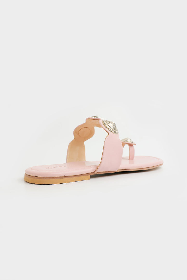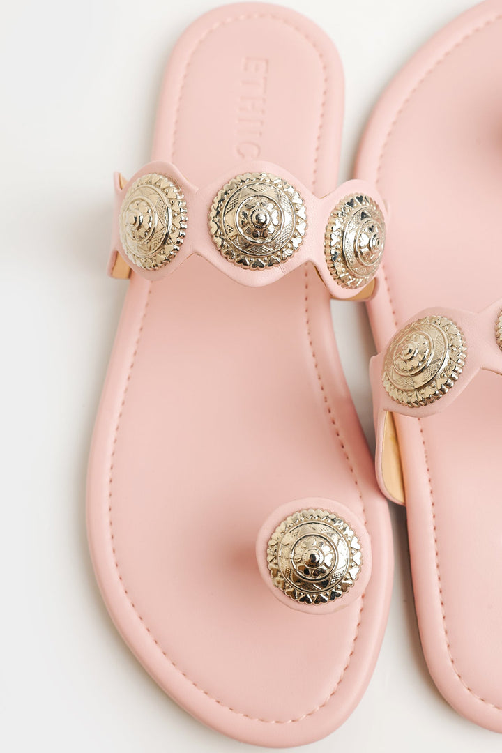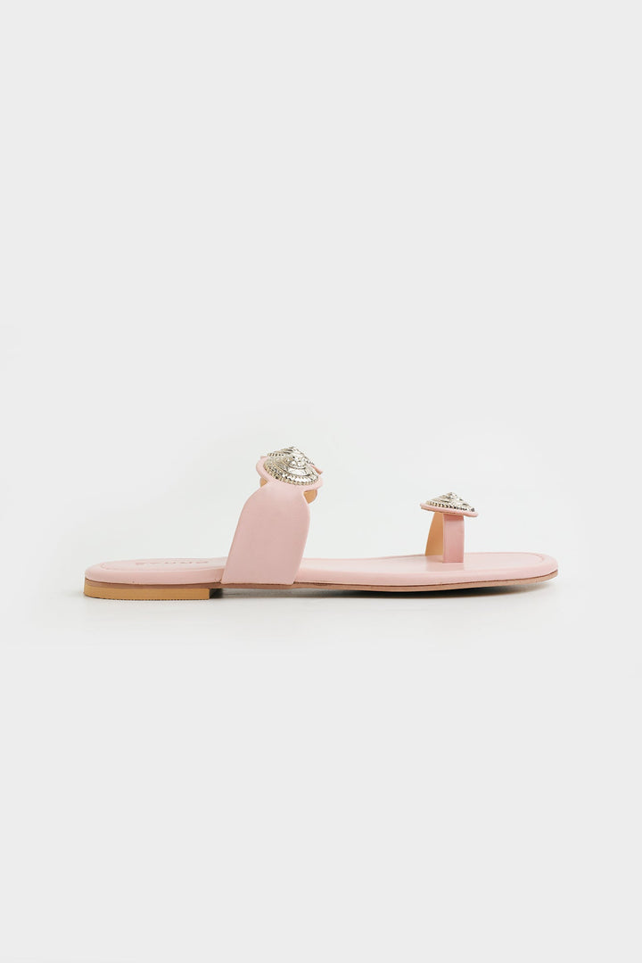 A stylish pink Kolhapuri with intricate metallic embellishments. The sandal has a soft pastel pink base with a minimalist design, with intricate detailing with elaborate engravings and small dangling beads, adding a luxurious and traditional touch. This footwear combines modern comfort with a hint of ethnic or bohemian elegance, making it perfect for festive or casual chic looks.