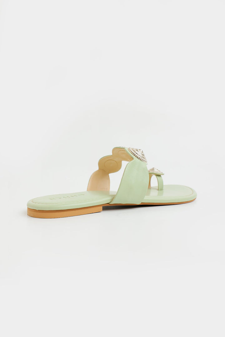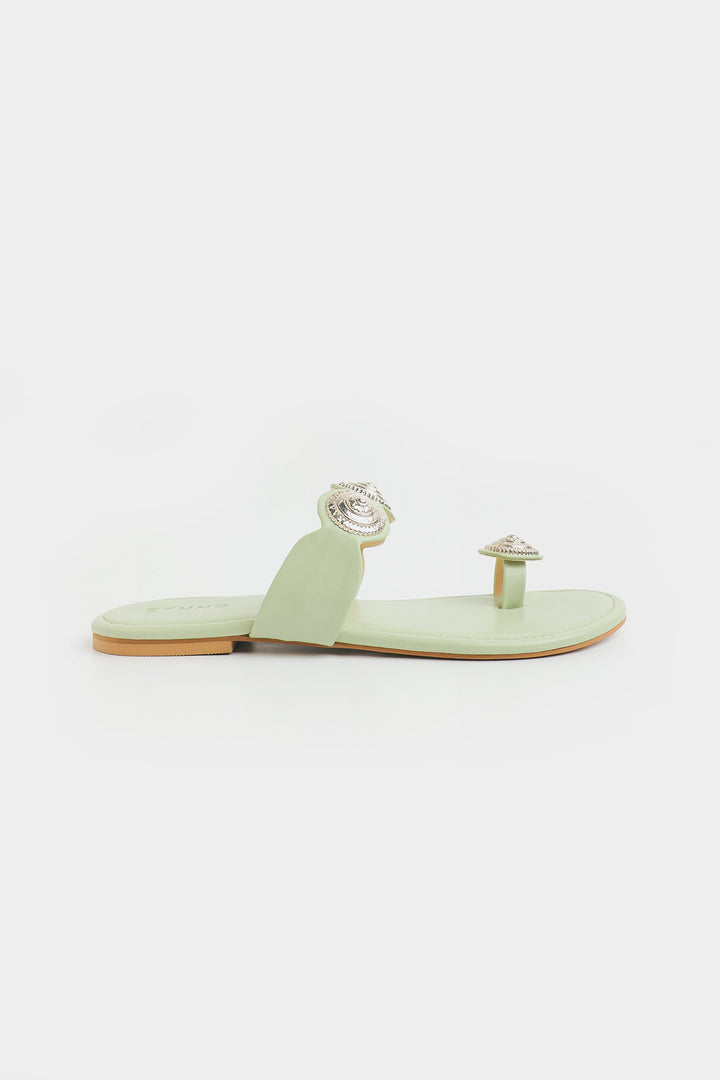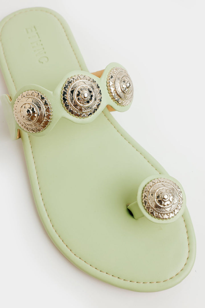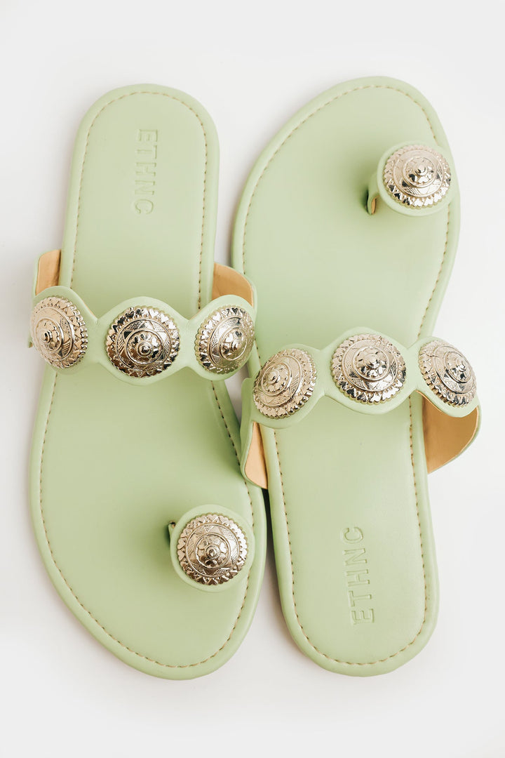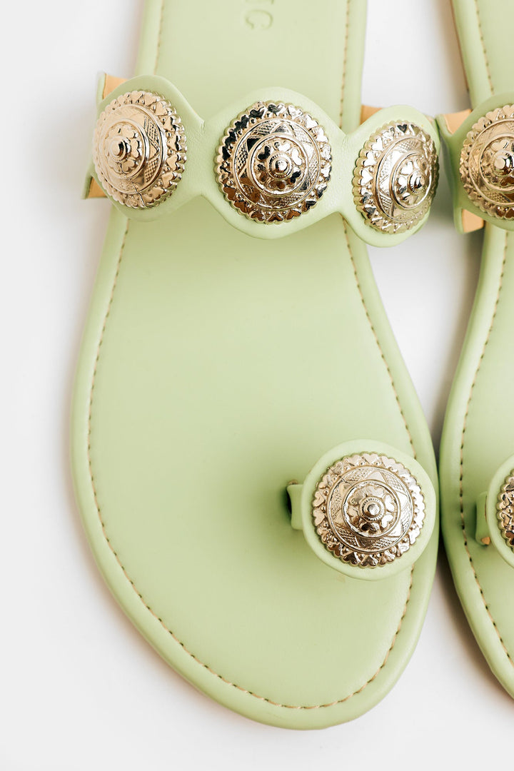 A distinctive design element is the row of ornate, circular gold embellishments adorning the upper strap and the toe loop. These embellishments have intricate detailing, giving them a regal, antique-inspired look. The toe loop is also decorated with a matching gold ornament, adding to the overall luxurious aesthetic.
