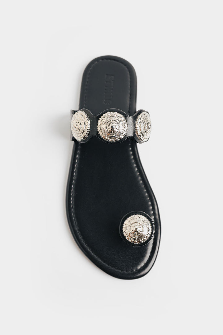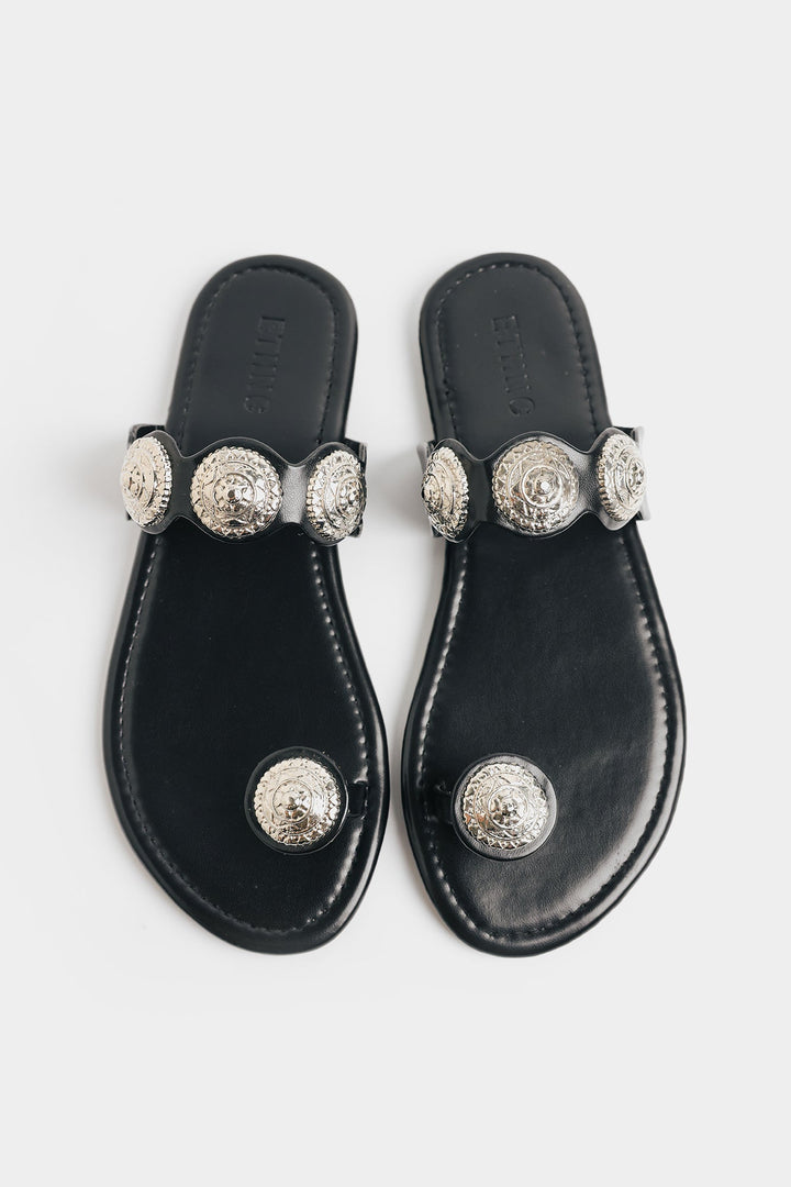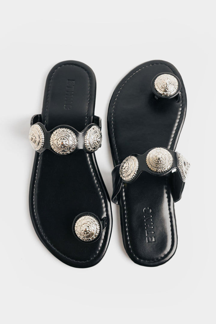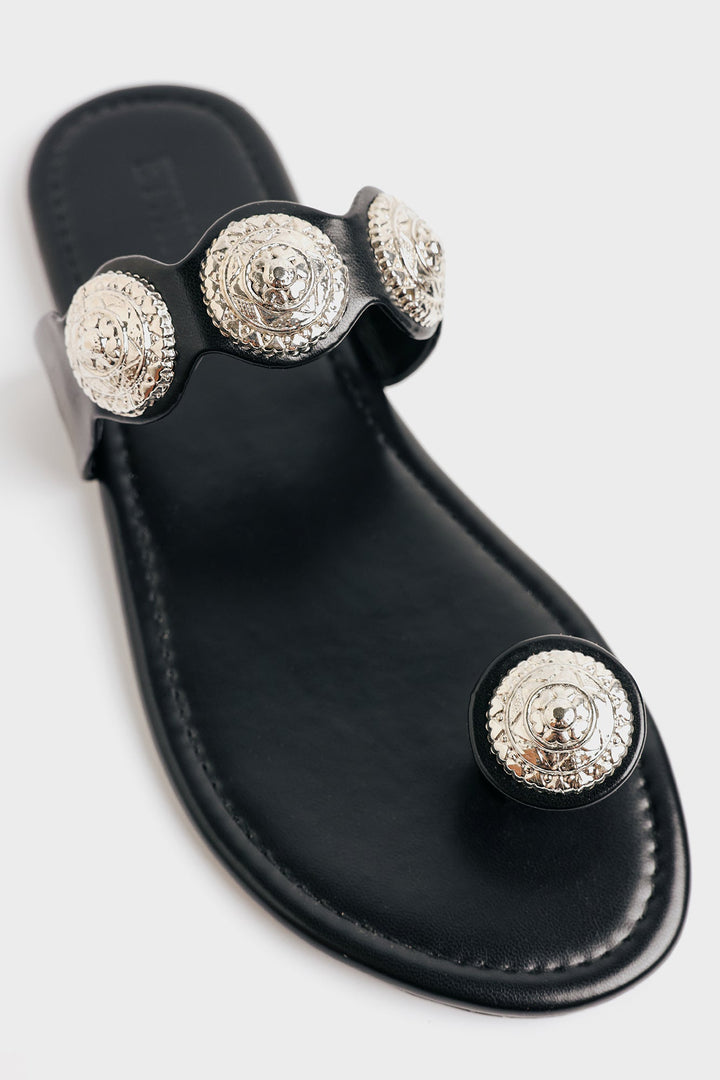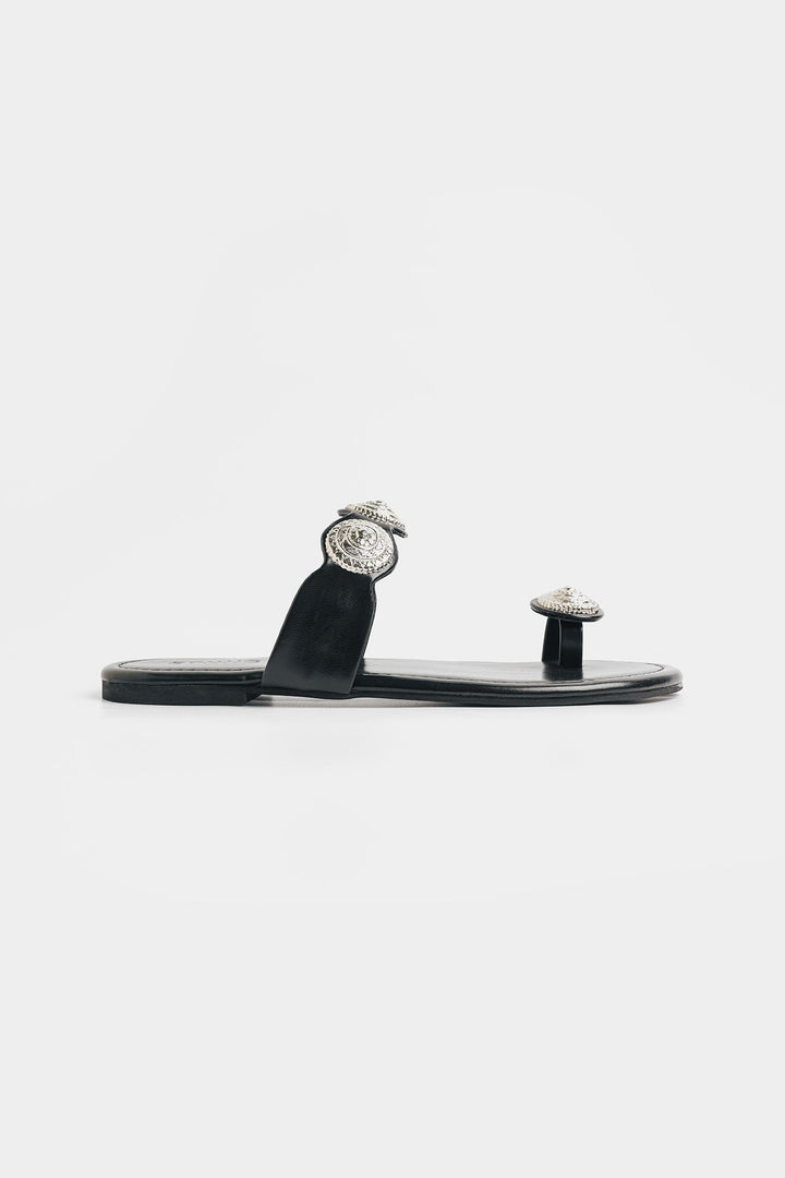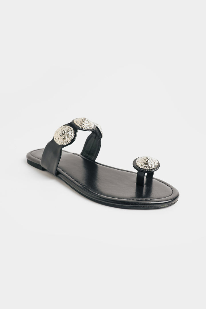 A stylish Khola puri with intricate metallic embellishments. This has a black base with a minimalist design, with intricate detailing with elaborate engravings, adding a luxurious and traditional touch. This footwear combines modern comfort with a hint of ethnic or bohemian elegance, making it perfect for festive or casual chic looks.