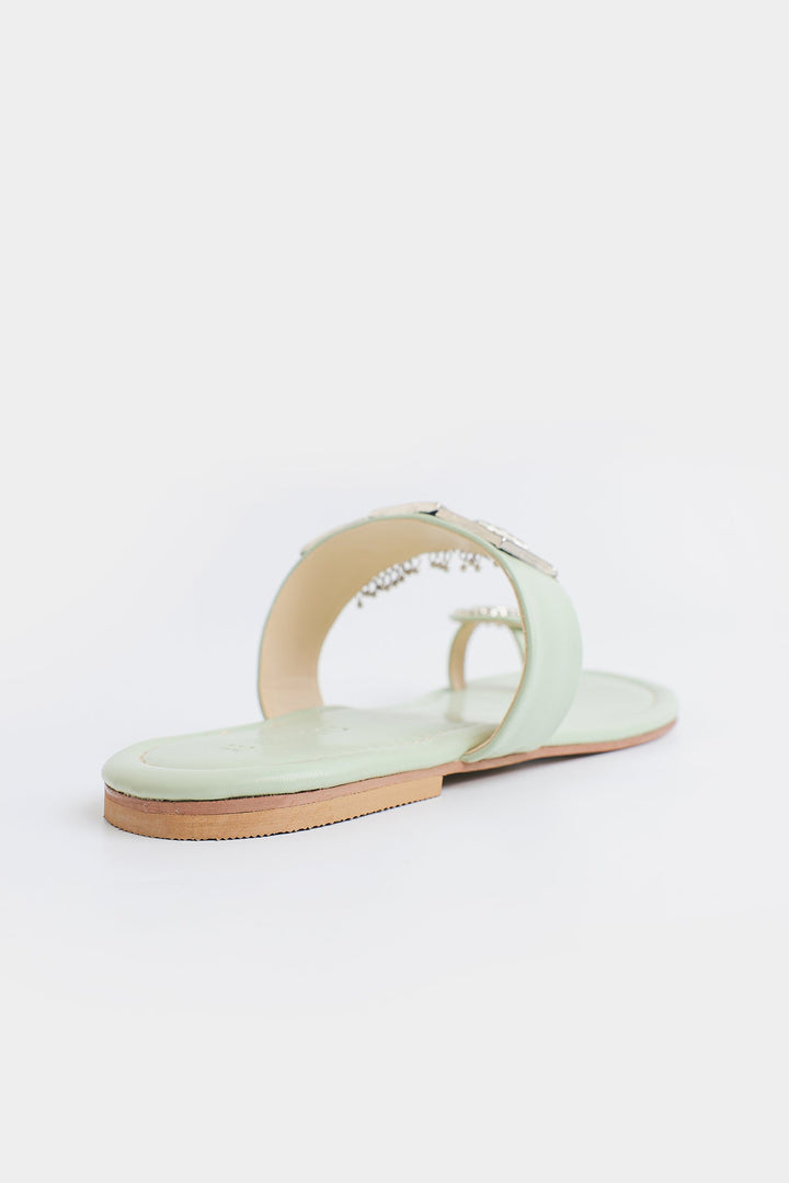 A stylish pastel green khola puri with intricate metallic embellishments. The sandal has a pastel green base with a minimalist design, with intricate detailing with elaborate engravings and small dangling beads, adding a luxurious and traditional touch. This footwear combines modern comfort with a hint of ethnic or bohemian elegance, making it perfect for festive or casual chic looks.