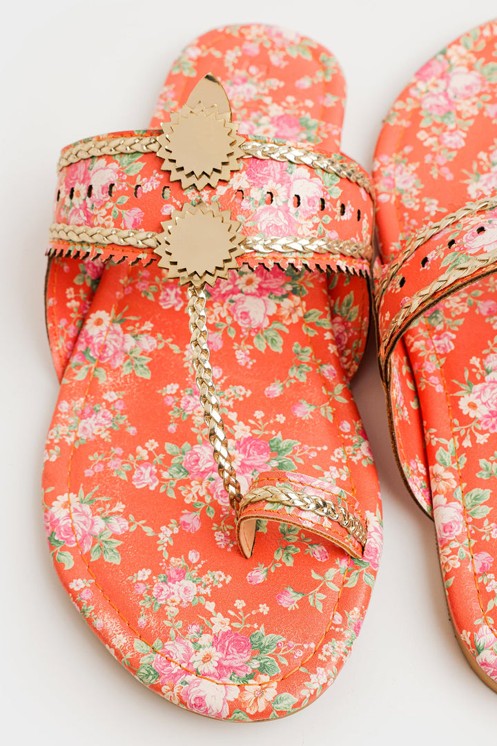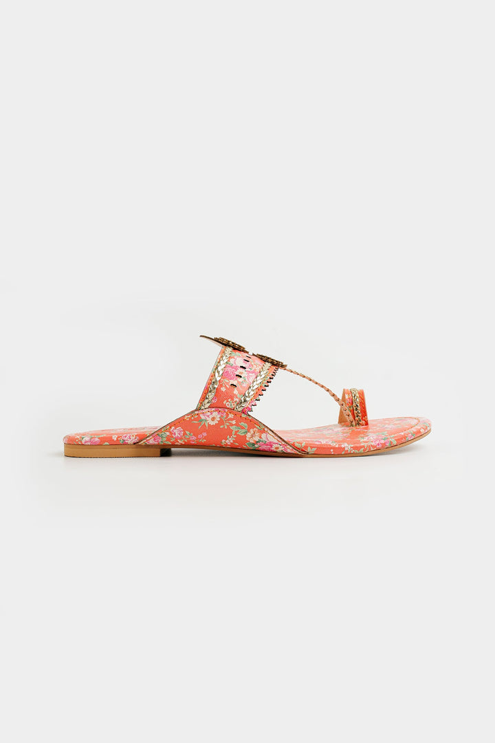 Enhance your look with our stunning khola puri, featuring dazzling strap design in vibrant peach color and enhanced with dazzling tropical prints. Made with fine quality materials, this traditional khola puri will elevate any outfit. Stand out with this unique and eye-catching footwear option.