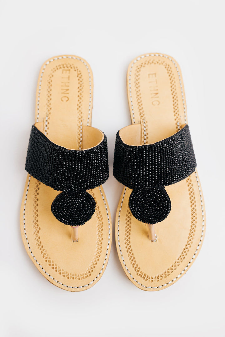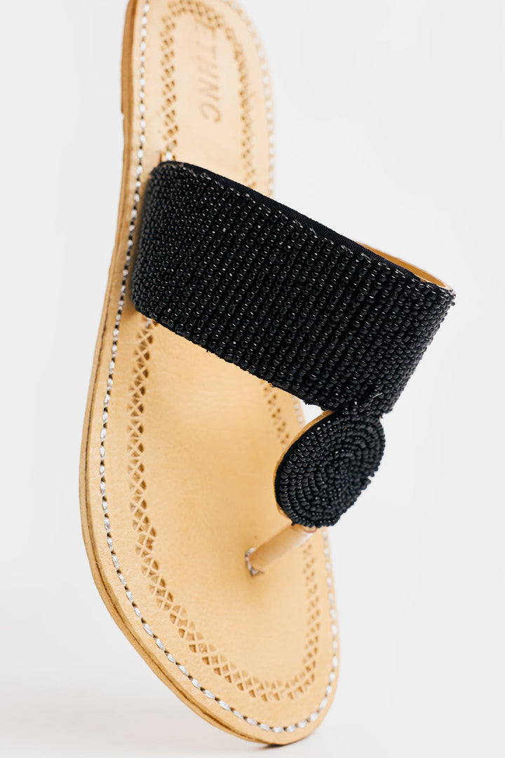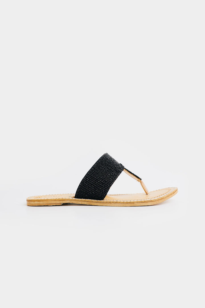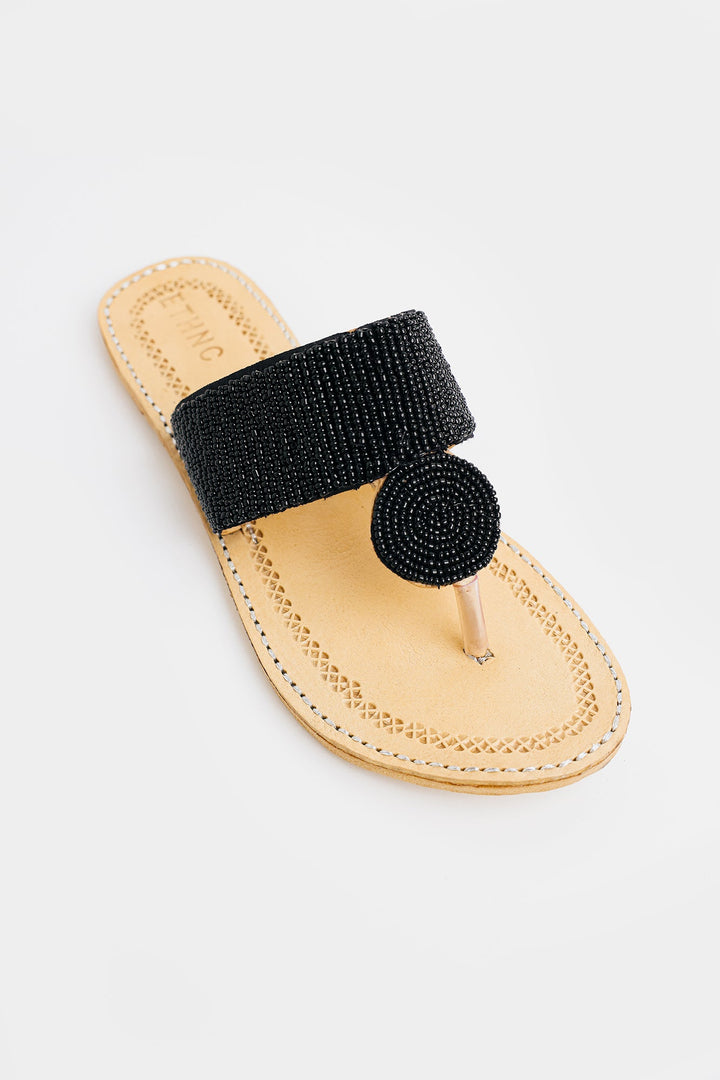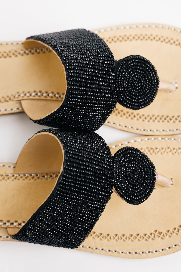 Enhance your look with our stunning khola puri, featuring round strap with beads design in vibrant black color. Made with fine quality materials, this traditional khola puri will elevate any outfit. Stand out with this unique and eye-catching footwear option.