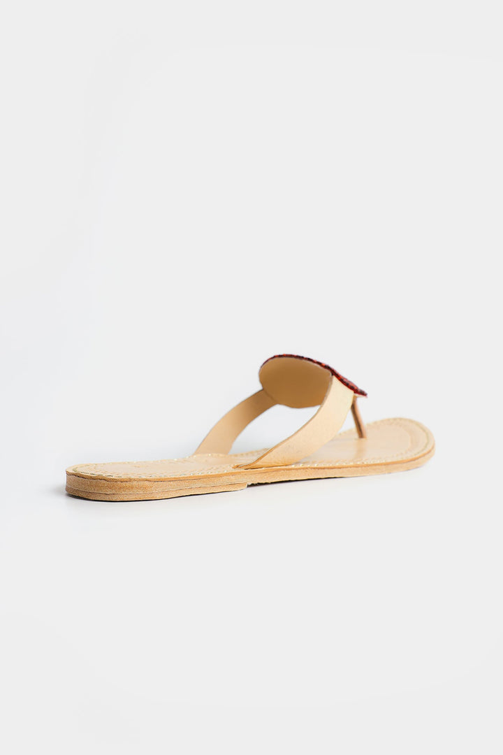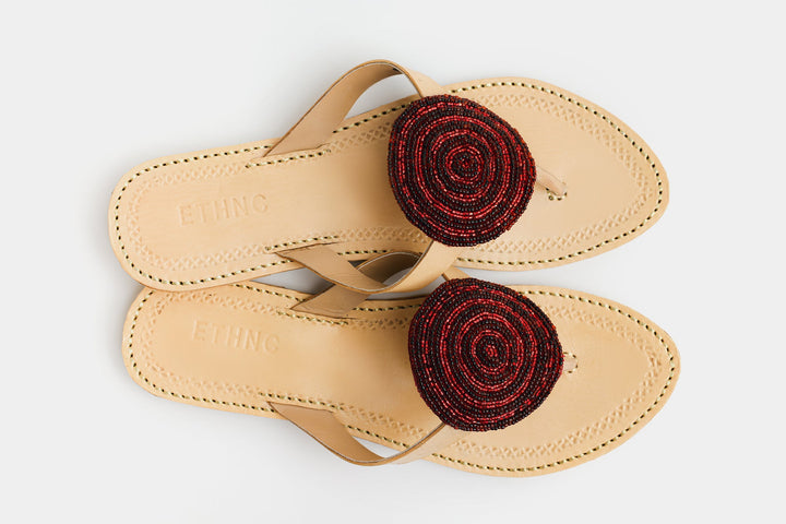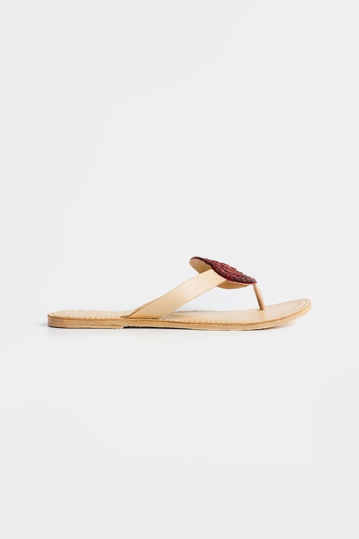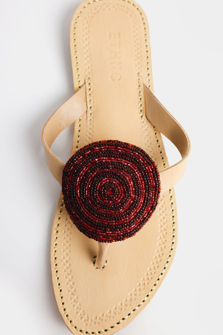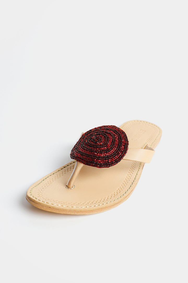 Enhance your look with our stunning khola puri, featuring a red beaded circle design. Made with fine quality materials, this traditional khola puri will elevate any outfit. Stand out with this unique and eye-catching footwear option.