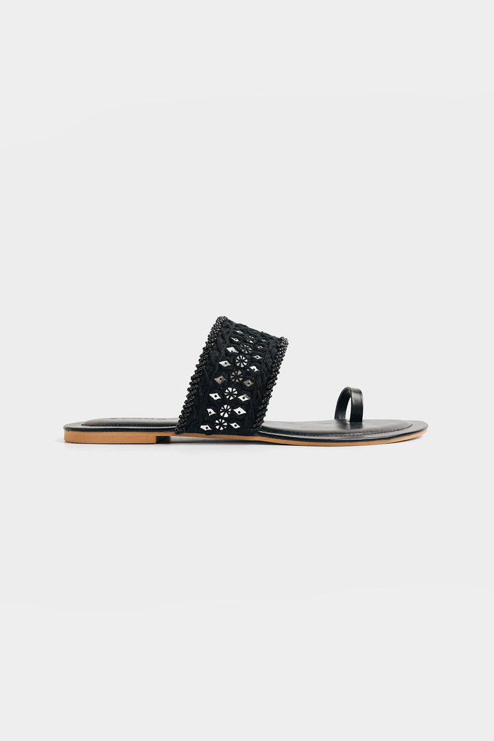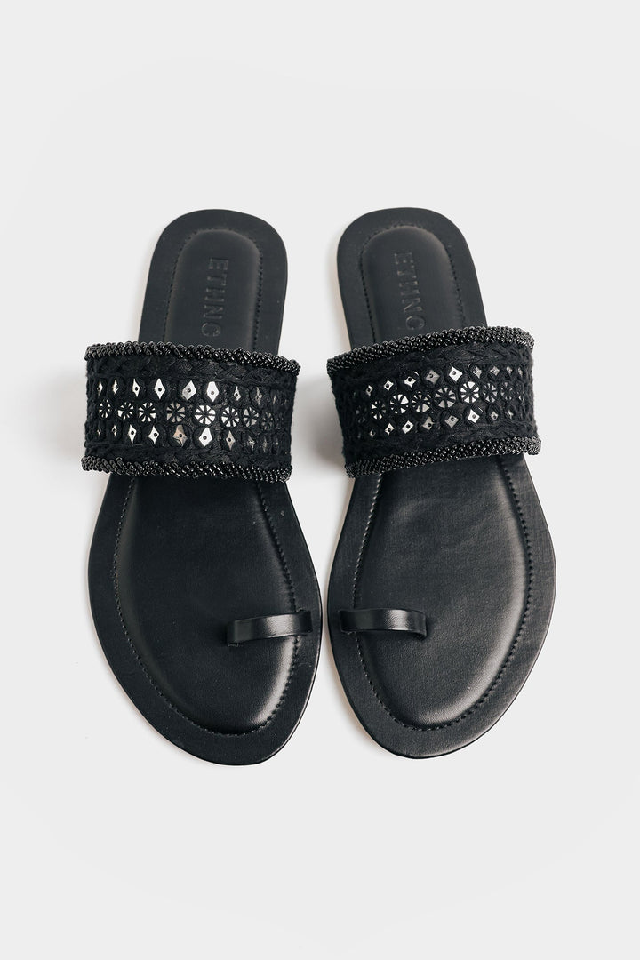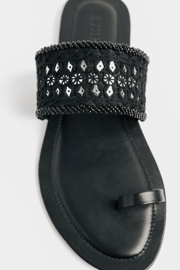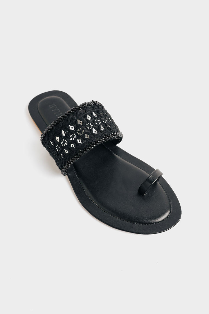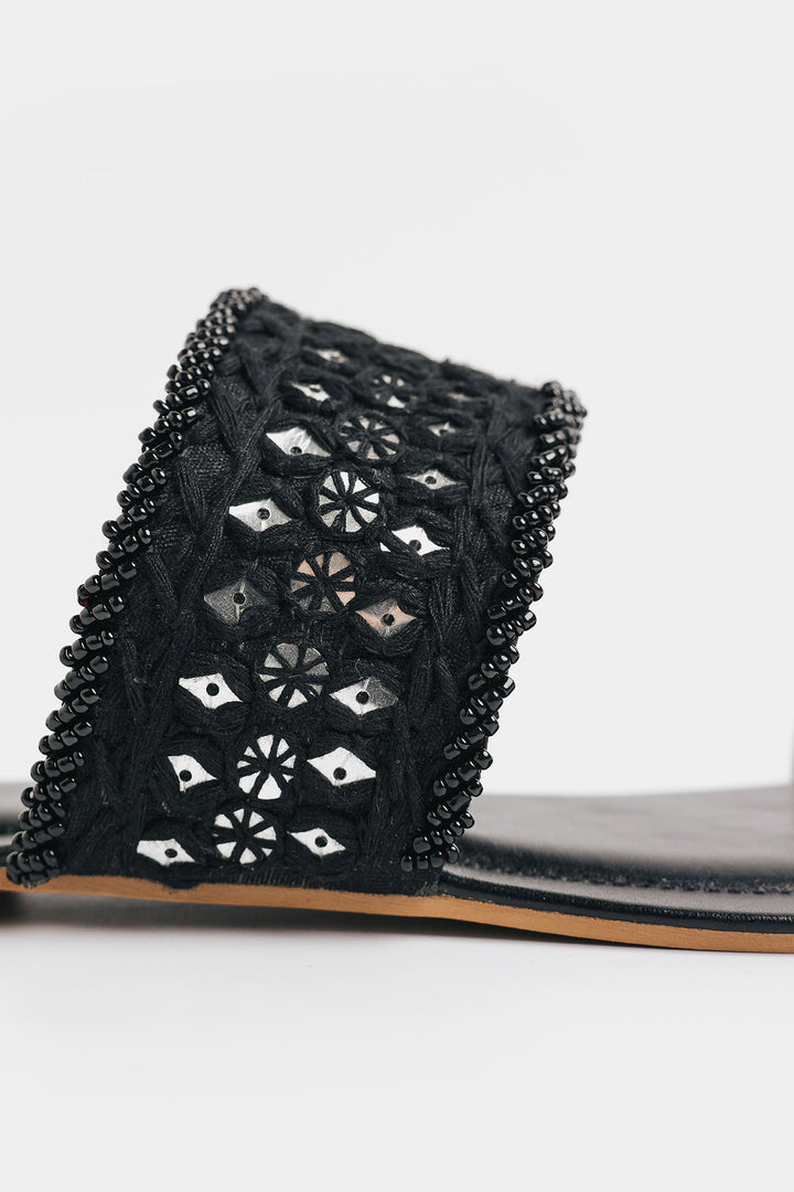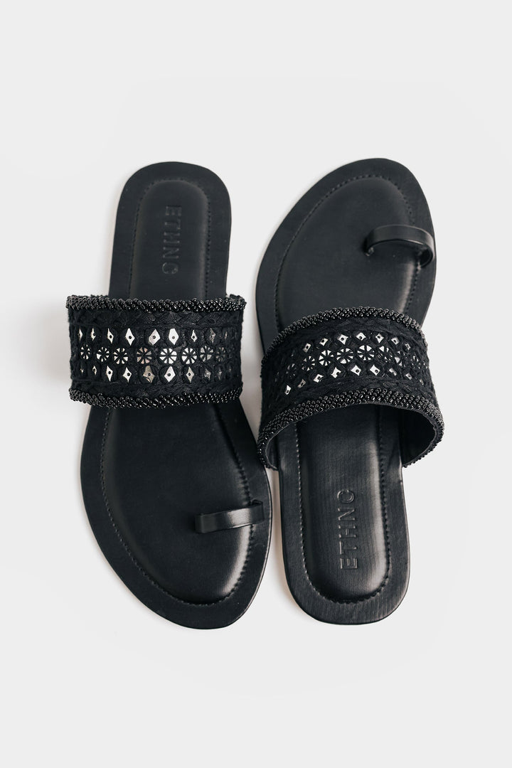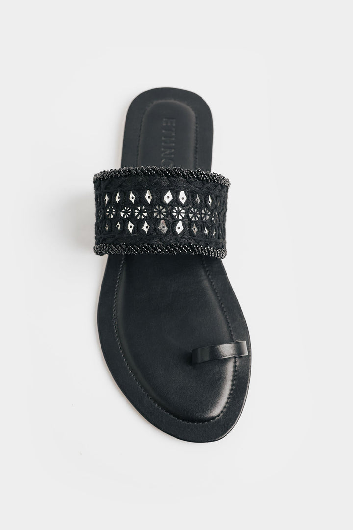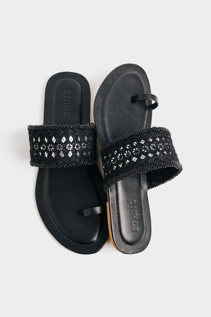 Add a touch of elegance to your look with khola puri. The black color and mirrored work on the strap will elevate any outfit. Expertly crafted for style and comfort, these sandals are a must-have for any fashion-forward individual.