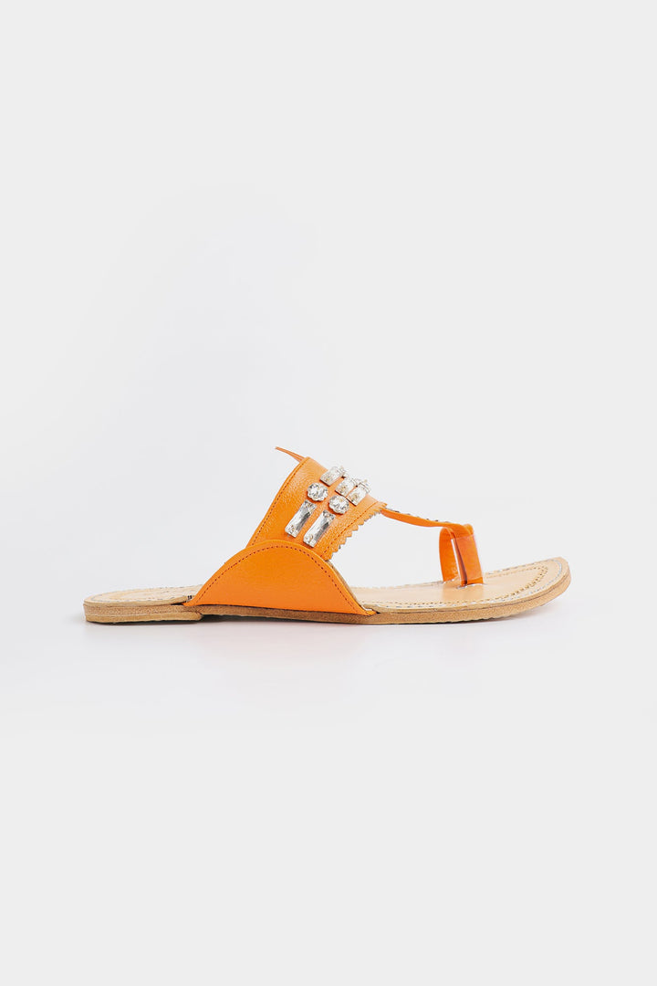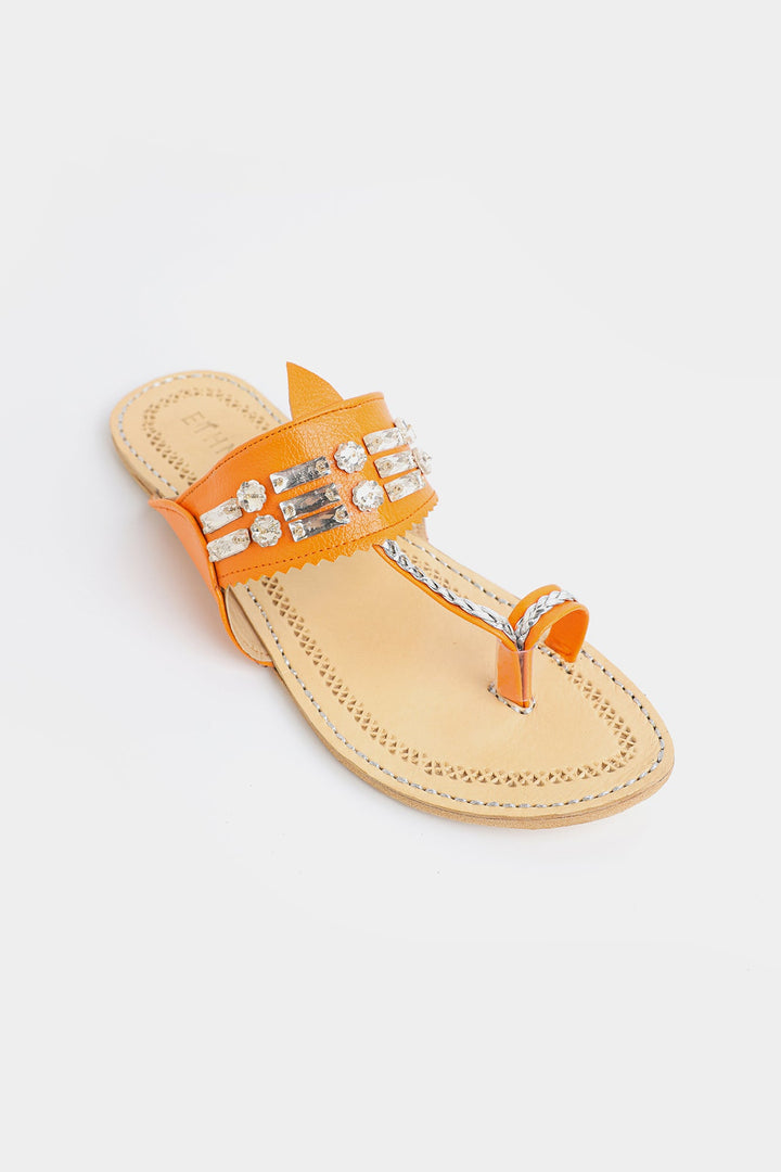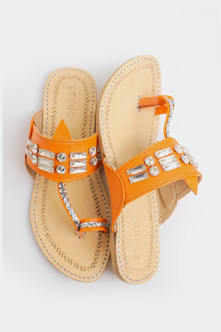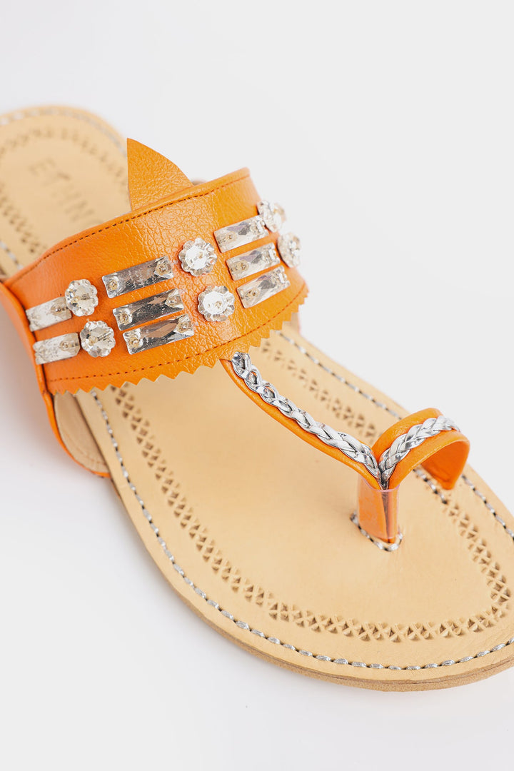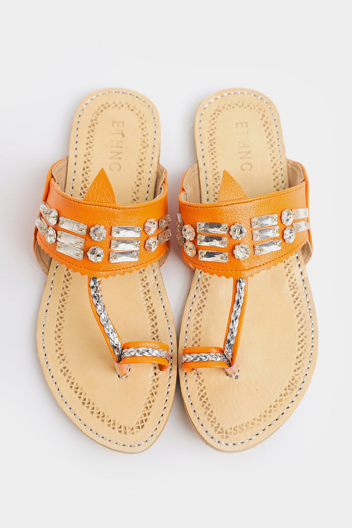 Enhance your look with our stunning khola puri, featuring dazzling strap design in orange color. Made with fine quality materials, this traditional khola puri will elevate any outfit. Stand out with this unique and eye-catching footwear option.