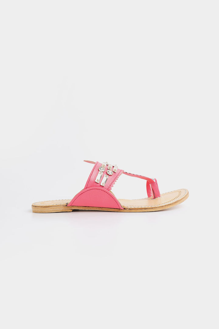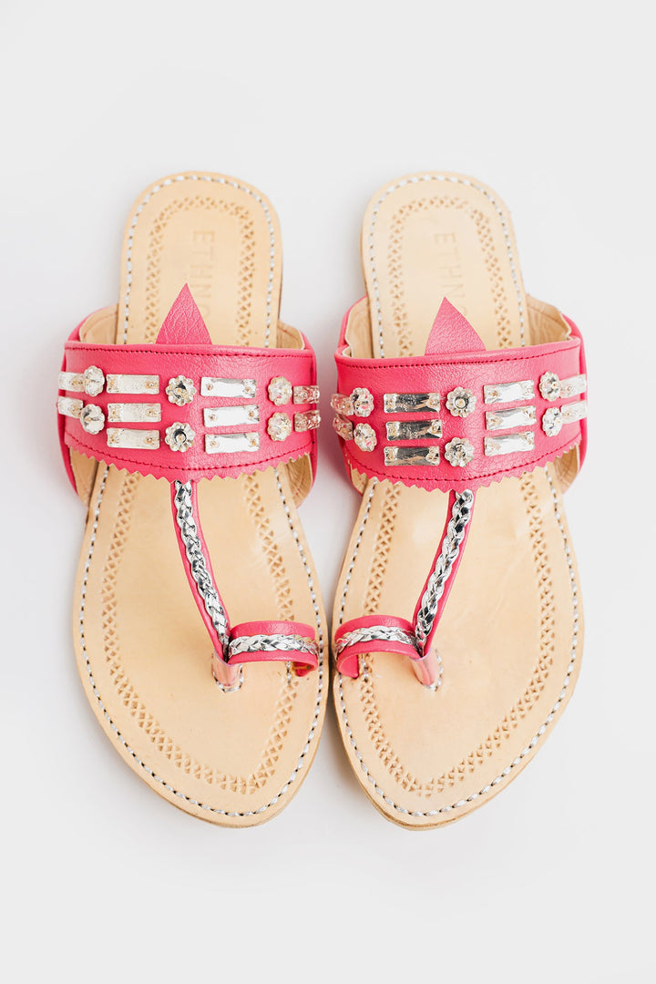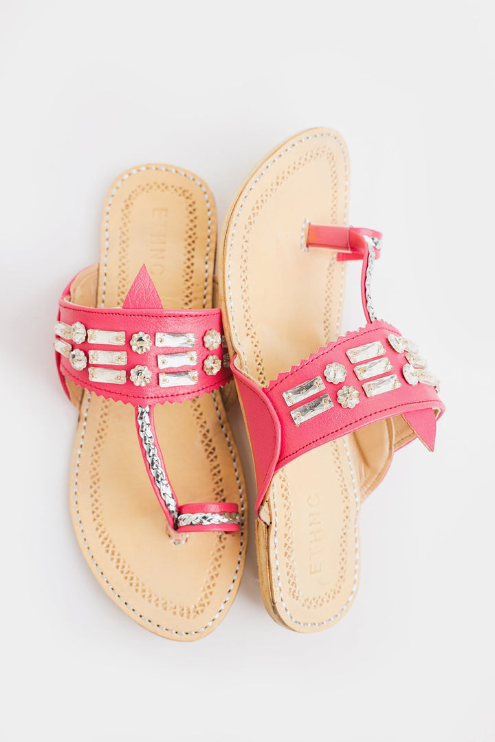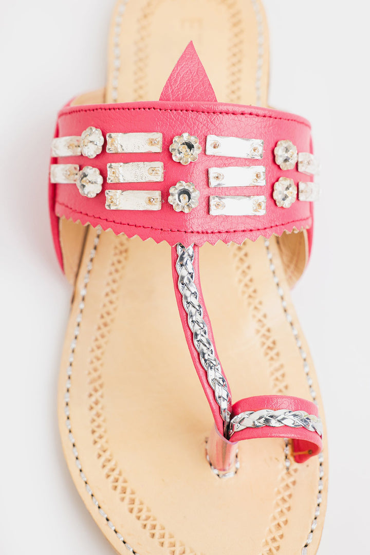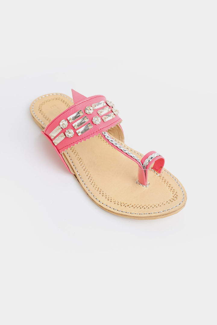 Enhance your look with our stunning khola puri, featuring dazzling strap design in pink color. Made with fine quality materials, this traditional khola puri will elevate any outfit. Stand out with this unique and eye-catching footwear option.