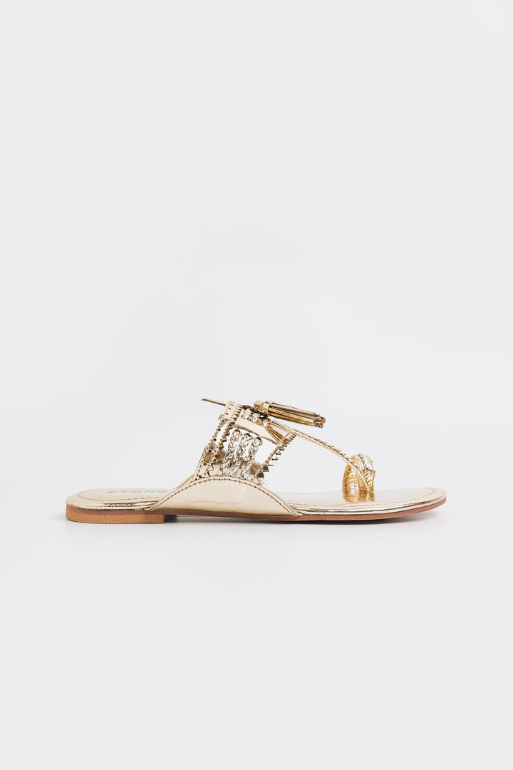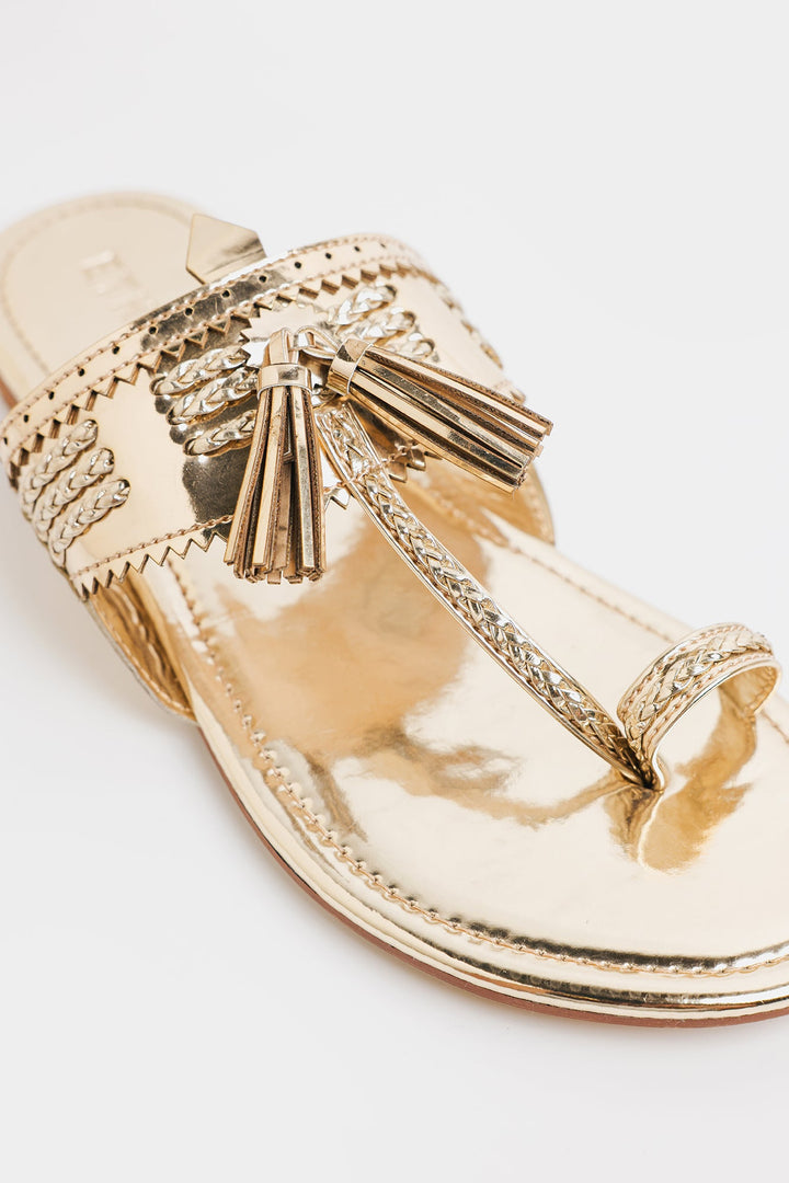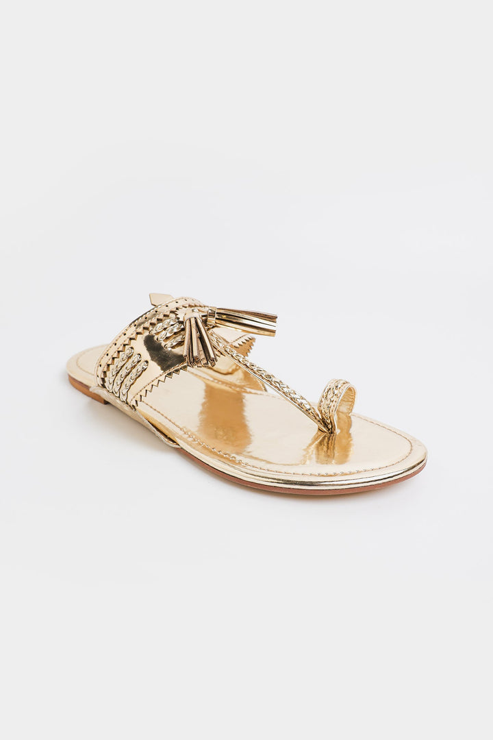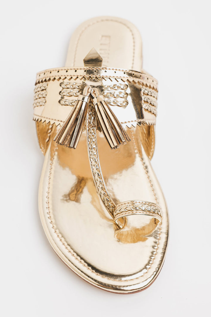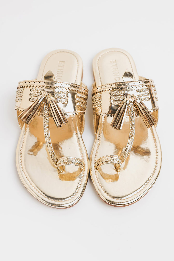 Showcasing a traditional design, This khola puri is a must-have addition to any wardrobe. The golden khola puri adds a touch of sophistication while the tassels on the strap provide a playful element. Elevate any outfit with this stylish and versatile sandal.