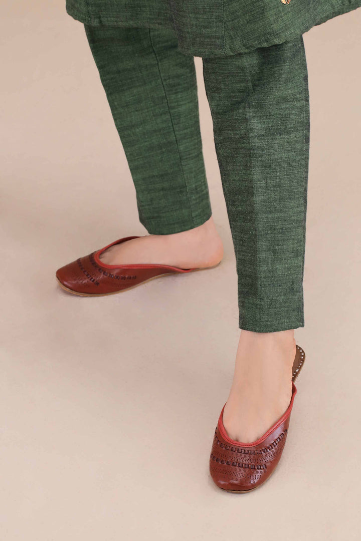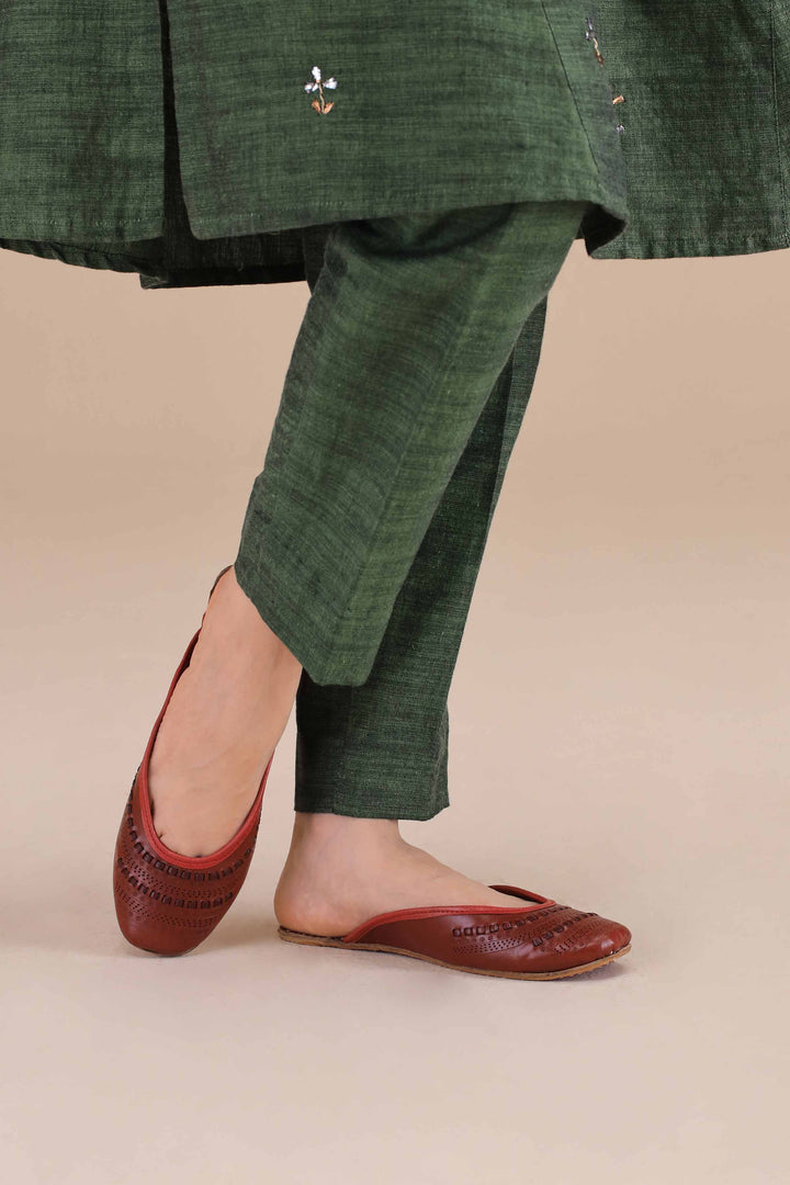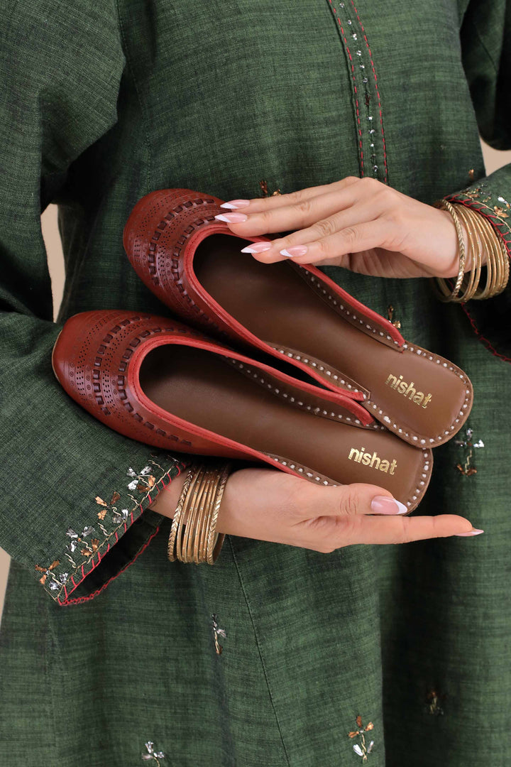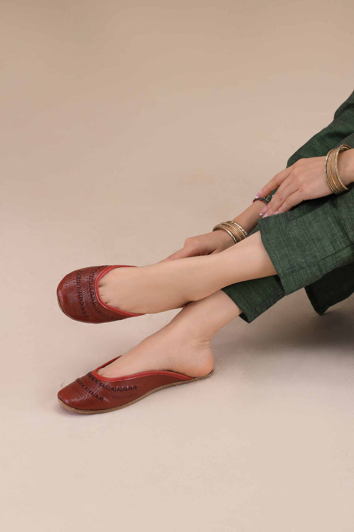 A stylish red handcrafted khussa featuring modern cut-work detailing and a sleek finish. Designed for comfort and durability, this pair is perfect for both daily wear and special occasions.