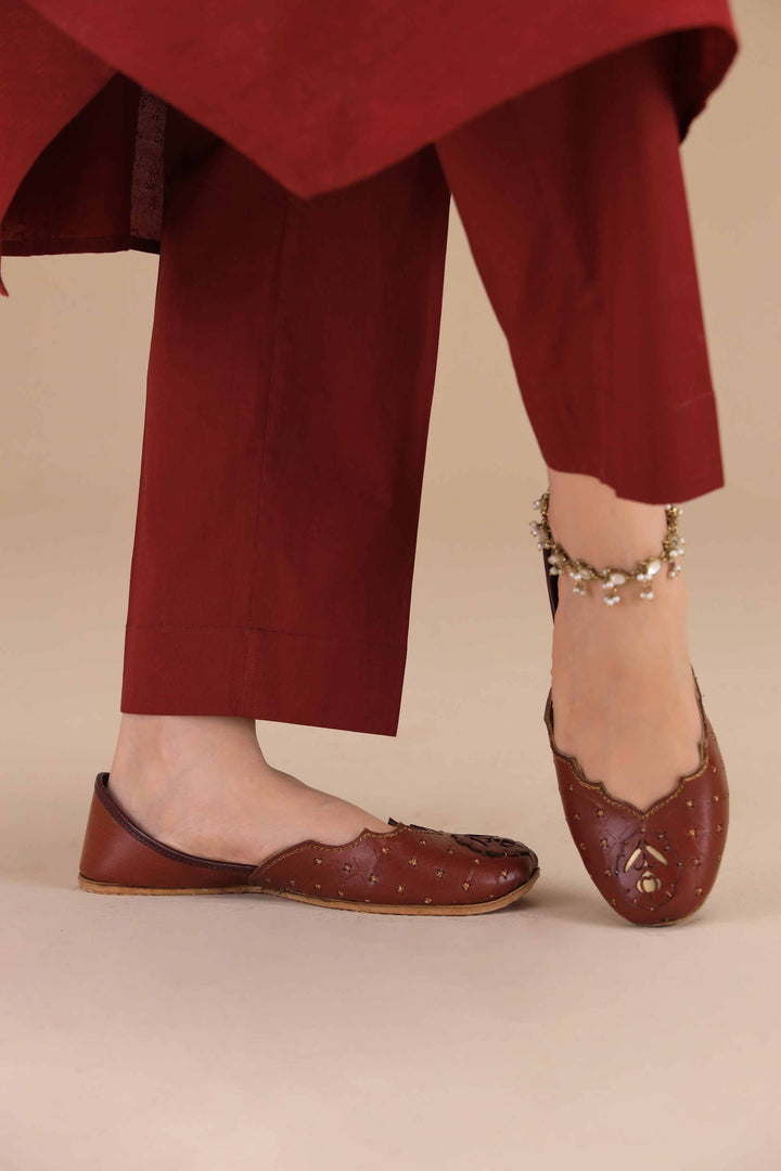 Maroon handcrafted khussa with elegant embossed detailing and unique front motif. A bold ethnic pick for weddings, festivals, or everyday desi flair.