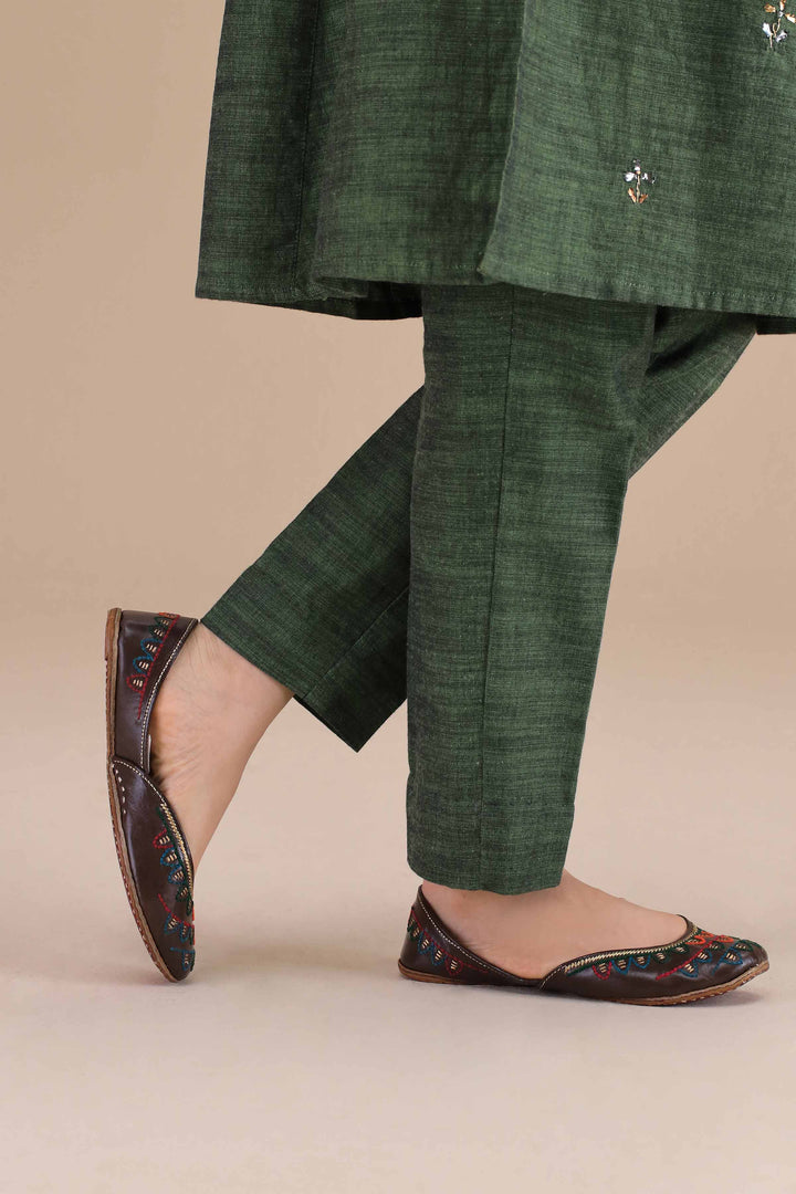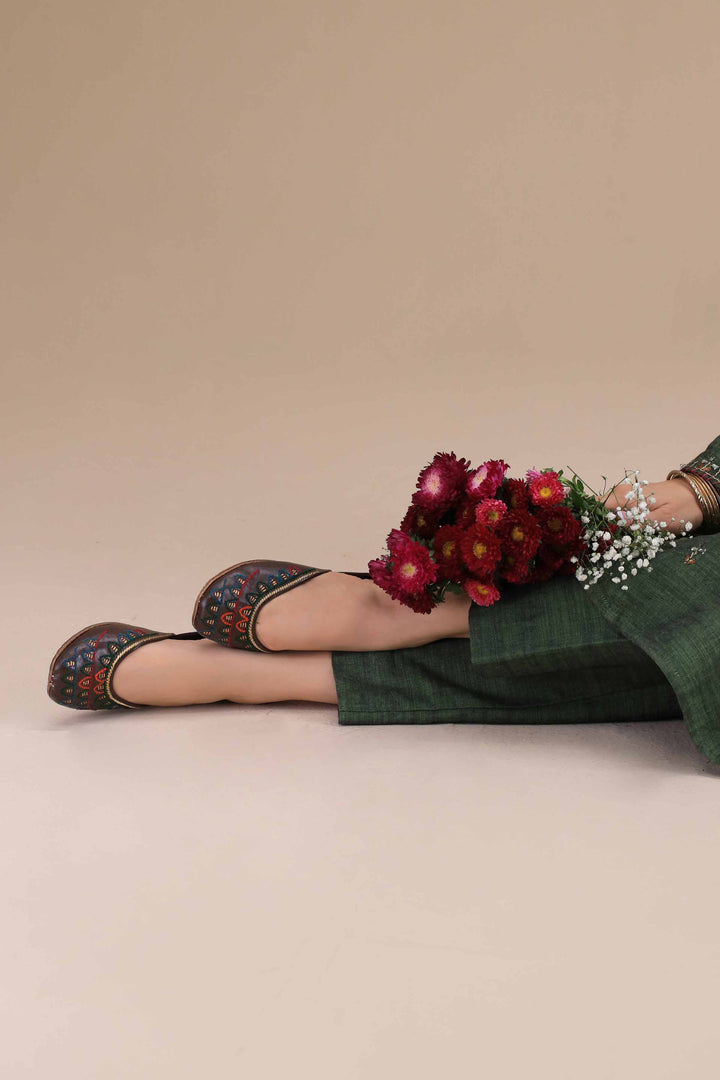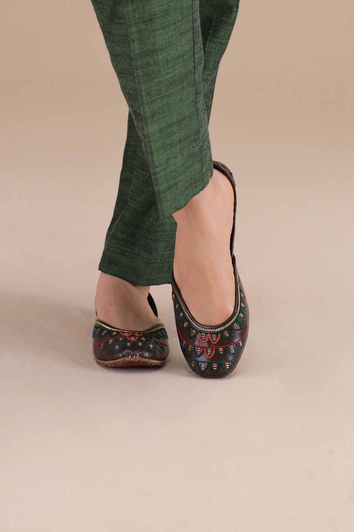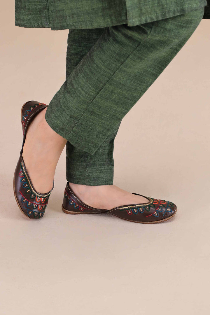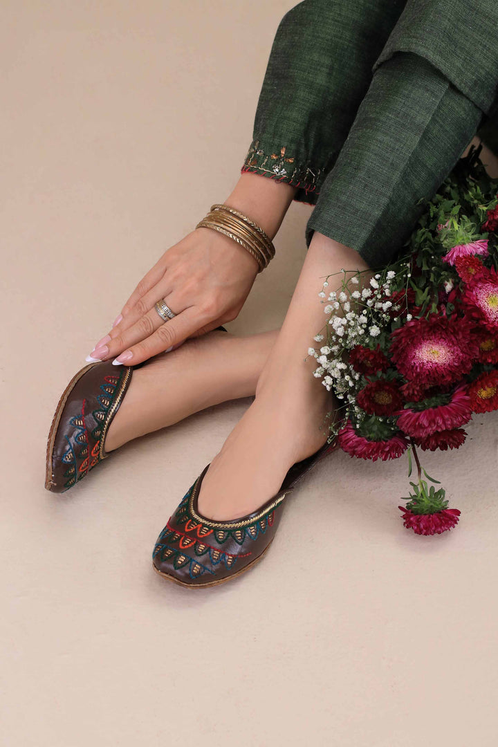 Handcrafted coffee-colored khussa featuring vibrant multicolor thread embroidery. A bold yet traditional pick that adds festive charm to any ethnic look.
